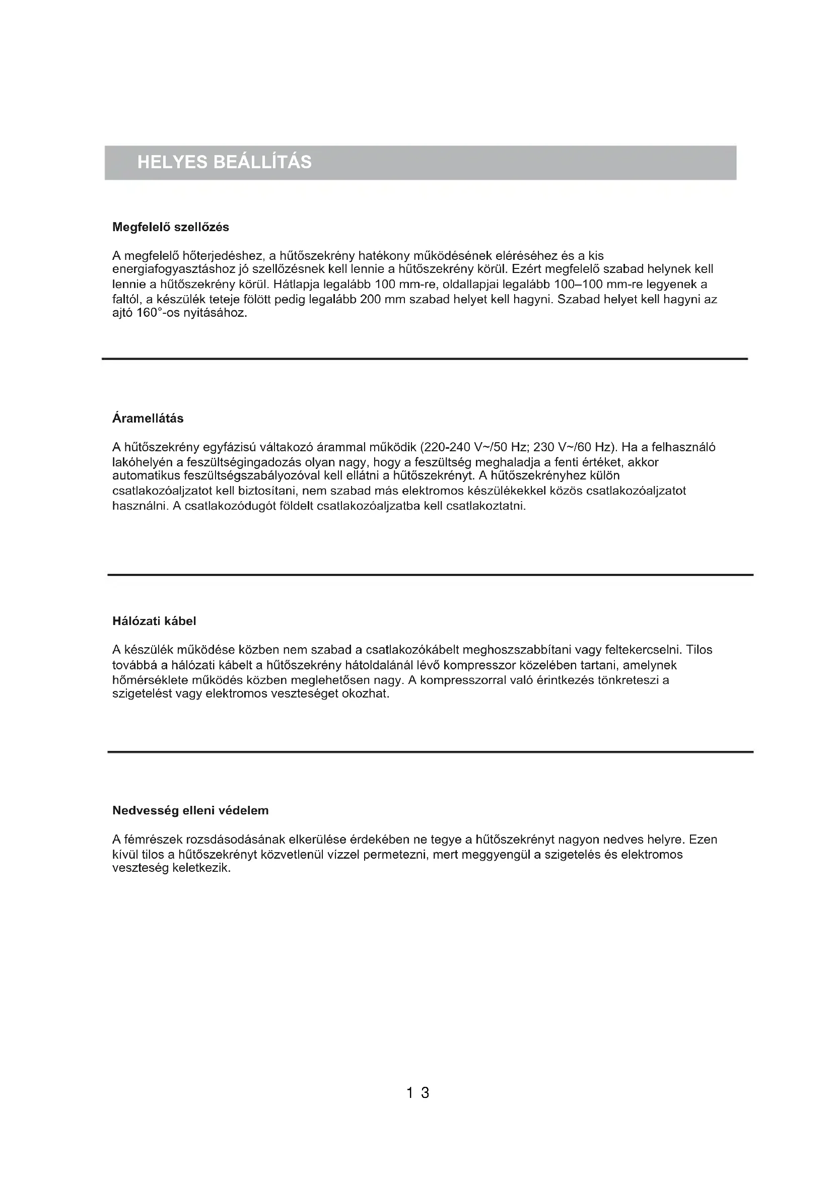 Hálózati kábel A készülék mködése közben nem szabad a csatlakozókábelt meghoszszabbítani vagy feltekercselni. Tilos továbbá a hálózati kábelt a htszekrény hátoldalánál lév kompresszor közelében tartani, amelynek hmérséklete mködés közben meglehetsen nagy. A kompresszorral való érintkezés tönkreteszi a szigetelést vagy elektromos veszteséget okozhat.