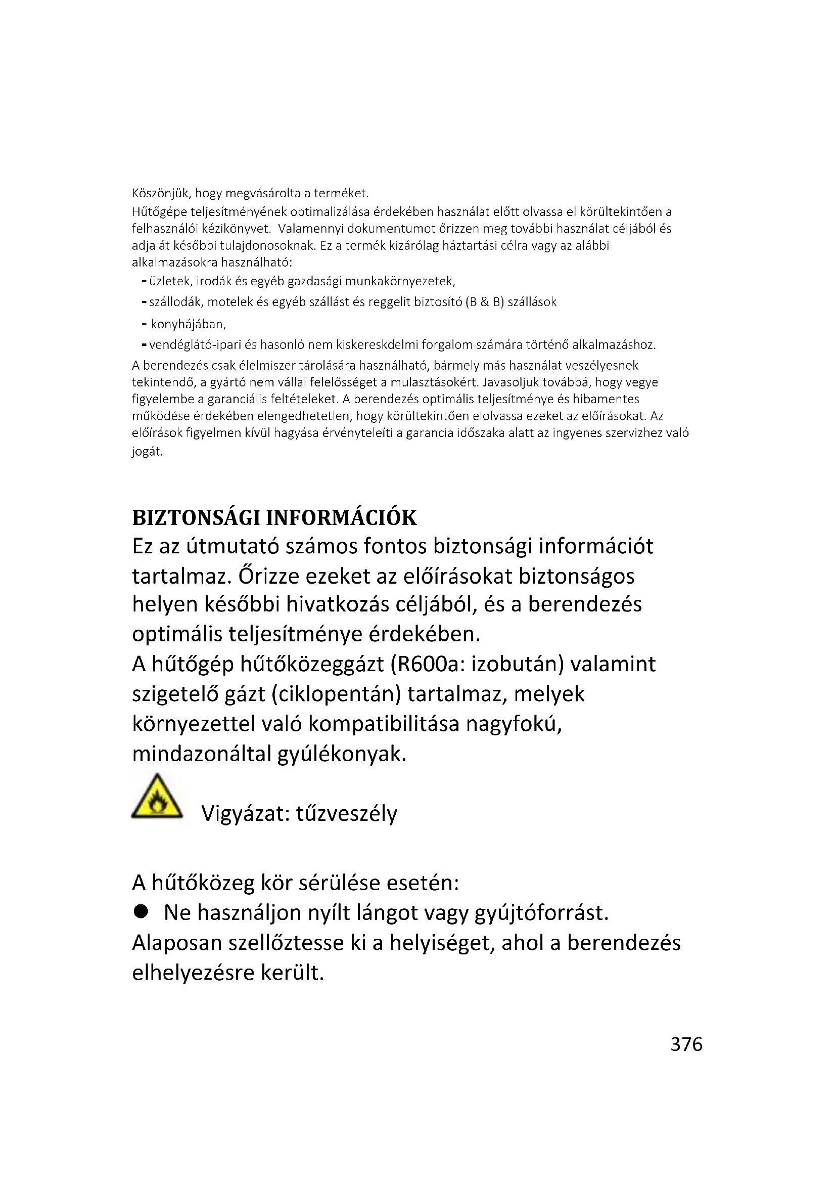 Ez az útmutató számos fontos biztonsági információt tartalmaz. Őrizze ezeket az előírásokat biztonságos helyen későbbi hivatkozás céljából, és a berendezés optimális teljesítménye érdekében. A hűtőgép hűtőközeggázt (R600a: izobután) valamint szigetelő gázt (ciklopentán) tartalmaz, melyek környezettel való kompatibilitása nagyfokú, mindazonáltal gyúlékonyak. Vigyázat: tűzveszély A hűtőközeg kör sérülése esetén: Ne használjon nyílt lángot vagy gyújtóforrást. Alaposan szellőztesse ki a helyiséget, ahol a berendezés elhelyezésre került. Átlagos üzemidő:377 FIGYELMEZTETÉS!