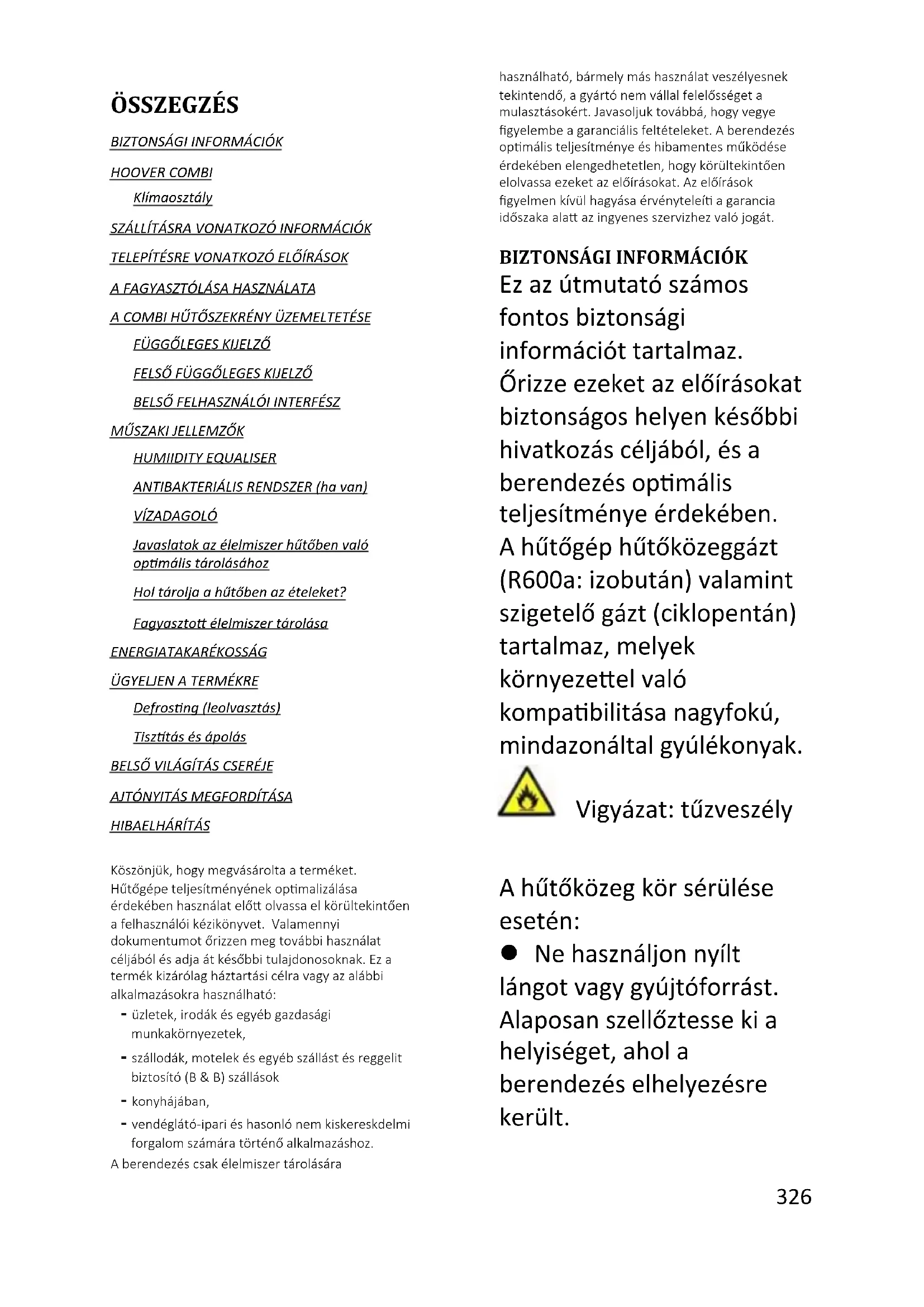 За допълнителна информация относно продукта, моля, консултирайте се с https://eprel.ec.europa.eu/ или сканирайте QR на енергийния етикет, доставен с уреда326 Magyar ÖSSZEGZÉS BIZTONSÁGI INFORMÁCIÓK HOOVER COMBI Klímaosztály SZÁLLÍTÁSRA VONATKOZÓ INFORMÁCIÓK TELEPÍTÉSRE VONATKOZÓ ELŐÍRÁSOK A FAGYASZTÓLÁSA HASZNÁLATA A COMBI HŰTŐSZEKRÉNY ÜZEMELTETÉSE FÜGGŐLEGES KIJELZŐ FELSŐ FÜGGŐLEGES KIJELZŐ BELSŐ FELHASZNÁLÓI INTERFÉSZ MŰSZAKI JELLEMZŐK HUMIIDITY EQUALISER ANTIBAKTERIÁLIS RENDSZER (ha van) VÍZADAGOLÓ Javaslatok az élelmiszer hűtőben való optimális tárolásához Hol tárolja a hűtőben az ételeket? Fagyasztott élelmiszer tárolása ENERGIATAKARÉKOSSÁG ÜGYELJEN A TERMÉKRE Defrosting (leolvasztás) Tisztítás és ápolás BELSŐ VILÁGÍTÁS CSERÉJE AJTÓNYITÁS MEGFORDÍTÁSA HIBAELHÁRÍTÁS Köszönjük, hogy megvásárolta a terméket. Hűtőgépe teljesítményének optimalizálása érdekében használat előtt olvassa el körültekintően a felhasználói kézikönyvet. Valamennyi dokumentumot őrizzen meg további használat céljából és adja át későbbi tulajdonosoknak. Ez a termék kizárólag háztartási célra vagy az alábbi alkalmazásokra használható: - üzletek, irodák és egyéb gazdasági munkakörnyezetek, - szállodák, motelek és egyéb szállást és reggelit biztosító (B & B) szállások - konyhájában, - vendéglátó-ipari és hasonló nem kiskereskdelmi forgalom számára történő alkalmazáshoz. A berendezés csak élelmiszer tárolására használható, bármely más használat veszélyesnek tekintendő, a gyártó nem vállal felelősséget a mulasztásokért. Javasoljuk továbbá, hogy vegye figyelembe a garanciális feltételeket. A berendezés optimális teljesítménye és hibamentes működése érdekében elengedhetetlen, hogy körültekintően elolvassa ezeket az előírásokat. Az előírások figyelmen kívül hagyása érvényteleíti a garancia időszaka alatt az ingyenes szervizhez való jogát.