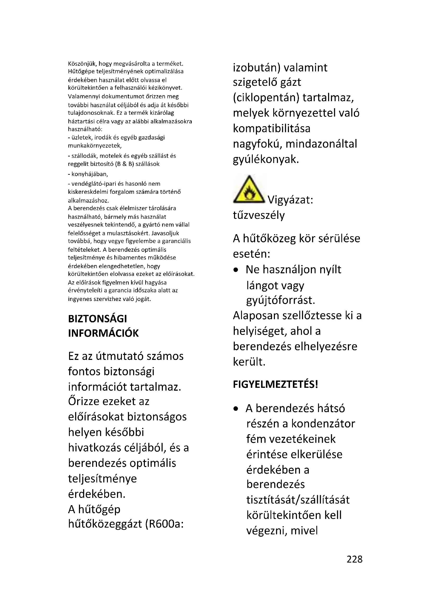 Ez az útmutató számos fontos biztonsági információt tartalmaz. Őrizze ezeket az előírásokat biztonságos helyen későbbi hivatkozás céljából, és a berendezés optimális teljesítménye érdekében. A hűtőgép hűtőközeggázt (R600a: izobután) valamint szigetelő gázt (ciklopentán) tartalmaz, melyek környezettel való kompatibilitása nagyfokú, mindazonáltal gyúlékonyak. Vigyázat: tűzveszély A hűtőközeg kör sérülése esetén: