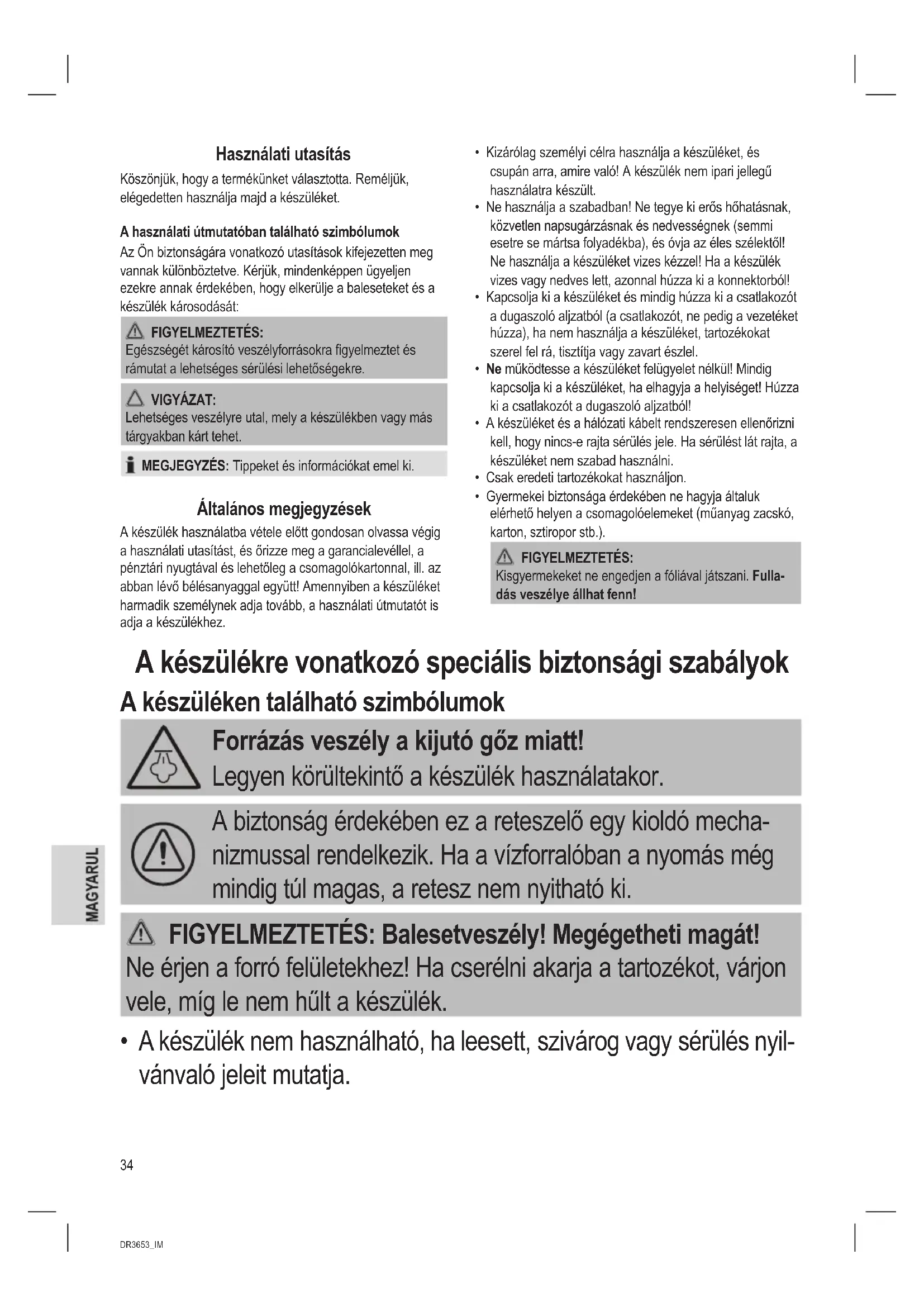 - A készülék nem használható, ha leesett, szivárog vagy sérülés nyil- vánvaló jeleit mutatja.35 DR3653_IM 10.02.16
