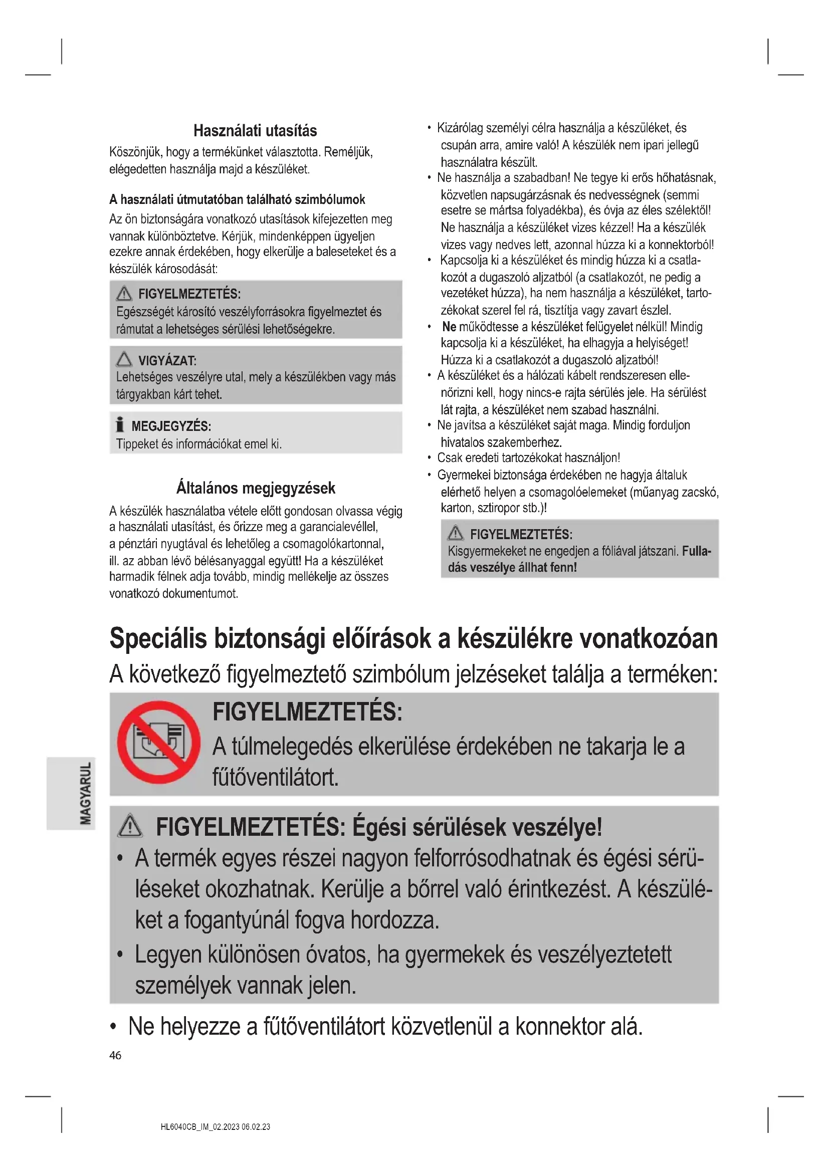 - Gyermekei biztonsága érdekében ne hagyja általuk elérhető helyen a csomagolóelemeket (műanyag zacskó, karton, sztiropor stb.)! FIGYELMEZTETÉS: Kisgyermekeket ne engedjen a fóliával játszani. Fulla- dás veszélye állhat fenn! Speciális biztonsági előírások a készülékre vonatkozóan A következő gyelmeztető szimbólum jelzéseket találja a terméken: FIGYELMEZTETÉS: A túlmelegedés elkerülése érdekében ne takarja le a fűtőventilátort. FIGYELMEZTETÉS: Égési sérülések veszélye!