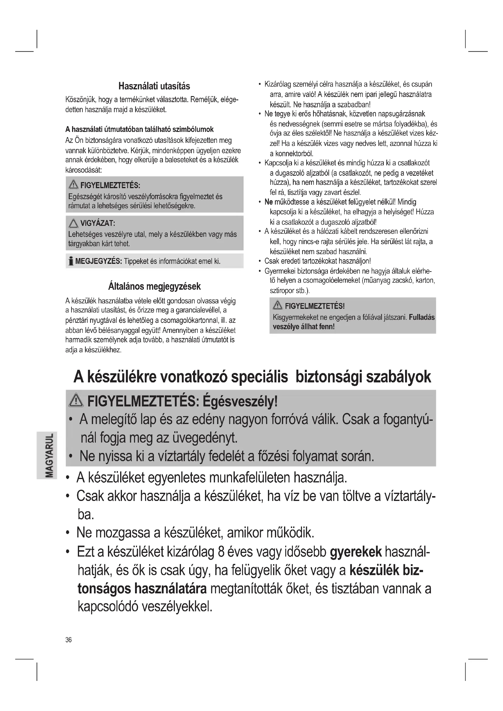 - Gyermekei biztonsága érdekében ne hagyja általuk elérhe- tő helyen a csomagolóelemeket (műanyag zacskó, karton, sztiropor stb.). FIGYELMEZTETÉS! Kisgyermekeket ne engedjen a fóliával játszani. Fulladás veszélye állhat fenn! Használati utasítás Köszönjük, hogy a termékünket választotta. Reméljük, elége- detten használja majd a készüléket. A használati útmutatóban található szimbólumok Az Ön biztonságára vonatkozó utasítások kifejezetten meg vannak különböztetve. Kérjük, mindenképpen ügyeljen ezekre annak érdekében, hogy elkerülje a baleseteket és a készülék károsodását: FIGYELMEZTETÉS: Egészségét károsító veszélyforrásokra gyelmeztet és rámutat a lehetséges sérülési lehetőségekre. VIGYÁZAT: Lehetséges veszélyre utal, mely a készülékben vagy más tárgyakban kárt tehet. MEGJEGYZÉS: Tippeket és információkat emel ki. Általános megjegyzések A készülék használatba vétele előtt gondosan olvassa végig a használati utasítást, és őrizze meg a garancialevéllel, a pénztári nyugtával és lehetőleg a csomagolókartonnal, ill. az abban lévő bélésanyaggal együtt! Amennyiben a készüléket harmadik személynek adja tovább, a használati útmutatót is adja a készülékhez. A készülékre vonatkozó speciális biztonsági szabályok FIGYELMEZTETÉS: Égésveszély!