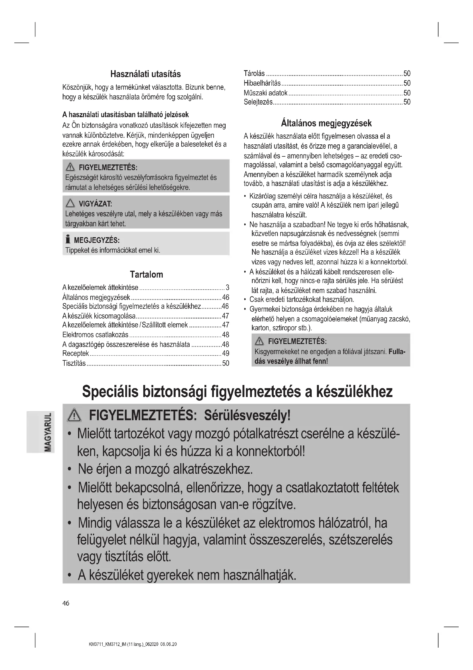 - Mindig a gyerekektől távol tárolja a készüléket, egy jól szellőztetett, száraz helyiségben. Hibaelhárítás Probléma Lehetséges ok Megoldás A készülék nem kapcsol- ható be vagy a működése leáll. A készülék nincs áramellátás alatt. Ellenőrizze a hálózati aljzatot egy másik készü- lékkel. Csatlakoztassa megfelelően a tápcsatlakozót. Ellenőrizze a biztosítékot. Probléma Lehetséges ok Megoldás A készülék nem kapcsol- ható be vagy a működése leáll. A forgókar nem a legalsó pozícióban van rögzítve. A biztonsági kapcsoló megakadályozza a működést. Nyomja fel egyszerre a vezérlőkart és a forgókart, amíg a kar nem rögzül. A készülék meghibásodott. Lépjen kapcso- latba a szervizköz- ponttal vagy egy szakemberrel. Műszaki adatok Modell: ....................................................... KM 3711 / KM3712 Áramellátás: ............................................. 220 - 240 V~, 50 Hz Teljesítményfelvétel: ....................................................1100 W Védelmi osztály: ................................................................... Nettó súly: ..............................................................kb. 3,85 kg A műszaki és kivitelezési módosítások jogát a folyamatos termékfejlesztés miatt fenntartjuk. Ezt a készüléket az Európa Tanács minden vonatkozó ak- tuális irányelve szerint (pl. elektromágnesesség-elviselő ké- pesség vagy kisfeszültség-elviselő képesség) ellenőriztük, és a legújabb biztonságtechnikai előírások szerint készült. Selejtezés A „kuka” piktogram jelentése Kímélje környezetünket, az elektromos készü- lékek nem a háztartási szemétbe valók! Használja az elektromos készülékek ártalmat- lanítására kijelölt gyűjtőhelyeket, ott adja le azokat az elektromos készülékeit, amelyeket többé már nem kíván használni! Ezzel segítséget nyújt ahhoz, hogy elkerülhetők legyenek azok a hatások, amelyeket a helytelen „szemétre dobás“ gyakorolhat a környezetre és az emberi egészségre. Ezzel hozzájárul az újrahasznosításhoz, a recyclinghoz és a kiöregedett elektromos és elektronikus készülékek értékesí- tésének egyéb formáihoz. Az önkormányzatoknál vagy a polgármesteri hivatalokban tájékoztatást kaphat arról, hogy hova viheti a kiselejtezett készülékeket.KM3711_KM3712_IM (11 lang.)_062020 08.06.20