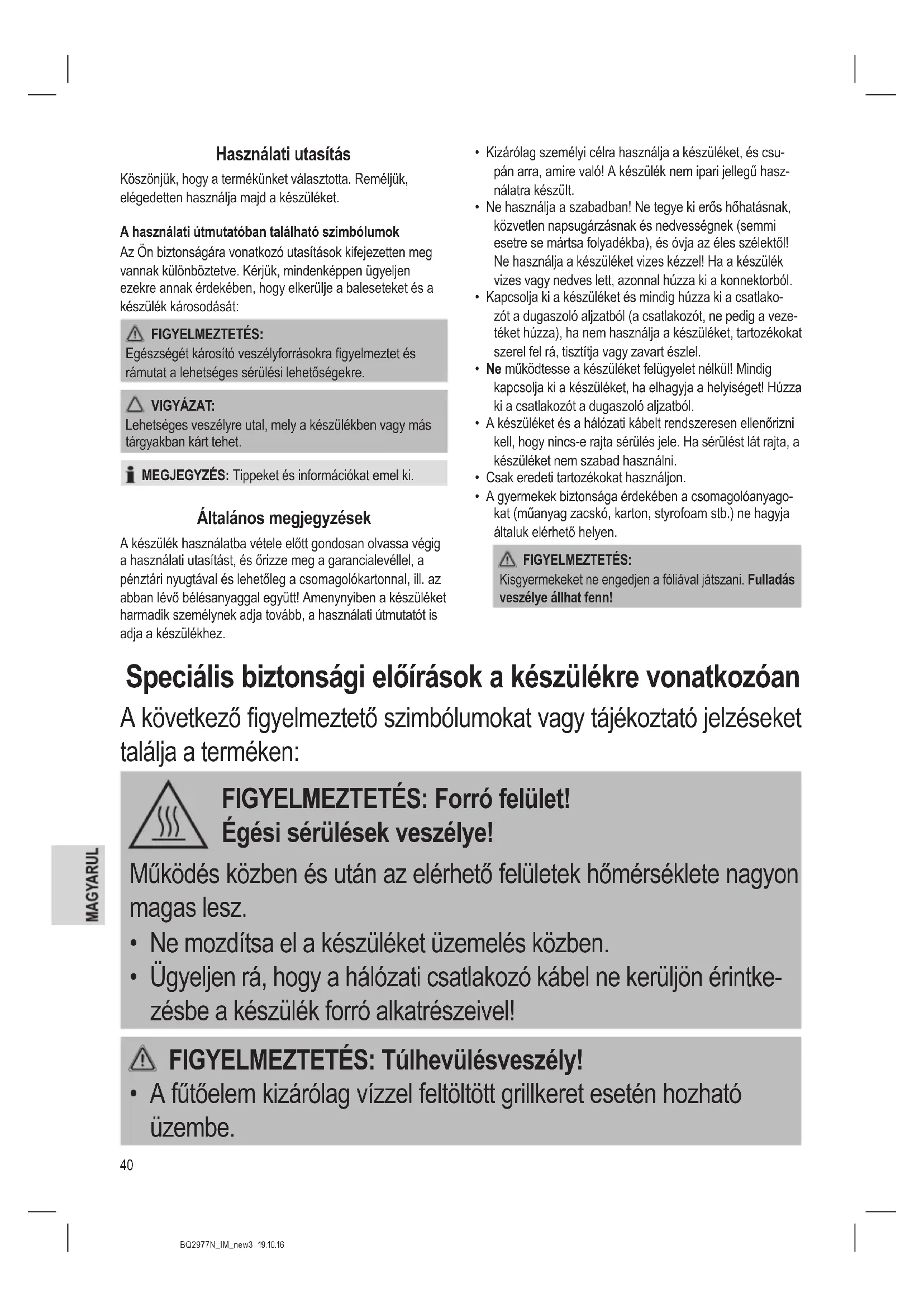 Usuwanie Znaczenie symbolu „Pojemnik na śmieci“ Należy zadbać o środowisko i nie wyrzucać urządzeń elektrycznych razem z odpadami gospodarstwa domowego. Stare lub uszkodzone urządzenia elektryczne należy odstawić do miejskich punktów zbiórki. Prosimy unikać potencjalnych zagrożeń dla zdrowia i środo- wiska poprzez nieprawidłowe metody utylizacji odpadów. Przyczyniasz się do recyklingu i innych form utylizacji zuży- tych urządzeń elektrycznych i elektronicznych. Informacje na temat punktów zbiórki znajdują się na terenie danego miasta.40 BQ2977N_IM_new3 19.10.16 Használati utasítás Köszönjük, hogy a termékünket választotta. Reméljük, elégedetten használja majd a készüléket. A használati útmutatóban található szimbólumok Az Ön biztonságára vonatkozó utasítások kifejezetten meg vannak különböztetve. Kérjük, mindenképpen ügyeljen ezekre annak érdekében, hogy elkerülje a baleseteket és a készülék károsodását: FIGYELMEZTETÉS: Egészségét károsító veszélyforrásokra gyelmeztet és rámutat a lehetséges sérülési lehetőségekre. VIGYÁZAT: Lehetséges veszélyre utal, mely a készülékben vagy más tárgyakban kárt tehet. MEGJEGYZÉS: Tippeket és információkat emel ki. Általános megjegyzések A készülék használatba vétele előtt gondosan olvassa végig a használati utasítást, és őrizze meg a garancialevéllel, a pénztári nyugtával és lehetőleg a csomagolókartonnal, ill. az abban lévő bélésanyaggal együtt! Amenynyiben a készüléket harmadik személynek adja tovább, a használati útmutatót is adja a készülékhez.