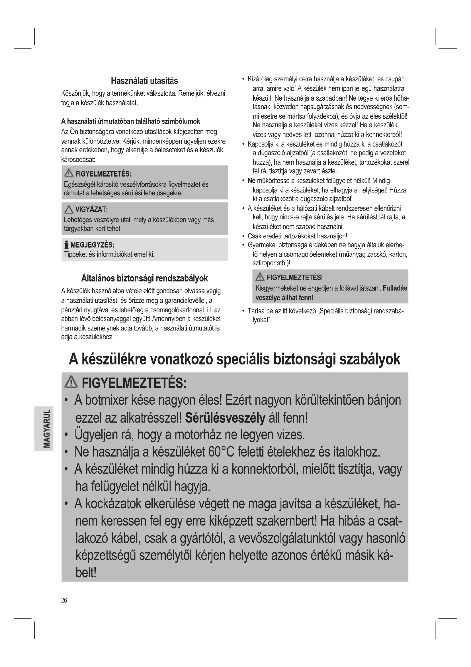 - A botmixer kése nagyon éles! Sérülésveszély áll fenn! VIGYÁZAT: