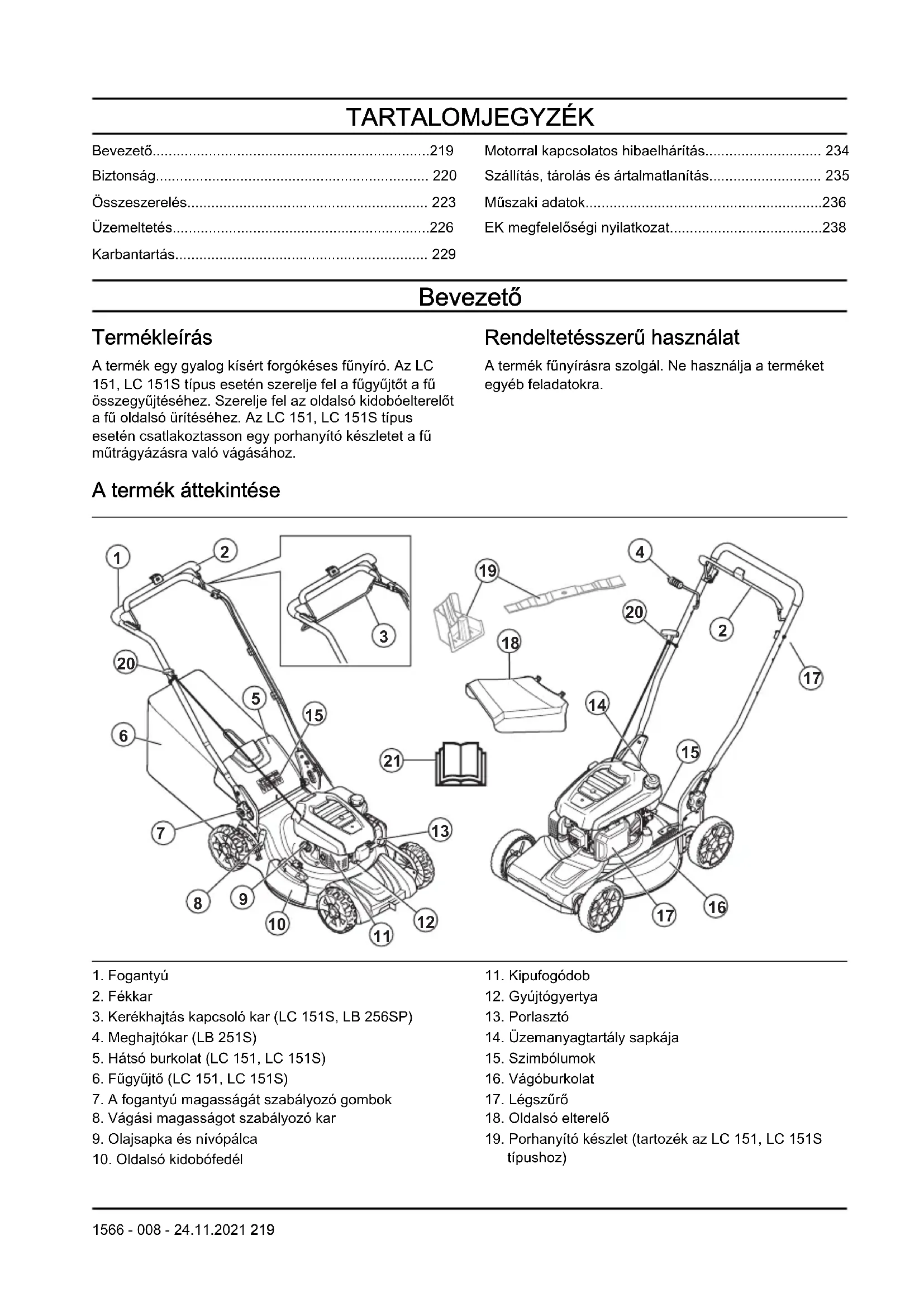 - EK megfelelőségi nyilatkozat Bevezető Termékleírás A termék egy gyalog kísért forgókéses fűnyíró. Az LC 151, LC 151S típus esetén szerelje fel a fűgyűjtőt a fű összegyűjtéséhez. Szerelje fel az oldalsó kidobóelterelőt a fű oldalsó ürítéséhez. Az LC 151, LC 151S típus esetén csatlakoztasson egy porhanyító készletet a fű műtrágyázásra való vágásához. Rendeltetésszerű használat A termék fűnyírásra szolgál. Ne használja a terméket egyéb feladatokra. A termék áttekintése p. 238