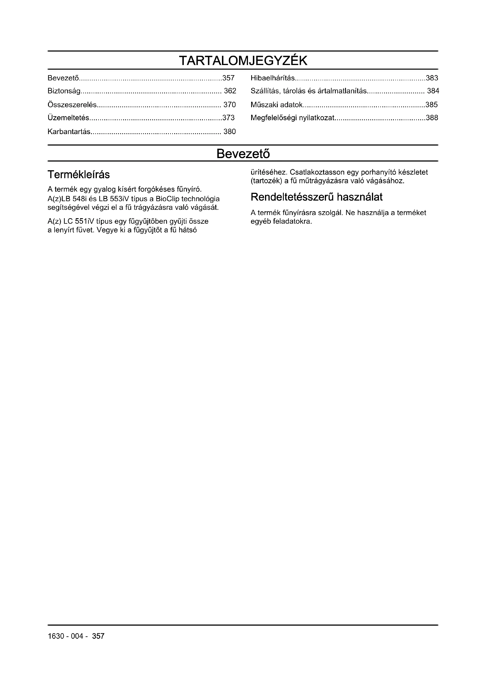 - Megfelelőségi nyilatkozat Bevezető Termékleírás A termék egy gyalog kísért forgókéses fűnyíró. A(z)LB 548i és LB553iV típus a BioClip technológia segítségével végzi el a fű trágyázásra való vágását. A(z) LC551iV típus egy fűgyűjtőben gyűjti össze a lenyírt füvet. Vegye ki a fűgyűjtőt a fű hátsó ürítéséhez. Csatlakoztasson egy porhanyító készletet (tartozék) a fű műtrágyázásra való vágásához. Rendeltetésszerű használat A termék fűnyírásra szolgál. Ne használja a terméket egyéb feladatokra. 1630 - 004 - 357A(z) (LB548i, LC551iV) áttekintése LB 548i LC 551iV p. 388