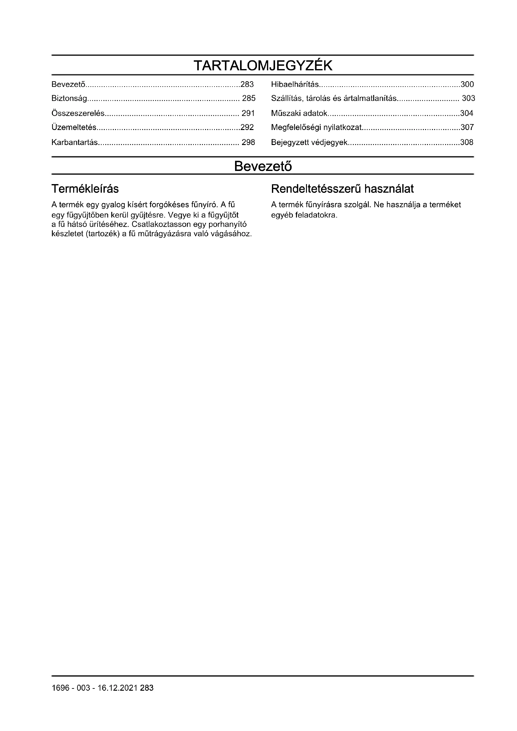 - Bejegyzett védjegyek Bevezető Termékleírás A termék egy gyalog kísért forgókéses fűnyíró. A fű egy fűgyűjtőben kerül gyűjtésre. Vegye ki a fűgyűjtőt a fű hátsó ürítéséhez. Csatlakoztasson egy porhanyító készletet (tartozék) a fű műtrágyázásra való vágásához. Rendeltetésszerű használat A termék fűnyírásra szolgál. Ne használja a terméket egyéb feladatokra. 1696 - 003 - 16.12.2021 283A termék áttekintése p. 308