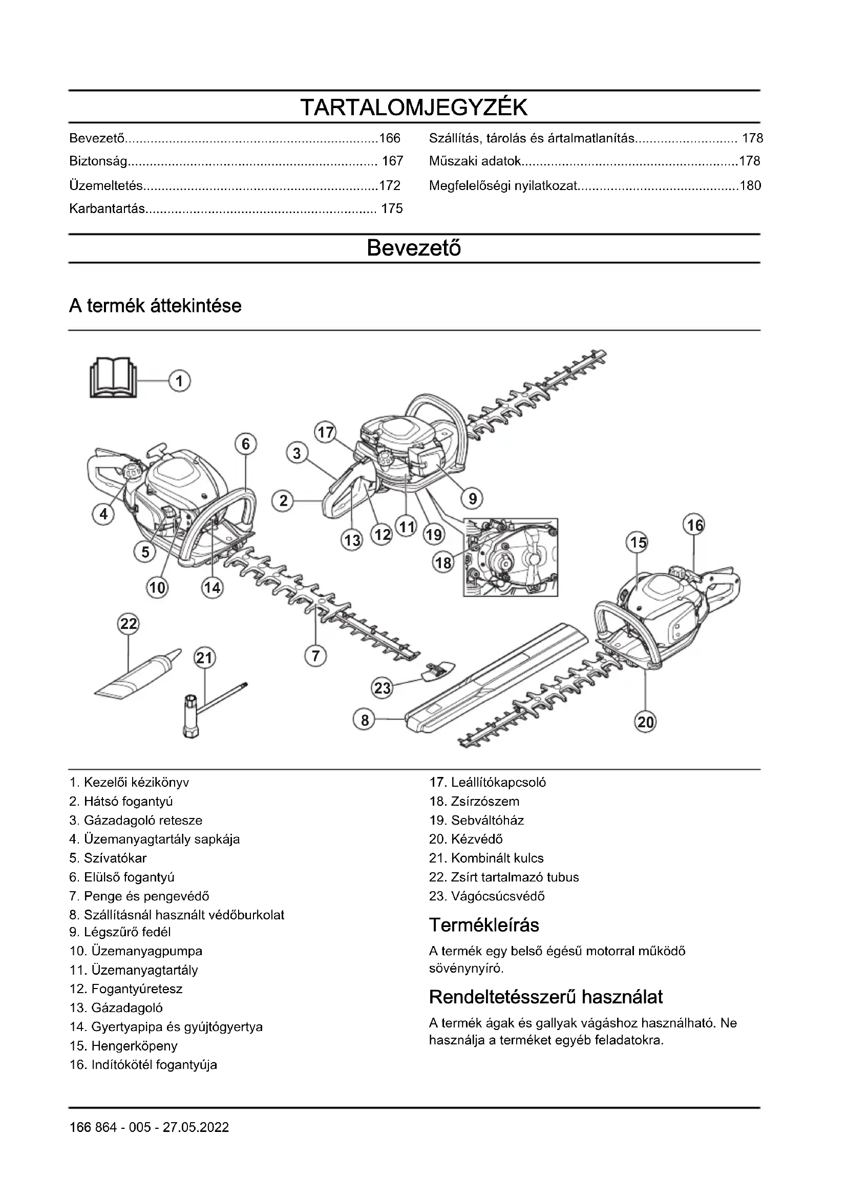 Termékleírás A termék egy belső égésű motorral működő sövénynyíró. Rendeltetésszerű használat A termék ágak és gallyak vágáshoz használható. Ne használja a terméket egyéb feladatokra. 166 864 - 005 - 27.05.2022A terméken található jelzések Stop. Körültekintően járjon el, és megfelelően használja a terméket. A gép a kezelő és mások súlyos sérülését és halálát is okozhatja. Olvassa el figyelmesen a használati utasítást, és győződjön meg arról, hogy megértette azt, mielőtt a terméket használatba veszi. Használjon jóváhagyott fülvédőt és védőszemüveget. Használjon jóváhagyott védőkesztyűt. Használjon csúszásálló munkavédelmi bakancsot. Alapjárat-beállító csavar. Magas fordulatszám tűje. Alacsony fordulatszám tűje. A 2000/14/EK számú európai irányelvnek és New South Wales „Környezetben történő munkavégzés (zajszabályozás) szabályozása, 2017” irányelvének megfelelő környezeti zajszennyezés. A zajszennyezésre vonatkozó adatok a gép címkéjén és a Műszaki adatok című fejezetben találhatók. Ez a termék megfelel a vonatkozó EK- irányelveknek. A termék megfelel a vonatkozó egyesült királyságbeli irányelveknek. ééééhhxxxx A típustáblán megtalálható a sorozat- szám. éééé a gyártási év és hh pedig a gyártási hét. Megjegyzés: A terméken szereplő többi jel/címke egyes piacok specifikus vizsgáztatási követelményeire vonatkozik. Euro V. kibocsátási norma FIGYELMEZTETÉS: A motor módosítása érvényteleníti a termékre vonatkozó európai uniós típusjóváhagyást. Biztonság Biztonsági meghatározások A figyelmeztetések, óvintézkedések és megjegyzések a használati utasítás kiemelten fontos részeire hívják fel a figyelmet. FIGYELMEZTETÉS: Akkor használatos, ha a kézikönyv utasításainak be nem tartása esetén fennáll a kezelő vagy a közelben tartózkodók sérülésének vagy halálának veszélye. VIGYÁZAT: Akkor használatos, ha a kézikönyv utasításainak be nem tartása esetén fennáll a vagyoni kár, illetve a termék vagy a környező terület károsodásának veszélye. Megjegyzés: További információt biztosít az adott helyzetben szükséges tennivalókról. Általános biztonsági utasítások FIGYELMEZTETÉS: A termék használata előtt olvassa el az alábbi figyelmeztetéseket.