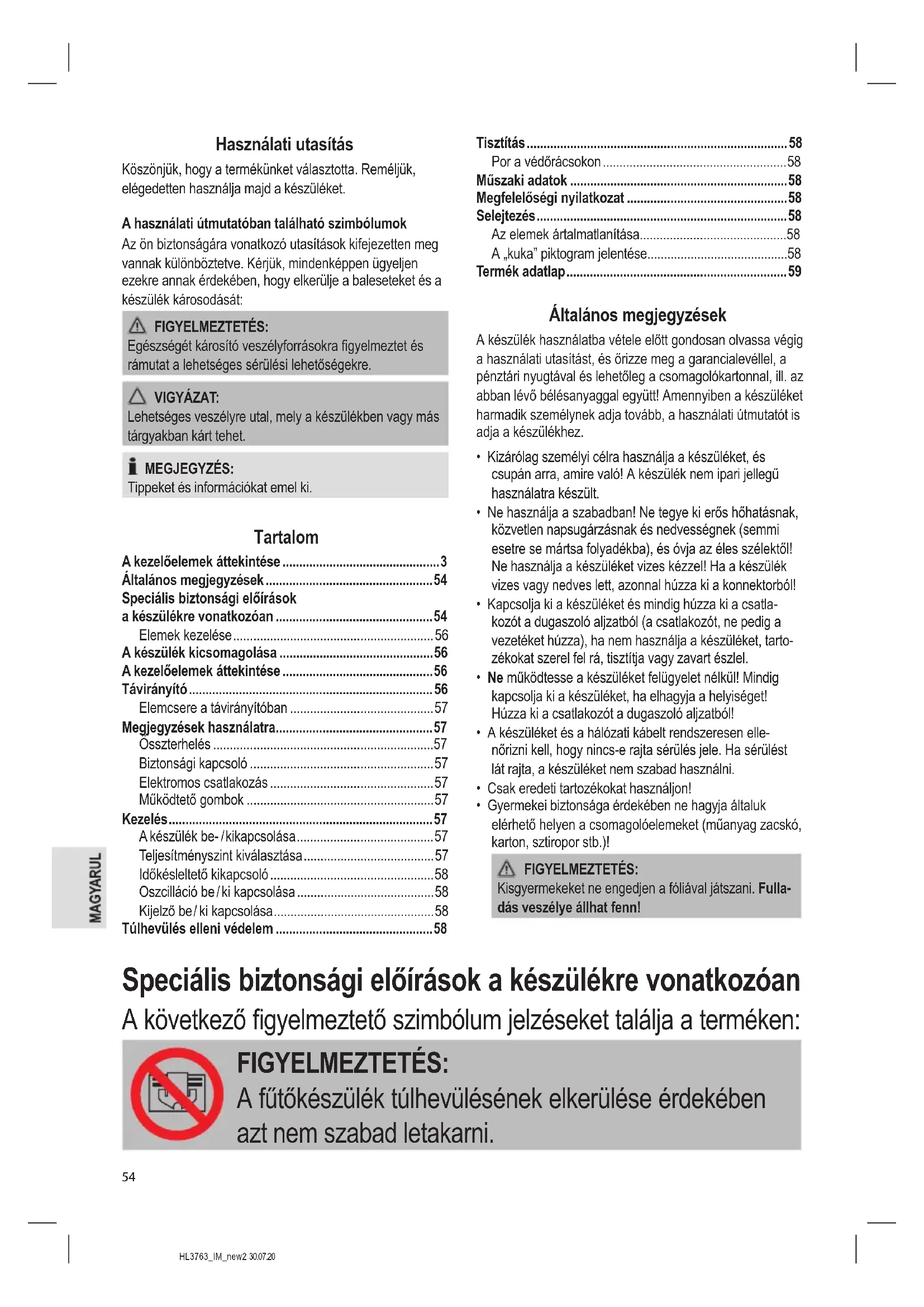 - Gyermekei biztonsága érdekében ne hagyja általuk elérhető helyen a csomagolóelemeket (műanyag zacskó, karton, sztiropor stb.)! FIGYELMEZTETÉS: Kisgyermekeket ne engedjen a fóliával játszani. Fulla- dás veszélye állhat fenn! Speciális biztonsági előírások a készülékre vonatkozóan A következő gyelmeztető szimbólum jelzéseket találja a terméken: FIGYELMEZTETÉS: A fűtőkészülék túlhevülésének elkerülése érdekében azt nem szabad letakarni.HL3763_IM_new2 30.07.20