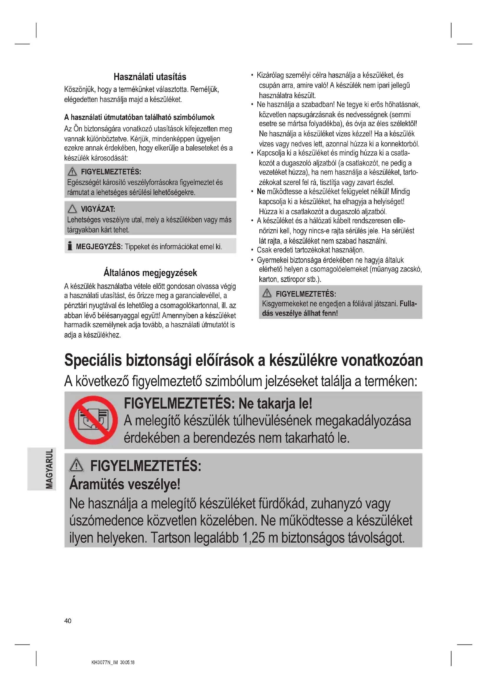 - Gyermekei biztonsága érdekében ne hagyja általuk elérhető helyen a csomagolóelemeket (műanyag zacskó, karton, sztiropor stb.). FIGYELMEZTETÉS: Kisgyermekeket ne engedjen a fóliával játszani. Fulla- dás veszélye állhat fenn! Speciális biztonsági előírások a készülékre vonatkozóan A következő gyelmeztető szimbólum jelzéseket találja a terméken: FIGYELMEZTETÉS: Ne takarja le! A melegítő készülék túlhevülésének megakadályozása érdekében a berendezés nem takarható le. FIGYELMEZTETÉS: Áramütés veszélye! Ne használja a melegítő készüléket fürdőkád, zuhanyzó vagy úszómedence közvetlen közelében. Ne működtesse a készüléket ilyen helyeken. Tartson legalább 1,25 m biztonságos távolságot.KH3077N_IM 30.05.18