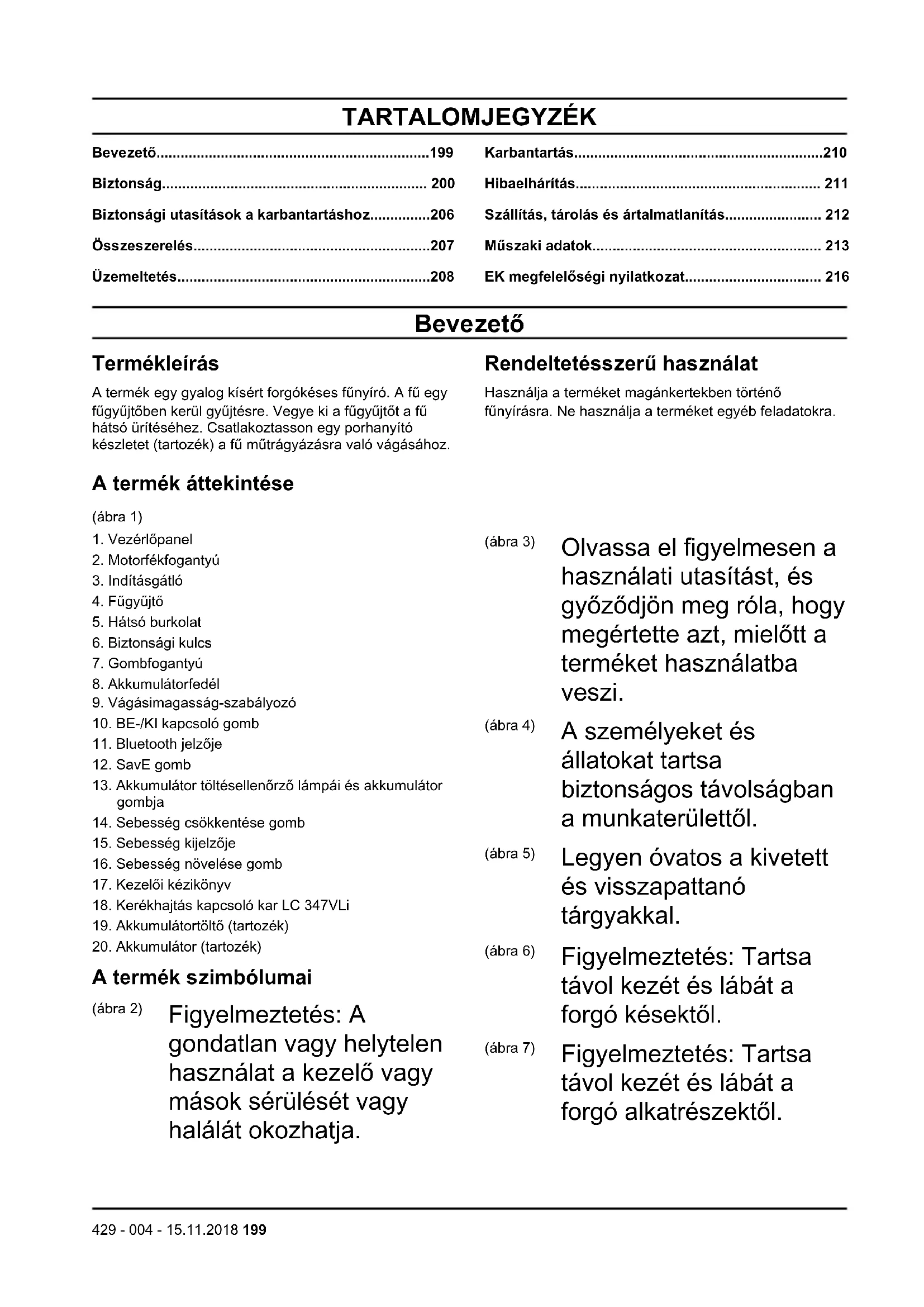 - EK megfelelőségi nyilatkozat Bevezető Termékleírás A termék egy gyalog kísért forgókéses fűnyíró. A fű egy fűgyűjtőben kerül gyűjtésre. Vegye ki a fűgyűjtőt a fű hátsó ürítéséhez. Csatlakoztasson egy porhanyító készletet (tartozék) a fű műtrágyázásra való vágásához. Rendeltetésszerű használat Használja a terméket magánkertekben történő fűnyírásra. Ne használja a terméket egyéb feladatokra. A termék áttekintése (ábra 1) p. 216
