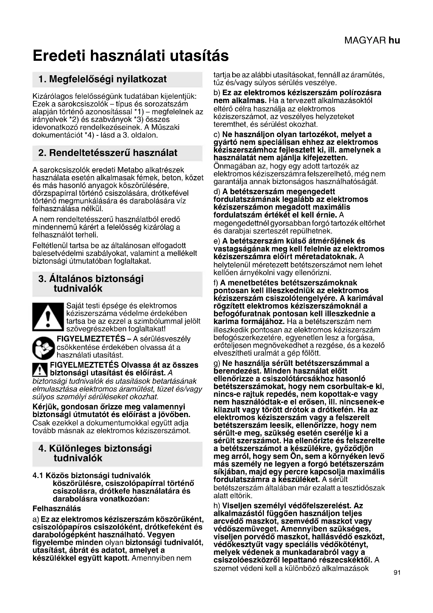 Eredeti használati utasítás Kizárólagos felelősségünk tudatában kijelentjük: Ezek a sarokcsiszolók – típus és sorozatszám alapján történő azonosítással *1) – megfelelnek az irányelvek *2) és szabványok *3) összes idevonatkozó rendelkezéseinek. A Műszaki dokumentációt *4) - lásd a 3. oldalon. A sarokcsiszolók eredeti Metabo alkatrészek használata esetén alkalmasak fémek, beton, kőzet és más hasonló anyagok köszörülésére, dörzspapírral történő csiszolására, drótkefével történő megmunkálására és darabolására víz felhasználása nélkül. A nem rendeltetésszerű használatból eredő mindennemű kárért a felelősség kizárólag a felhasználót terheli. Feltétlenül tartsa be az általánosan elfogadott balesetvédelmi szabályokat, valamint a mellékelt biztonsági útmutatóban foglaltakat. Saját testi épsége és elektromos kéziszerszáma védelme érdekében tartsa be az ezzel a szimbólummal jelölt szövegrészekben foglaltakat! FIGYELMEZTETÉS – A sérülésveszély csökkentése érdekében olvassa át a használati utasítást. FIGYELMEZTETÉS Olvassa át az összes biztonsági utasítást és előírást. A biztonsági tudnivalók és utasítások betartásának elmulasztása elektromos áramütést, tüzet és/vagy súlyos személyi sérüléseket okozhat. Kérjük, gondosan őrizze meg valamennyi biztonsági útmutatót és előírást a jövőben. Csak ezekkel a dokumentumokkal együtt adja tovább másnak az elektromos kéziszerszámot.