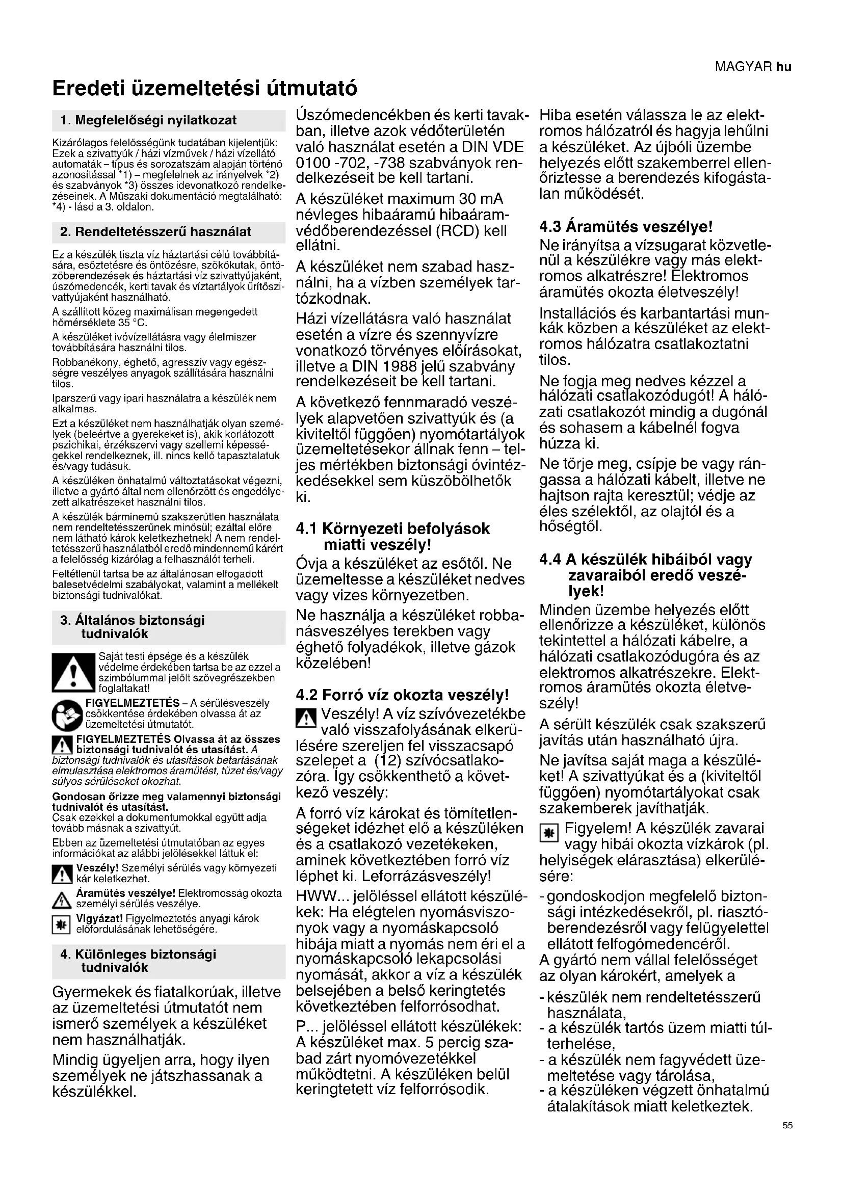 Eredeti üzemeltetési útmutató Kizárólagos felelősségünk tudatában kijelentjük: Ezek a szivattyúk / házi vízművek / házi vízellátó automaták – típus és sorozatszám alapján történő azonosítással *1) – megfelelnek az irányelvek *2) és szabványok *3) összes idevonatkozó rendelke- zéseinek. A Műszaki dokumentáció megtalálható: *4) - lásd a 3. oldalon. Ez a készülék tiszta víz háztartási célú továbbítá- sára, esőztetésre és öntözésre, szökőkutak, öntö- zőberendezések és háztartási víz szivattyújaként, úszómedencék, kerti tavak és víztartályok ürítőszi- vattyújaként használható. A szállított közeg maximálisan megengedett hőmérséklete 35 °C. A készüléket ivóvízellátásra vagy élelmiszer továbbítására használni tilos. Robbanékony, éghető, agresszív vagy egész- ségre veszélyes anyagok szállítására használni tilos. Iparszerű vagy ipari használatra a készülék nem alkalmas. Ezt a készüléket nem használhatják olyan szemé- lyek (beleértve a gyerekeket is), akik korlátozott pszichikai, érzékszervi vagy szellemi képessé- gekkel rendelkeznek, ill. nincs kellő tapasztalatuk és/vagy tudásuk. A készüléken önhatalmú változtatásokat végezni, illetve a gyártó által nem ellenőrzött és engedélye- zett alkatrészeket használni tilos. A készülék bárminemű szakszerűtlen használata nem rendeltetésszerűnek minősül; ezáltal előre nem látható károk keletkezhetnek! A nem rendel- tetésszerű használatból eredő mindennemű kárért a felelősség kizárólag a felhasználót terheli. Feltétlenül tartsa be az általánosan elfogadott balesetvédelmi szabályokat, valamint a mellékelt biztonsági tudnivalókat. Saját testi épsége és a készülék védelme érdekében tartsa be az ezzel a szimbólummal jelölt szövegrészekben foglaltakat! FIGYELMEZTETÉS – A sérülésveszély csökkentése érdekében olvassa át az üzemeltetési útmutatót. FIGYELMEZTETÉS Olvassa át az összes biztonsági tudnivalót és utasítást. A biztonsági tudnivalók és utasítások betartásának elmulasztása elektromos áramütést, tüzet és/vagy súlyos sérüléseket okozhat. Gondosan őrizze meg valamennyi biztonsági tudnivalót és utasítást. Csak ezekkel a dokumentumokkal együtt adja tovább másnak a szivattyút. Ebben az üzemeltetési útmutatóban az egyes információkat az alábbi jelölésekkel láttuk el: Veszély! Személyi sérülés vagy környezeti kár keletkezhet. Áramütés veszélye! Elektromosság okozta személyi sérülés veszélye. Vigyázat! Figyelmeztetés anyagi károk előfordulásának lehetőségére. Gyermekek és fiatalkorúak, illetve az üzemeltetési útmutatót nem ismerő személyek a készüléket nem használhatják. Mindig ügyeljen arra, hogy ilyen személyek ne játszhassanak a készülékkel. Úszómedencékben és kerti tavak- ban, illetve azok védőterületén való használat esetén a DIN VDE 0100 -702, -738 szabványok ren- delkezéseit be kell tartani. A készüléket maximum 30 mA névleges hibaáramú hibaáram- védőberendezéssel (RCD) kell ellátni. A készüléket nem szabad hasz- nálni, ha a vízben személyek tar- tózkodnak. Házi vízellátásra való használat esetén a vízre és szennyvízre vonatkozó törvényes előírásokat, illetve a DIN 1988 jelű szabvány rendelkezéseit be kell tartani. A következő fennmaradó veszé- lyek alapvetően szivattyúk és (a kiviteltől függően) nyomótartályok üzemeltetésekor állnak fenn – tel- jes mértékben biztonsági óvintéz- kedésekkel sem küszöbölhetők ki.