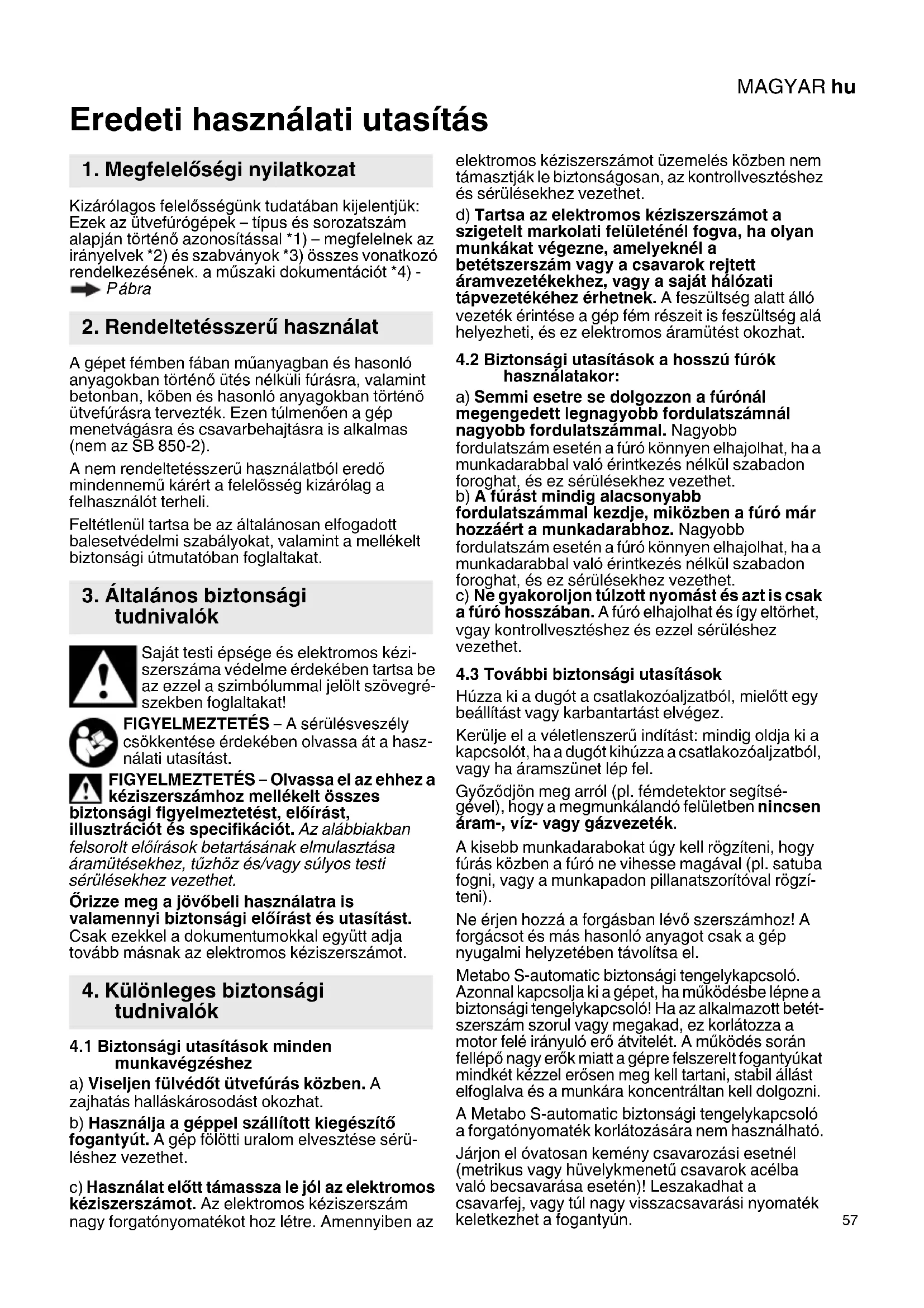 ábra A gépet fémben fában műanyagban és hasonló anyagokban történő ütés nélküli fúrásra, valamint betonban, kőben és hasonló anyagokban történő ütvefúrásra tervezték. Ezen túlmenően a gép menetvágásra és csavarbehajtásra is alkalmas (nem az SB 850-2). A nem rendeltetésszerű használatból eredő mindennemű kárért a felelősség kizárólag a felhasználót terheli. Feltétlenül tartsa be az általánosan elfogadott balesetvédelmi szabályokat, valamint a mellékelt biztonsági útmutatóban foglaltakat. Saját testi épsége és elektromos kézi- szerszáma védelme érdekében tartsa be az ezzel a szimbólummal jelölt szövegré- szekben foglaltakat! FIGYELMEZTETÉS – A sérülésveszély csökkentése érdekében olvassa át a hasz- nálati utasítást. FIGYELMEZTETÉS – Olvassa el az ehhez a kéziszerszámhoz mellékelt összes biztonsági figyelmeztetést, előírást, illusztrációt és specifikációt. Az alábbiakban felsorolt előírások betartásának elmulasztása áramütésekhez, tűzhöz és/vagy súlyos testi sérülésekhez vezethet. Őrizze meg a jövőbeli használatra is valamennyi biztonsági előírást és utasítást. Csak ezekkel a dokumentumokkal együtt adja tovább másnak az elektromos kéziszerszámot.