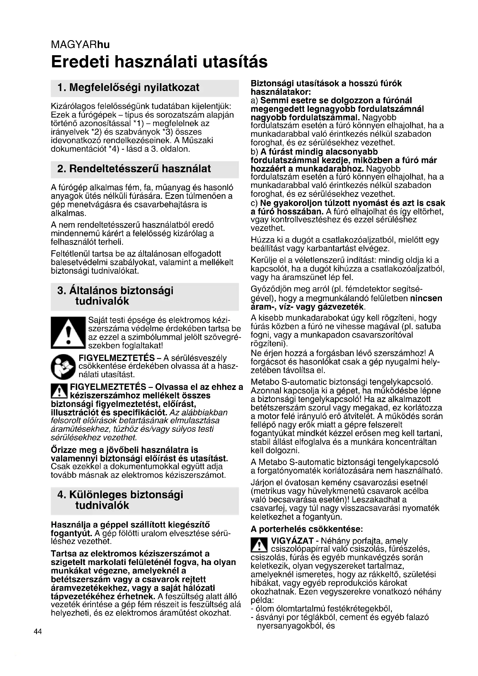 Eredeti használati utasítás Kizárólagos felelősségünk tudatában kijelentjük: Ezek a fúrógépek – típus és sorozatszám alapján történő azonosítással *1) – megfelelnek az irányelvek *2) és szabványok *3) összes idevonatkozó rendelkezéseinek. A Műszaki dokumentációt *4) - lásd a 3. oldalon. A fúrógép alkalmas fém, fa, műanyag és hasonló anyagok ütés nélküli fúrására. Ezen túlmenően a gép menetvágásra és csavarbehajtásra is alkalmas. A nem rendeltetésszerű használatból eredő mindennemű kárért a felelősség kizárólag a felhasználót terheli. Feltétlenül tartsa be az általánosan elfogadott balesetvédelmi szabályokat, valamint a mellékelt biztonsági tudnivalókat. Saját testi épsége és elektromos kézi- szerszáma védelme érdekében tartsa be az ezzel a szimbólummal jelölt szövegré- szekben foglaltakat! FIGYELMEZTETÉS – A sérülésveszély csökkentése érdekében olvassa át a hasz- nálati utasítást. FIGYELMEZTETÉS – Olvassa el az ehhez a kéziszerszámhoz mellékelt összes biztonsági figyelmeztetést, előírást, illusztrációt és specifikációt. Az alábbiakban felsorolt előírások betartásának elmulasztása áramütésekhez, tűzhöz és/vagy súlyos testi sérülésekhez vezethet. Őrizze meg a jövőbeli használatra is valamennyi biztonsági előírást és utasítást. Csak ezekkel a dokumentumokkal együtt adja tovább másnak az elektromos kéziszerszámot. Használja a géppel szállított kiegészítő fogantyút. A gép fölötti uralom elvesztése sérü- léshez vezethet. Tartsa az elektromos kéziszerszámot a szigetelt markolati felületénél fogva, ha olyan munkákat végezne, amelyeknél a betétszerszám vagy a csavarok rejtett áramvezetékekhez, vagy a saját hálózati tápvezetékéhez érhetnek. A feszültség alatt álló vezeték érintése a gép fém részeit is feszültség alá helyezheti, és ez elektromos áramütést okozhat. Biztonsági utasítások a hosszú fúrók használatakor: a) Semmi esetre se dolgozzon a fúrónál megengedett legnagyobb fordulatszámnál nagyobb fordulatszámmal. Nagyobb fordulatszám esetén a fúró könnyen elhajolhat, ha a munkadarabbal való érintkezés nélkül szabadon foroghat, és ez sérülésekhez vezethet. b) A fúrást mindig alacsonyabb fordulatszámmal kezdje, miközben a fúró már hozzáért a munkadarabhoz. Nagyobb fordulatszám esetén a fúró könnyen elhajolhat, ha a munkadarabbal való érintkezés nélkül szabadon foroghat, és ez sérülésekhez vezethet. c) Ne gyakoroljon túlzott nyomást és azt is csak a fúró hosszában. A fúró elhajolhat és így eltörhet, vgay kontrollvesztéshez és ezzel sérüléshez vezethet. Húzza ki a dugót a csatlakozóaljzatból, mielőtt egy beállítást vagy karbantartást elvégez. Kerülje el a véletlenszerű indítást: mindig oldja ki a kapcsolót, ha a dugót kihúzza a csatlakozóaljzatból, vagy ha áramszünet lép fel. Győződjön meg arról (pl. fémdetektor segítsé- gével), hogy a megmunkálandó felületben nincsen áram-, víz- vagy gázvezeték. A kisebb munkadarabokat úgy kell rögzíteni, hogy fúrás közben a fúró ne vihesse magával (pl. satuba fogni, vagy a munkapadon csavarszorítóval rögzíteni). Ne érjen hozzá a forgásban lévő szerszámhoz! A forgácsot és hasonlókat csak a gép nyugalmi hely- zetében távolítsa el. Metabo S-automatic biztonsági tengelykapcsoló. Azonnal kapcsolja ki a gépet, ha működésbe lépne a biztonsági tengelykapcsoló! Ha az alkalmazott betétszerszám szorul vagy megakad, ez korlátozza a motor felé irányuló erő átvitelét. A működés során fellépő nagy erők miatt a gépre felszerelt fogantyúkat mindkét kézzel erősen meg kell tartani, stabil állást elfoglalva és a munkára koncentráltan kell dolgozni. A Metabo S-automatic biztonsági tengelykapcsoló a forgatónyomaték korlátozására nem használható. Járjon el óvatosan kemény csavarozási esetnél (metrikus vagy hüvelykmenetű csavarok acélba való becsavarása esetén)! Leszakadhat a csavarfej, vagy túl nagy visszacsavarási nyomaték keletkezhet a fogantyún. A porterhelés csökkentése: VIGYÁZAT - Néhány porfajta, amely csiszolópapírral való csiszolás, fűrészelés, csiszolás, fúrás és egyéb munkavégzés során keletkezik, olyan vegyszereket tartalmaz, amelyeknél ismeretes, hogy az rákkeltő, születési hibákat, vagy egyéb reprodukciós károkat okozhatnak. Ezen vegyszerekre vonatkozó néhány példa: - ólom ólomtartalmú festékrétegekből, - ásványi por téglákból, cement és egyéb falazó nyersanyagokból, és