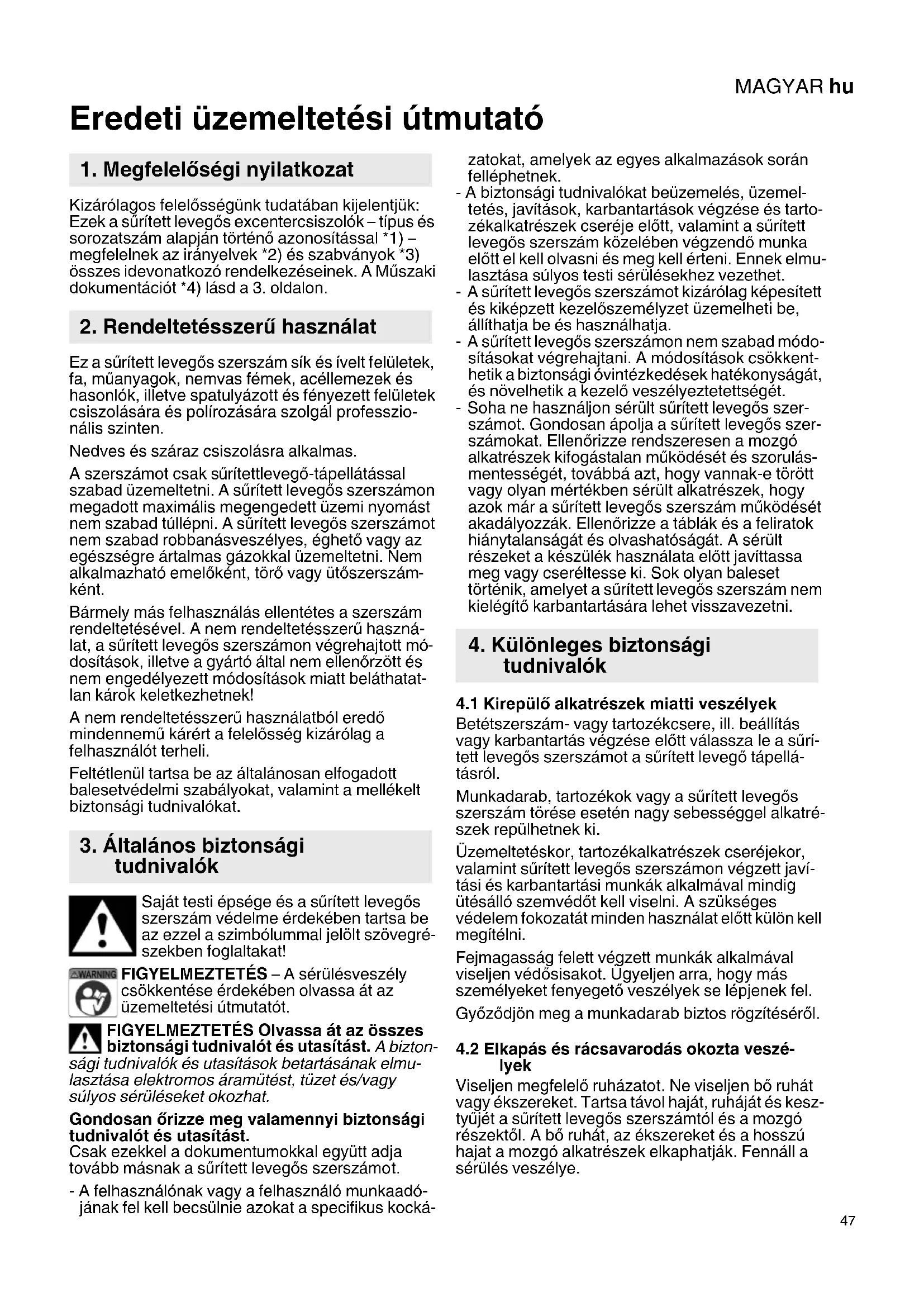 Eredeti üzemeltetési útmutató Kizárólagos felelősségünk tudatában kijelentjük: Ezek a sűrített levegős excentercsiszolók – típus és sorozatszám alapján történő azonosítással *1) – megfelelnek az irányelvek *2) és szabványok *3) összes idevonatkozó rendelkezéseinek. A Műszaki dokumentációt *4) lásd a 3. oldalon. Ez a sűrített levegős szerszám sík és ívelt felületek, fa, műanyagok, nemvas fémek, acéllemezek és hasonlók, illetve spatulyázott és fényezett felületek csiszolására és polírozására szolgál professzio- nális szinten. Nedves és száraz csiszolásra alkalmas. A szerszámot csak sűrítettlevegő-tápellátással szabad üzemeltetni. A sűrített levegős szerszámon megadott maximális megengedett üzemi nyomást nem szabad túllépni. A sűrített levegős szerszámot nem szabad robbanásveszélyes, éghető vagy az egészségre ártalmas gázokkal üzemeltetni. Nem alkalmazható emelőként, törő vagy ütőszerszám- ként. Bármely más felhasználás ellentétes a szerszám rendeltetésével. A nem rendeltetésszerű haszná- lat, a sűrített levegős szerszámon végrehajtott mó- dosítások, illetve a gyártó által nem ellenőrzött és nem engedélyezett módosítások miatt beláthatat- lan károk keletkezhetnek! A nem rendeltetésszerű használatból eredő mindennemű kárért a felelősség kizárólag a felhasználót terheli. Feltétlenül tartsa be az általánosan elfogadott balesetvédelmi szabályokat, valamint a mellékelt biztonsági tudnivalókat. Saját testi épsége és a sűrített levegős szerszám védelme érdekében tartsa be az ezzel a szimbólummal jelölt szövegré- szekben foglaltakat! FIGYELMEZTETÉS – A sérülésveszély csökkentése érdekében olvassa át az üzemeltetési útmutatót. FIGYELMEZTETÉS Olvassa át az összes biztonsági tudnivalót és utasítást. A bizton- sági tudnivalók és utasítások betartásának elmu- lasztása elektromos áramütést, tüzet és/vagy súlyos sérüléseket okozhat. Gondosan őrizze meg valamennyi biztonsági tudnivalót és utasítást. Csak ezekkel a dokumentumokkal együtt adja tovább másnak a sűrített levegős szerszámot. - A felhasználónak vagy a felhasználó munkaadó- jának fel kell becsülnie azokat a specifikus kocká- zatokat, amelyek az egyes alkalmazások során felléphetnek. - A biztonsági tudnivalókat beüzemelés, üzemel- tetés, javítások, karbantartások végzése és tarto- zékalkatrészek cseréje előtt, valamint a sűrített levegős szerszám közelében végzendő munka előtt el kell olvasni és meg kell érteni. Ennek elmu- lasztása súlyos testi sérülésekhez vezethet. -A sűrített levegős szerszámot kizárólag képesített és kiképzett kezelőszemélyzet üzemelheti be, állíthatja be és használhatja. -A sűrített levegős szerszámon nem szabad módo- sításokat végrehajtani. A módosítások csökkent- hetik a biztonsági óvintézkedések hatékonyságát, és növelhetik a kezelő veszélyeztetettségét. - Soha ne használjon sérült sűrített levegős szer- számot. Gondosan ápolja a sűrített levegős szer- számokat. Ellenőrizze rendszeresen a mozgó alkatrészek kifogástalan működését és szorulás- mentességét, továbbá azt, hogy vannak-e törött vagy olyan mértékben sérült alkatrészek, hogy azok már a sűrített levegős szerszám működését akadályozzák. Ellenőrizze a táblák és a feliratok hiánytalanságát és olvashatóságát. A sérült részeket a készülék használata előtt javíttassa meg vagy cseréltesse ki. Sok olyan baleset történik, amelyet a sűrített levegős szerszám nem kielégítő karbantartására lehet visszavezetni.