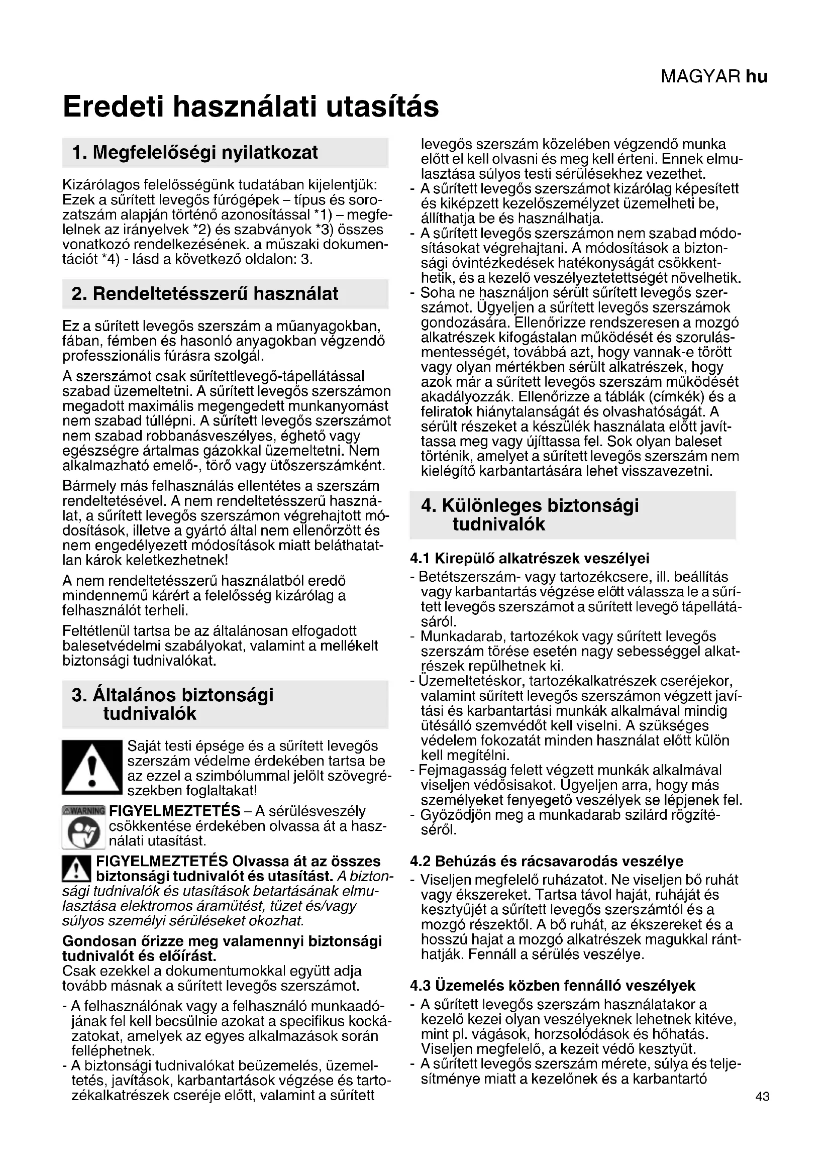 Eredeti használati utasítás Kizárólagos felelősségünk tudatában kijelentjük: Ezek a sűrített levegős fúrógépek – típus és soro- zatszám alapján történő azonosítással *1) – megfe- lelnek az irányelvek *2) és szabványok *3) összes vonatkozó rendelkezésének. a műszaki dokumen- tációt *4) - lásd a következő oldalon: 3. Ez a sűrített levegős szerszám a műanyagokban, fában, fémben és hasonló anyagokban végzendő professzionális fúrásra szolgál. A szerszámot csak sűrítettlevegő-tápellátással szabad üzemeltetni. A sűrített levegős szerszámon megadott maximális megengedett munkanyomást nem szabad túllépni. A sűrített levegős szerszámot nem szabad robbanásveszélyes, éghető vagy egészségre ártalmas gázokkal üzemeltetni. Nem alkalmazható emelő-, törő vagy ütőszerszámként. Bármely más felhasználás ellentétes a szerszám rendeltetésével. A nem rendeltetésszerű haszná- lat, a sűrített levegős szerszámon végrehajtott mó- dosítások, illetve a gyártó által nem ellenőrzött és nem engedélyezett módosítások miatt beláthatat- lan károk keletkezhetnek! A nem rendeltetésszerű használatból eredő mindennemű kárért a felelősség kizárólag a felhasználót terheli. Feltétlenül tartsa be az általánosan elfogadott balesetvédelmi szabályokat, valamint a mellékelt biztonsági tudnivalókat. Saját testi épsége és a sűrített levegős szerszám védelme érdekében tartsa be az ezzel a szimbólummal jelölt szövegré- szekben foglaltakat! FIGYELMEZTETÉS – A sérülésveszély csökkentése érdekében olvassa át a hasz- nálati utasítást. FIGYELMEZTETÉS Olvassa át az összes biztonsági tudnivalót és utasítást. A bizton- sági tudnivalók és utasítások betartásának elmu- lasztása elektromos áramütést, tüzet és/vagy súlyos személyi sérüléseket okozhat. Gondosan őrizze meg valamennyi biztonsági tudnivalót és előírást. Csak ezekkel a dokumentumokkal együtt adja tovább másnak a sűrített levegős szerszámot. - A felhasználónak vagy a felhasználó munkaadó- jának fel kell becsülnie azokat a specifikus kocká- zatokat, amelyek az egyes alkalmazások során felléphetnek. - A biztonsági tudnivalókat beüzemelés, üzemel- tetés, javítások, karbantartások végzése és tarto- zékalkatrészek cseréje előtt, valamint a sűrített levegős szerszám közelében végzendő munka előtt el kell olvasni és meg kell érteni. Ennek elmu- lasztása súlyos testi sérülésekhez vezethet. -A sűrített levegős szerszámot kizárólag képesített és kiképzett kezelőszemélyzet üzemelheti be, állíthatja be és használhatja. -A sűrített levegős szerszámon nem szabad módo- sításokat végrehajtani. A módosítások a bizton- sági óvintézkedések hatékonyságát csökkent- hetik, és a kezelő veszélyeztetettségét növelhetik. - Soha ne használjon sérült sűrített levegős szer- számot. Ügyeljen a sűrített levegős szerszámok gondozására. Ellenőrizze rendszeresen a mozgó alkatrészek kifogástalan működését és szorulás- mentességét, továbbá azt, hogy vannak-e törött vagy olyan mértékben sérült alkatrészek, hogy azok már a sűrített levegős szerszám működését akadályozzák. Ellenőrizze a táblák (címkék) és a feliratok hiánytalanságát és olvashatóságát. A sérült részeket a készülék használata előtt javít- tassa meg vagy újíttassa fel. Sok olyan baleset történik, amelyet a sűrített levegős szerszám nem kielégítő karbantartására lehet visszavezetni.