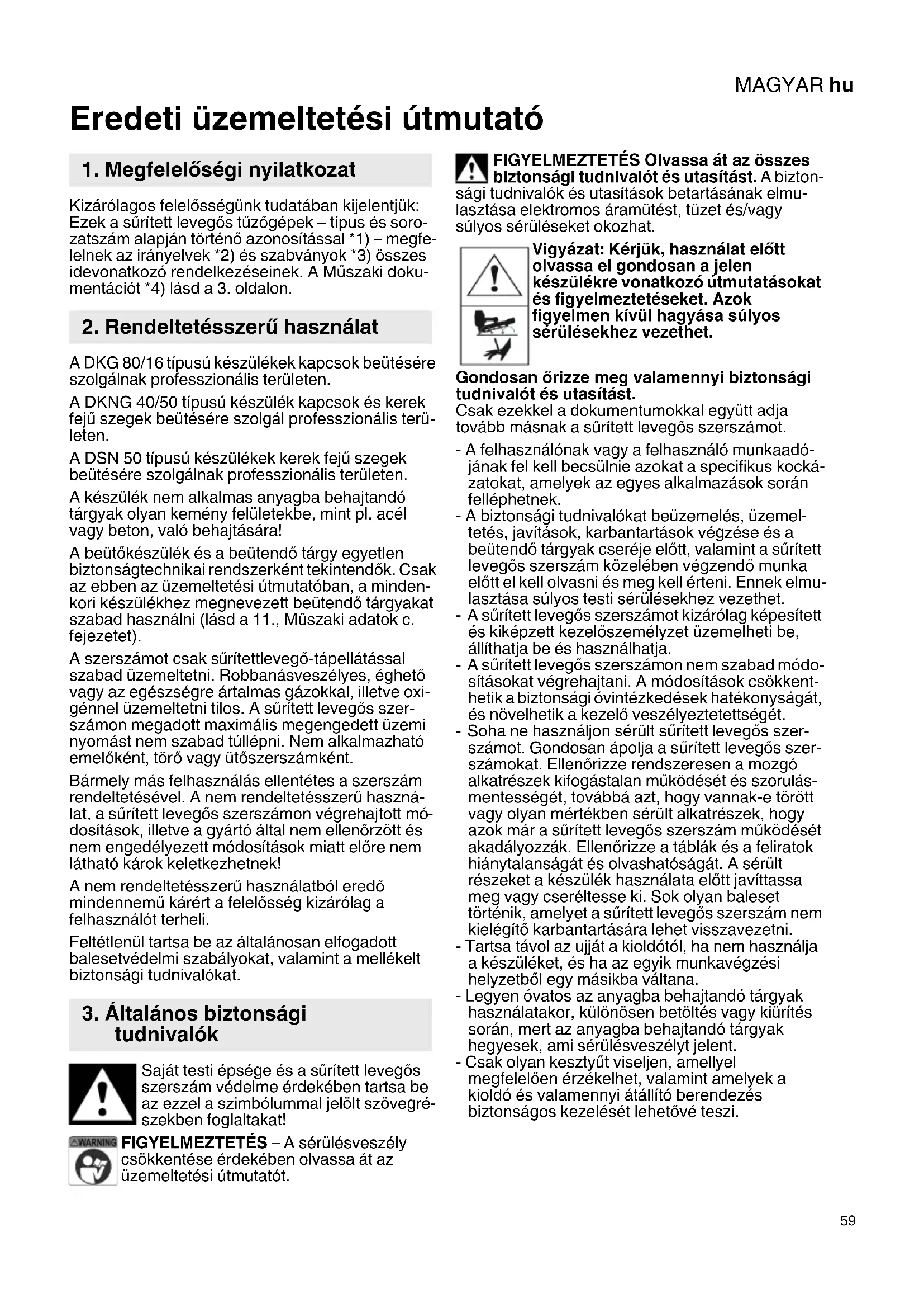 Eredeti üzemeltetési útmutató Kizárólagos felelősségünk tudatában kijelentjük: Ezek a sűrített levegős tűzőgépek – típus és soro- zatszám alapján történő azonosítással *1) – megfe- lelnek az irányelvek *2) és szabványok *3) összes idevonatkozó rendelkezéseinek. A Műszaki doku- mentációt *4) lásd a 3. oldalon. A DKG 80/16 típusú készülékek kapcsok beütésére szolgálnak professzionális területen. A DKNG 40/50 típusú készülék kapcsok és kerek fejű szegek beütésére szolgál professzionális terü- leten. A DSN 50 típusú készülékek kerek fejű szegek beütésére szolgálnak professzionális területen. A készülék nem alkalmas anyagba behajtandó tárgyak olyan kemény felületekbe, mint pl. acél vagy beton, való behajtására! A beütőkészülék és a beütendő tárgy egyetlen biztonságtechnikai rendszerként tekintendők. Csak az ebben az üzemeltetési útmutatóban, a minden- kori készülékhez megnevezett beütendő tárgyakat szabad használni (lásd a 11., Műszaki adatok c. fejezetet). A szerszámot csak sűrítettlevegő-tápellátással szabad üzemeltetni. Robbanásveszélyes, éghető vagy az egészségre ártalmas gázokkal, illetve oxi- génnel üzemeltetni tilos. A sűrített levegős szer- számon megadott maximális megengedett üzemi nyomást nem szabad túllépni. Nem alkalmazható emelőként, törő vagy ütőszerszámként. Bármely más felhasználás ellentétes a szerszám rendeltetésével. A nem rendeltetésszerű haszná- lat, a sűrített levegős szerszámon végrehajtott mó- dosítások, illetve a gyártó által nem ellenőrzött és nem engedélyezett módosítások miatt előre nem látható károk keletkezhetnek! A nem rendeltetésszerű használatból eredő mindennemű kárért a felelősség kizárólag a felhasználót terheli. Feltétlenül tartsa be az általánosan elfogadott balesetvédelmi szabályokat, valamint a mellékelt biztonsági tudnivalókat. Saját testi épsége és a sűrített levegős szerszám védelme érdekében tartsa be az ezzel a szimbólummal jelölt szövegré- szekben foglaltakat! FIGYELMEZTETÉS – A sérülésveszély csökkentése érdekében olvassa át az üzemeltetési útmutatót. FIGYELMEZTETÉS Olvassa át az összes biztonsági tudnivalót és utasítást. A bizton- sági tudnivalók és utasítások betartásának elmu- lasztása elektromos áramütést, tüzet és/vagy súlyos sérüléseket okozhat. Vigyázat: Kérjük, használat előtt olvassa el gondosan a jelen készülékre vonatkozó útmutatásokat és figyelmeztetéseket. Azok figyelmen kívül hagyása súlyos sérülésekhez vezethet. Gondosan őrizze meg valamennyi biztonsági tudnivalót és utasítást. Csak ezekkel a dokumentumokkal együtt adja tovább másnak a sűrített levegős szerszámot. - A felhasználónak vagy a felhasználó munkaadó- jának fel kell becsülnie azokat a specifikus kocká- zatokat, amelyek az egyes alkalmazások során felléphetnek. - A biztonsági tudnivalókat beüzemelés, üzemel- tetés, javítások, karbantartások végzése és a beütendő tárgyak cseréje előtt, valamint a sűrített levegős szerszám közelében végzendő munka előtt el kell olvasni és meg kell érteni. Ennek elmu- lasztása súlyos testi sérülésekhez vezethet. -A sűrített levegős szerszámot kizárólag képesített és kiképzett kezelőszemélyzet üzemelheti be, állíthatja be és használhatja. -A sűrített levegős szerszámon nem szabad módo- sításokat végrehajtani. A módosítások csökkent- hetik a biztonsági óvintézkedések hatékonyságát, és növelhetik a kezelő veszélyeztetettségét. - Soha ne használjon sérült sűrített levegős szer- számot. Gondosan ápolja a sűrített levegős szer- számokat. Ellenőrizze rendszeresen a mozgó alkatrészek kifogástalan működését és szorulás- mentességét, továbbá azt, hogy vannak-e törött vagy olyan mértékben sérült alkatrészek, hogy azok már a sűrített levegő s szerszám működését akadályozzák. Ellenőrizze a táblák és a feliratok hiánytalanságát és olvashatóságát. A sérült részeket a készülék használata előtt javíttassa meg vagy cseréltesse ki. Sok olyan baleset történik, amelyet a sűrített levegős szerszám nem kielégítő karbantartására lehet visszavezetni. - Tartsa távol az ujját a kioldótól, ha nem használja a készüléket, és ha az egyik munkavégzési helyzetből egy másikba váltana. - Legyen óvatos az anyagba behajtandó tárgyak használatakor, különösen betöltés vagy kiürítés során, mert az anyagba behajtandó tárgyak hegyesek, ami sérülésveszélyt jelent. - Csak olyan kesztyűt viseljen, amellyel megfelelően érzékelhet, valamint amelyek a kioldó és valamennyi átállító berendezés biztonságos kezelését lehetővé teszi.