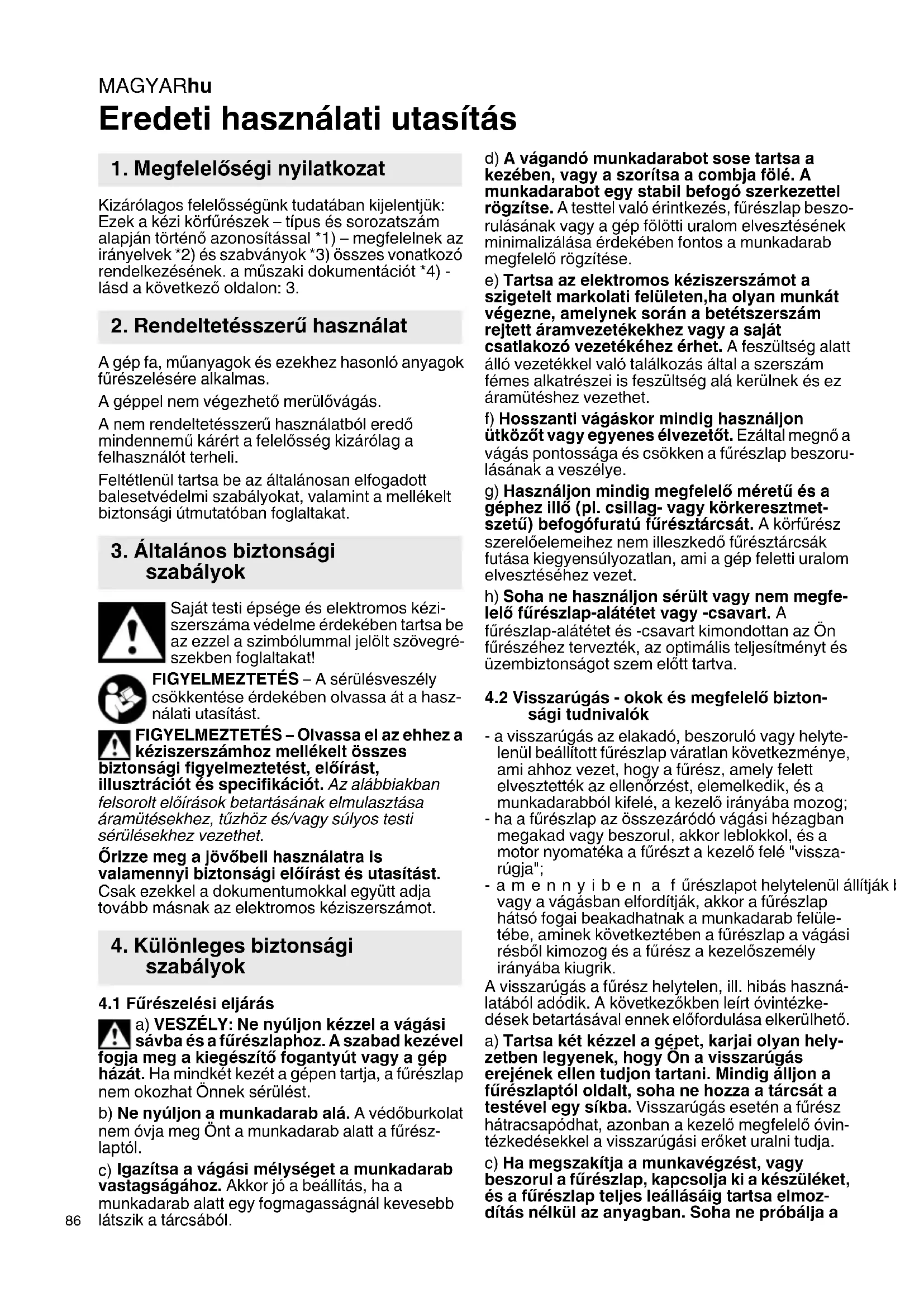 Eredeti használati utasítás Kizárólagos felelősségünk tudatában kijelentjük: Ezek a kézi körfűrészek – típus és sorozatszám alapján történő azonosítással *1) – megfelelnek az irányelvek *2) és szabványok *3) összes vonatkozó rendelkezésének. a műszaki dokumentációt *4) - lásd a következő oldalon: 3. A gép fa, műanyagok és ezekhez hasonló anyagok fűrészelésére alkalmas. A géppel nem végezhető merülővágás. A nem rendeltetésszerű használatból eredő mindennemű kárért a felelősség kizárólag a felhasználót terheli. Feltétlenül tartsa be az általánosan elfogadott balesetvédelmi szabályokat, valamint a mellékelt biztonsági útmutatóban foglaltakat. Saját testi épsége és elektromos kézi- szerszáma védelme érdekében tartsa be az ezzel a szimbólummal jelölt szövegré- szekben foglaltakat! FIGYELMEZTETÉS – A sérülésveszély csökkentése érdekében olvassa át a hasz- nálati utasítást. FIGYELMEZTETÉS – Olvassa el az ehhez a kéziszerszámhoz mellékelt összes biztonsági figyelmeztetést, előírást, illusztrációt és specifikációt. Az alábbiakban felsorolt előírások betartásának elmulasztása áramütésekhez, tűzhöz és/vagy súlyos testi sérülésekhez vezethet. Őrizze meg a jövőbeli használatra is valamennyi biztonsági előírást és utasítást. Csak ezekkel a dokumentumokkal együtt adja tovább másnak az elektromos kéziszerszámot.
