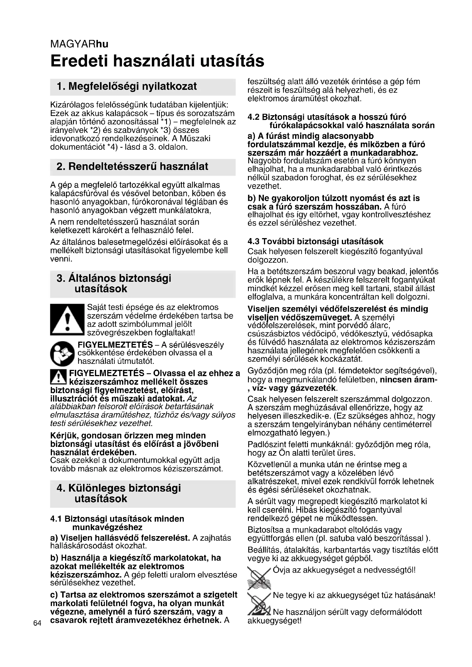 Eredeti használati utasítás Kizárólagos felelősségünk tudatában kijelentjük: Ezek az akkus kalapácsok – típus és sorozatszám alapján történő azonosítással *1) – megfelelnek az irányelvek *2) és szabványok *3) összes idevonatkozó rendelkezéseinek. A Műszaki dokumentációt *4) - lásd a 3. oldalon. A gép a megfelelő tartozékkal együtt alkalmas kalapácsfúróval és vésővel betonban, kőben és hasonló anyagokban, fúrókoronával téglában és hasonló anyagokban végzett munkálatokra, A nem rendeltetésszerű használat során keletkezett károkért a felhasználó felel. Az általános balesetmegelőzési előírásokat és a mellékelt biztonsági utasításokat figyelembe kell venni. Saját testi épsége és az elektromos szerszám védelme érdekében tartsa be az adott szimbólummal jelölt szövegrészekben foglaltakat! FIGYELMEZTETÉS – A sérülésveszély csökkentése érdekében olvassa el a használati útmutatót. FIGYELMEZTETÉS – Olvassa el az ehhez a kéziszerszámhoz mellékelt összes biztonsági figyelmeztetést, előírást, illusztrációt és műszaki adatokat. Az alábbiakban felsorolt előírások betartásának elmulasztása áramütéshez, tűzhöz és/vagy súlyos testi sérülésekhez vezethet. Kérjük, gondosan őrizzen meg minden biztonsági utasítást és előírást a jövőbeni használat érdekében. Csak ezekkel a dokumentumokkal együtt adja tovább másnak az elektromos kéziszerszámot.