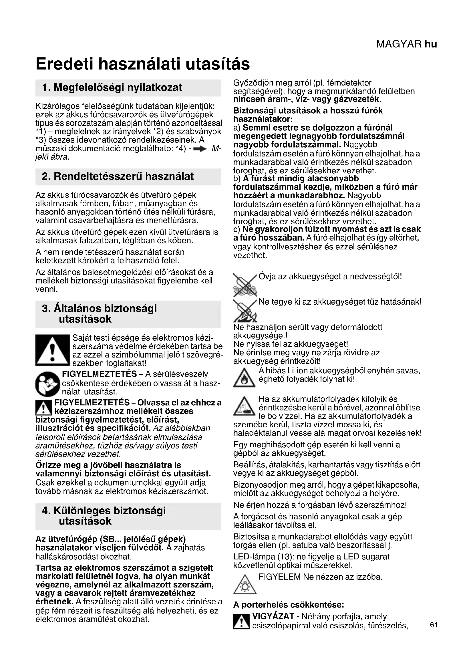 Kizárólagos felelősségünk tudatában kijelentjük: ezek az akkus fúrócsavarozók és ütvefúrógépek – típus és sorozatszám alapján történő azonosítással *1) – megfelelnek az irányelvek *2) és szabványok *3) összes idevonatkozó rendelkezéseinek. A műszaki dokumentáció megtalálható: *4) - M- jelű ábra. Az akkus fúrócsavarozók és ütvefúró gépek alkalmasak fémben, fában, műanyagban és hasonló anyagokban történő ütés nélküli fúrásra, valamint csavarbehajtásra és menetfúrásra. Az akkus ütvefúró gépek ezen kívül ütvefúrásra is alkalmasak falazatban, téglában és kőben. A nem rendeltetésszerű használat során keletkezett károkért a felhasználó felel. Az általános balesetmegelőzési előírásokat és a mellékelt biztonsági utasításokat figyelembe kell venni. Saját testi épsége és elektromos kézi- szerszáma védelme érdekében tartsa be az ezzel a szimbólummal jelölt szövegré- szekben foglaltakat! FIGYELMEZTETÉS – A sérülésveszély csökkentése érdekében olvassa át a hasz- nálati utasítást. FIGYELMEZTETÉS – Olvassa el az ehhez a kéziszerszámhoz mellékelt összes biztonsági figyelmeztetést, előírást, illusztrációt és specifikációt. Az alábbiakban felsorolt előírások betartásának elmulasztása áramütésekhez, tűzhöz és/vagy súlyos testi sérülésekhez vezethet. Őrizze meg a jövőbeli használatra is valamennyi biztonsági előírást és utasítást. Csak ezekkel a dokumentumokkal együtt adja tovább másnak az elektromos kéziszerszámot. Az ütvefúrógép (SB... jelölésű gépek) használatakor viseljen fülvédőt. A zajhatás halláskárosodást okozhat. Tartsa az elektromos szerszámot a szigetelt markolati felületnél fogva, ha olyan munkát végezne, amelynél az alkalmazott szerszám, vagy a csavarok rejtett áramvezetékhez érhetnek. A feszültség alatt álló vezeték érintése a gép fém részeit is feszültség alá helyezheti, és ez elektromos áramütést okozhat. Győződjön meg arról (pl. fémdetektor segítségével), hogy a megmunkálandó felületben nincsen áram-, víz- vagy gázvezeték. Biztonsági utasítások a hosszú fúrók használatakor: a) Semmi esetre se dolgozzon a fúrónál megengedett legnagyobb fordulatszámnál nagyobb fordulatszámmal. Nagyobb fordulatszám esetén a fúró könnyen elhajolhat, ha a munkadarabbal való érintkezés nélkül szabadon foroghat, és ez sérülésekhez vezethet. b) A fúrást mindig alacsonyabb fordulatszámmal kezdje, miközben a fúró már hozzáért a munkadarabhoz. Nagyobb fordulatszám esetén a fúró könnyen elhajolhat, ha a munkadarabbal való érintkezés nélkül szabadon foroghat, és ez sérülésekhez vezethet. c) Ne gyakoroljon túlzott nyomást és azt is csak a fúró hosszában. A fúró elhajolhat és így eltörhet, vgay kontrollvesztéshez és ezzel sérüléshez vezethet. Óvja az akkuegységet a nedvességtől! Ne tegye ki az akkuegységet tűz hatásának! Ne használjon sérült vagy deformálódott akkuegységet! Ne nyissa fel az akkuegységet! Ne érintse meg vagy ne zárja rövidre az akkuegység érintkezőit! A hibás Li-ion akkuegységből enyhén savas, éghető folyadék folyhat ki! Ha az akkumulátorfolyadék kifolyik és érintkezésbe kerül a bőrével, azonnal öblítse le bő vízzel. Ha az akkumulátorfolyadék a szemébe kerül, tiszta vízzel mossa ki, és haladéktalanul vesse alá magát orvosi kezelésnek! Egy meghibásodott gép esetén ki kell venni a gépből az akkuegységet. Beállítás, átalakítás, karbantartás vagy tisztítás előtt vegye ki az akkuegységet gépből. Bizonyosodjon meg arról, hogy a gépet kikapcsolta, mielőtt az akkuegységet behelyezi a helyére. Ne érjen hozzá a forgásban lévő szerszámhoz! A forgácsot és hasonló anyagokat csak a gép leállásakor távolítsa el. Biztosítsa a munkadarabot eltolódás vagy együtt forgás ellen (pl. satuba való beszorítással ). LED-lámpa (13): ne figyelje a LED sugarat közvetlenül optikai műszerekkel. FIGYELEM Ne nézzen az izzóba. A porterhelés csökkentése: VIGYÁZAT - Néhány porfajta, amely csiszolópapírral való csiszolás, fűrészelés, Eredeti használati utasítás