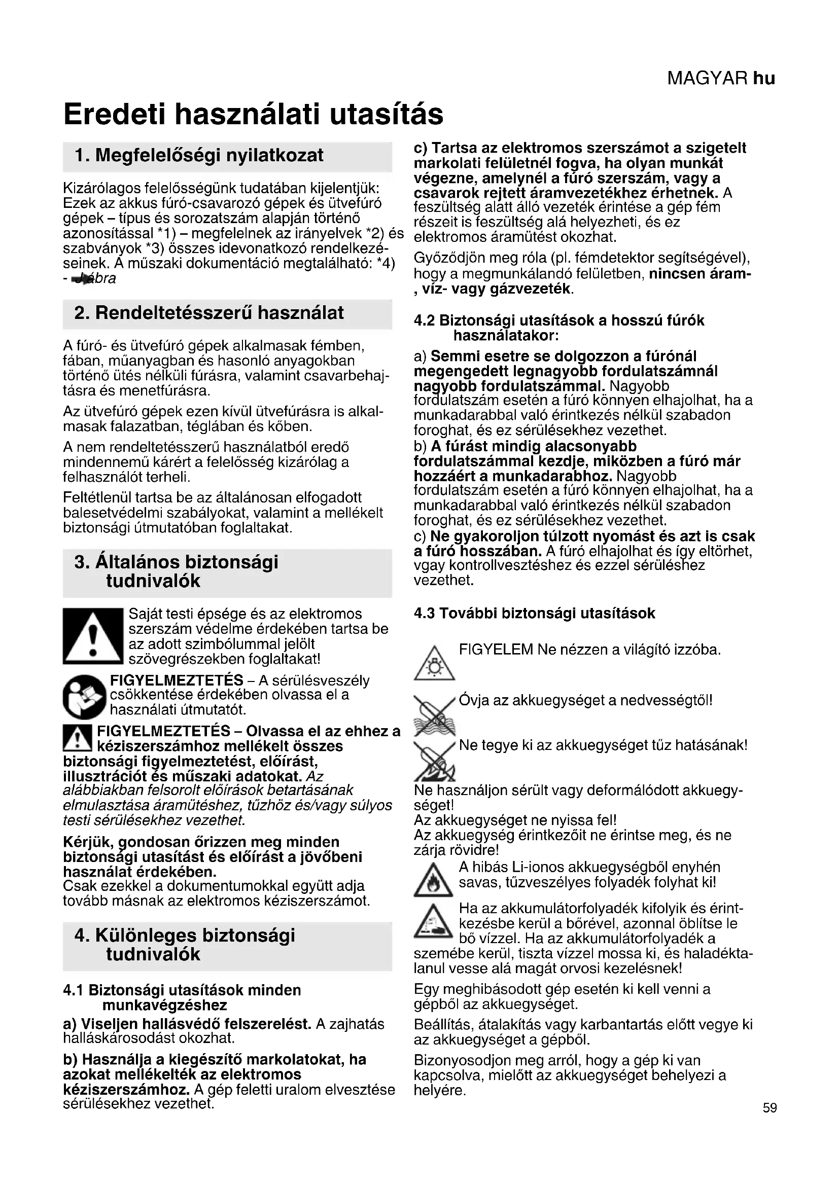 Kizárólagos felelősségünk tudatában kijelentjük: Ezek az akkus fúró-csavarozó gépek és ütvefúró gépek – típus és sorozatszám alapján történő azonosítással *1) – megfelelnek az irányelvek *2) és szabványok *3) összes idevonatkozó rendelkezé- seinek. A műszaki dokumentáció megtalálható: *4) - J ábra A fúró- és ütvefúró gépek alkalmasak fémben, fában, műanyagban és hasonló anyagokban történő ütés nélküli fúrásra, valamint csavarbehaj- tásra és menetfúrásra. Az ütvefúró gépek ezen kívül ütvefúrásra is alkal- masak falazatban, téglában és kőben. A nem rendeltetésszerű használatból eredő mindennemű kárért a felelősség kizárólag a felhasználót terheli. Feltétlenül tartsa be az általánosan elfogadott balesetvédelmi szabályokat, valamint a mellékelt biztonsági útmutatóban foglaltakat. Saját testi épsége és az elektromos szerszám védelme érdekében tartsa be az adott szimbólummal jelölt szövegrészekben foglaltakat! FIGYELMEZTETÉS – A sérülésveszély csökkentése érdekében olvassa el a használati útmutatót. FIGYELMEZTETÉS – Olvassa el az ehhez a kéziszerszámhoz mellékelt összes biztonsági figyelmeztetést, előírást, illusztrációt és műszaki adatokat. Az alábbiakban felsorolt előírások betartásának elmulasztása áramütéshez, tűzhöz és/vagy súlyos testi sérülésekhez vezethet. Kérjük, gondosan őrizzen meg minden biztonsági utasítást és előírást a jövőbeni használat érdekében. Csak ezekkel a dokumentumokkal együtt adja tovább másnak az elektromos kéziszerszámot.