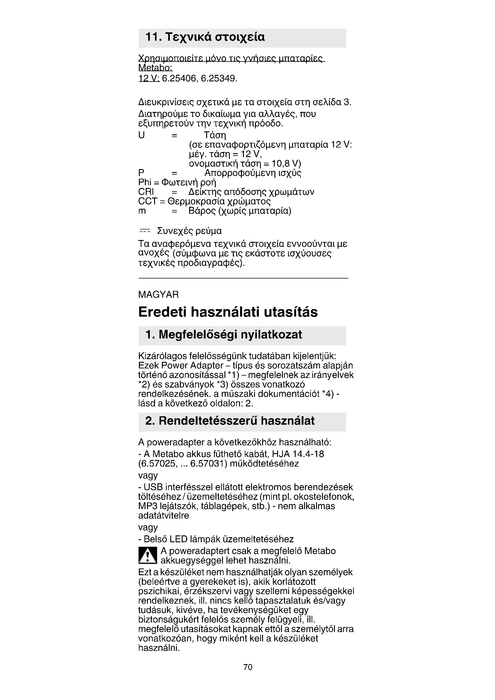 (σύμφωνα με τις εκάστοτε ισχύουσες τεχνικές προδιαγραφές). MAGYAR Eredeti használati utasítás Kizárólagos felelősségünk tudatában kijelentjük: Ezek Power Adapter – típus és sorozatszám alapján történő azonosítással *1) – megfelelnek az irányelvek *2) és szabványok *3) összes vonatkozó rendelkezésének. a műszaki dokumentációt *4) - lásd a következő oldalon: 2. A poweradapter a következőkhöz használható: - A Metabo akkus fűthető kabát, HJA 14.4-18 (6.57025, ... 6.57031) működtetéséhez vagy - USB interfésszel ellátott elektromos berendezések töltéséhez / üzemeltetéséhez (mint pl. okostelefonok, MP3 lejátszók, táblagépek, stb.) - nem alkalmas adatátvitelre vagy - Belső LED lámpák üzemeltetéséhez A poweradaptert csak a megfelelő Metabo akkuegységgel lehet használni. Ezt a készüléket nem használhatják olyan személyek (beleértve a gyerekeket is), akik korlátozott pszichikai, érzékszervi vagy szellemi képességekkel rendelkeznek, ill. nincs kellő tapasztalatuk és/vagy tudásuk, kivéve, ha tevékenységüket egy biztonságukért felelős személy felügyeli, ill. megfelelő utasításokat kapnak ettől a személytől arra vonatkozóan, hogy miként kell a készüléket használni.