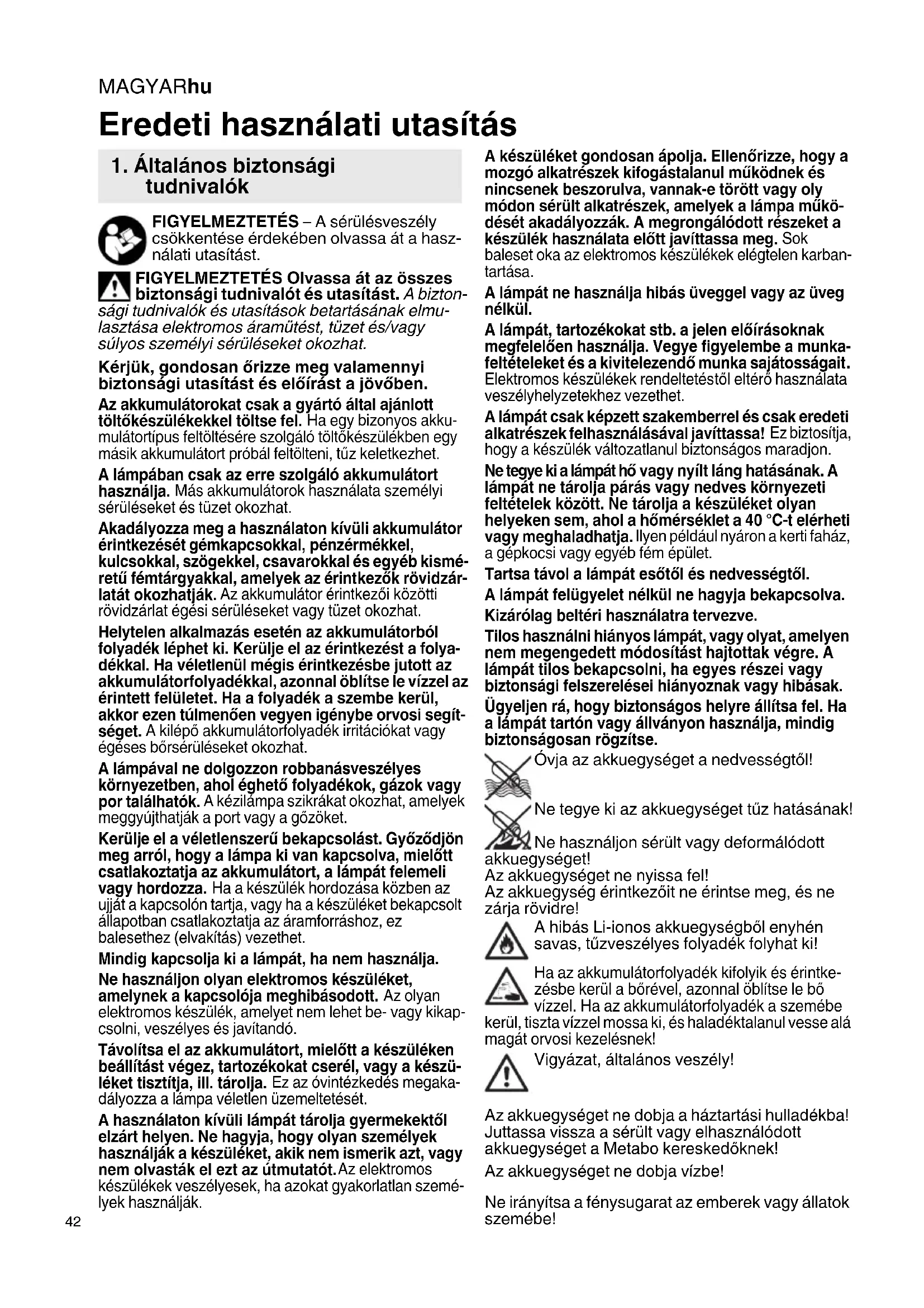 FIGYELMEZTETÉS – A sérülésveszély csökkentése érdekében olvassa át a hasz- nálati utasítást. FIGYELMEZTETÉS Olvassa át az összes biztonsági tudnivalót és utasítást. A bizton- sági tudnivalók és utasítások betartásának elmu- lasztása elektromos áramütést, tüzet és/vagy súlyos személyi sérüléseket okozhat. Kérjük, gondosan őrizze meg valamennyi biztonsági utasítást és előírást a jövőben. Az akkumulátorokat csak a gyártó által ajánlott töltőkészülékekkel töltse fel. Ha egy bizonyos akku- mulátortípus feltöltésére szolgáló töltőkészülékben egy másik akkumulátort próbál feltölteni, tűz keletkezhet. A lámpában csak az erre szolgáló akkumulátort használja. Más akkumulátorok használata személyi sérüléseket és tüzet okozhat. Akadályozza meg a használaton kívüli akkumulátor érintkezését gémkapcsokkal, pénzérmékkel, kulcsokkal, szögekkel, csavarokkal és egyéb kismé- retű fémtárgyakkal, amelyek az érintkezők rövidzár- latát okozhatják. Az akkumulátor érintkezői közötti rövidzárlat égési sérüléseket vagy tüzet okozhat. Helytelen alkalmazás esetén az akkumulátorból folyadék léphet ki. Kerülje el az érintkezést a folya- dékkal. Ha véletlenül mégis érintkezésbe jutott az akkumulátorfolyadékkal, azonnal öblítse le vízzel az érintett felületet. Ha a folyadék a szembe kerül, akkor ezen túlmenően vegyen igénybe orvosi segít- séget. A kilépő akkumulátorfolyadék irritációkat vagy égéses bőrsérüléseket okozhat. A lámpával ne dolgozzon robbanásveszélyes környezetben, ahol éghető folyadékok, gázok vagy por találhatók. A kézilámpa szikrákat okozhat, amelyek meggyújthatják a port vagy a gőzöket. Kerülje el a véletlenszerű bekapcsolást. Győződjön meg arról, hogy a lámpa ki van kapcsolva, mielőtt csatlakoztatja az akkumulátort, a lámpát felemeli vagy hordozza. Ha a készülék hordozása közben az ujját a kapcsolón tartja, vagy ha a készüléket bekapcsolt állapotban csatlakoztatja az áramforráshoz, ez balesethez (elvakítás) vezethet. Mindig kapcsolja ki a lámpát, ha nem használja. Ne használjon olyan elektromos készüléket, amelynek a kapcsolója meghibásodott. Az olyan elektromos készülék, amelyet nem lehet be- vagy kikap- csolni, veszélyes és javítandó. Távolítsa el az akkumulátort, mielőtt a készüléken beállítást végez, tartozékokat cserél, vagy a készü- léket tisztítja, ill. tárolja. Ez az óvintézkedés megaka- dályozza a lámpa véletlen üzemeltetését. A használaton kívüli lámpát tárolja gyermekektől elzárt helyen. Ne hagyja, hogy olyan személyek használják a készüléket, akik nem ismerik azt, vagy nem olvasták el ezt az útmutatót. Az elektromos készülékek veszélyesek, ha azokat gyakorlatlan szemé- lyek használják. A készüléket gondosan ápolja. Ellenőrizze, hogy a mozgó alkatrészek kifogástalanul működnek és nincsenek beszorulva, vannak-e törött vagy oly módon sérült alkatrészek, amelyek a lámpa műkö- dését akadályozzák. A megrongálódott részeket a készülék használata előtt javíttassa meg. Sok baleset oka az elektromos készülékek elégtelen karban- tartása. A lámpát ne használja hibás üveggel vagy az üveg nélkül. A lámpát, tartozékokat stb. a jelen előírásoknak megfelelően használja. Vegye figyelembe a munka- feltételeket és a kivitelezendő munka sajátosságait. Elektromos készülékek rendeltetéstől eltérő használata veszélyhelyzetekhez vezethet. A lámpát csak képzett szakemberrel és csak eredeti alkatrészek felhasználásával javíttassa! Ez biztosítja, hogy a készülék változatlanul biztonságos maradjon. Ne tegye ki a lámpát hő vagy nyílt láng hatásának. A lámpát ne tárolja párás vagy nedves környezeti feltételek között. Ne tárolja a készüléket olyan helyeken sem, ahol a hőmérséklet a 40 °C-t elérheti vagy meghaladhatja. Ilyen például nyáron a kerti faház, a gépkocsi vagy egyéb fém épület. Tartsa távol a lámpát esőtől és nedvességtől. A lámpát felügyelet nélkül ne hagyja bekapcsolva. Kizárólag beltéri használatra tervezve. Tilos használni hiányos lámpát, vagy olyat, amelyen nem megengedett módosítást hajtottak végre. A lámpát tilos bekapcsolni, ha egyes részei vagy biztonsági felszerelései hiányoznak vagy hibásak. Ügyeljen rá, hogy biztonságos helyre állítsa fel. Ha a lámpát tartón vagy állványon használja, mindig biztonságosan rögzítse. Óvja az akkuegységet a nedvességtől! Ne tegye ki az akkuegységet tűz hatásának! Ne használjon sérült vagy deformálódott akkuegységet! Az akkuegységet ne nyissa fel! Az akkuegység érintkezőit ne érintse meg, és ne zárja rövidre! A hibás Li-ionos akkuegységből enyhén savas, tűzveszélyes folyadék folyhat ki! Ha az akkumulátorfolyadék kifolyik és érintke- zésbe kerül a bőrével, azonnal öblítse le bő vízzel. Ha az akkumulátorfolyadék a szemébe kerül, tiszta vízzel mossa ki, és haladéktalanul vesse alá magát orvosi kezelésnek! Vigyázat, általános veszély! Az akkuegységet ne dobja a háztartási hulladékba! Juttassa vissza a sérült vagy elhasználódott akkuegységet a Metabo kereskedőknek! Az akkuegységet ne dobja vízbe! Ne irányítsa a fénysugarat az emberek vagy állatok szemébe! Eredeti használati utasítás