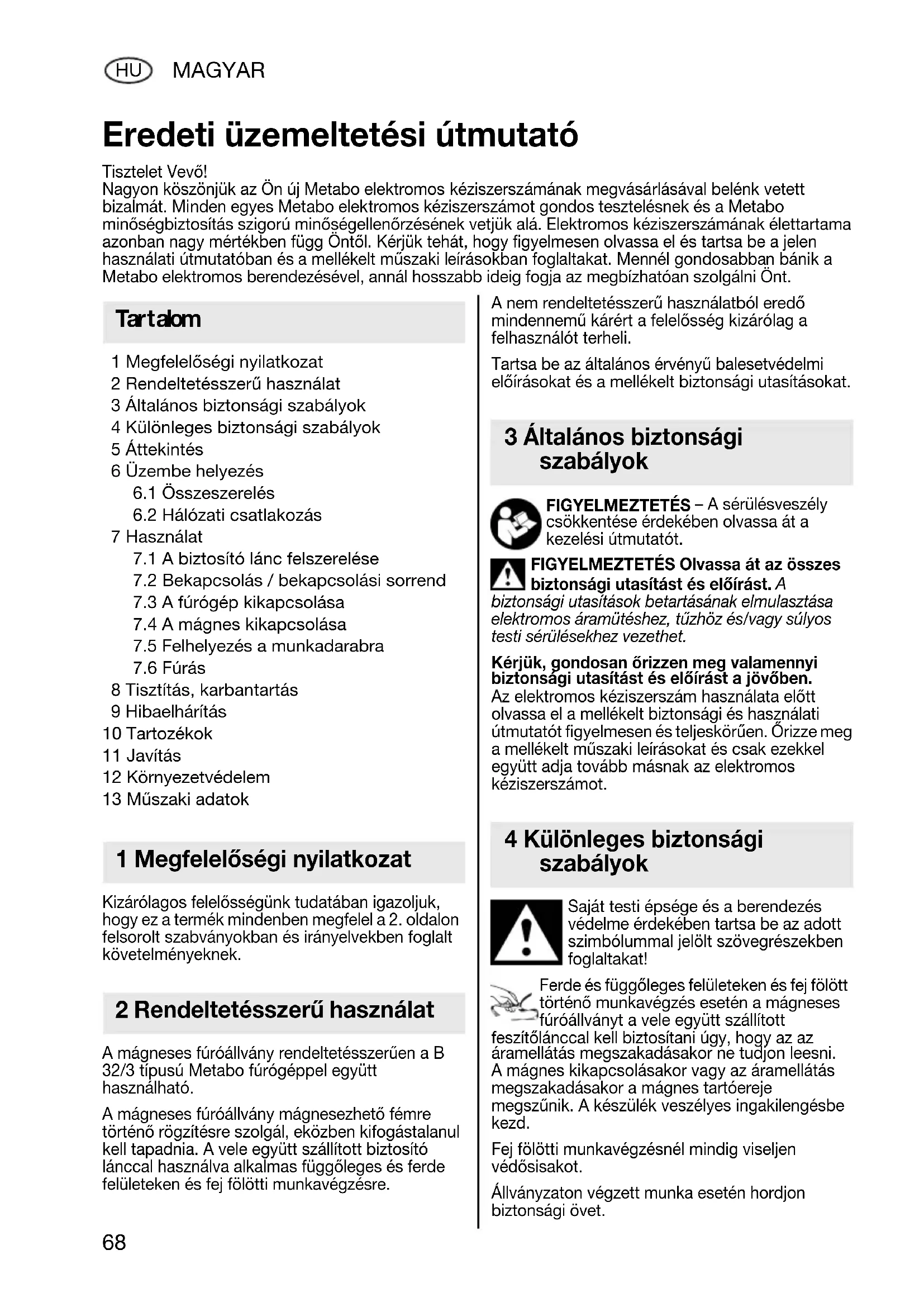 biztonsági utasítások betartásának elmulasztása elektromos áramütéshez, tűzhöz és/vagy súlyos testi sérülésekhez vezethet. Kérjük, gondosan őrizzen meg valamennyi biztonsági utasítást és előírást a jövőben. Az elektromos kéziszerszám használata előtt olvassa el a mellékelt biztonsági és használati útmutatót figyelmesen és teljeskörűen. Őrizze meg a mellékelt műszaki leírásokat és csak ezekkel együtt adja tovább másnak az elektromos kéziszerszámot. Saját testi épsége és a berendezés védelme érdekében tartsa be az adott szimbólummal jelölt szövegrészekben foglaltakat! Ferde és függőleges felületeken és fej fölött történő munkavégzés esetén a mágneses fúróállványt a vele együtt szállított feszítőlánccal kell biztosítani úgy, hogy az az áramellátás megszakadásakor ne tudjon leesni. A mágnes kikapcsolásakor vagy az áramellátás megszakadásakor a mágnes tartóereje megszűnik. A készülék veszélyes ingakilengésbe kezd. Fej fölötti munkavégzésnél mindig viseljen védősisakot. Állványzaton végzett munka esetén hordjon biztonsági övet. Eredeti üzemeltetési útmutató Tisztelet Vevő! Nagyon köszönjük az Ön új Metabo elektromos kéziszerszámának megvásárlásával belénk vetett bizalmát. Minden egyes Metabo elektromos kéziszerszámot gondos tesztelésnek és a Metabo minőségbiztosítás szigorú minőségellenőrzésének vetjük alá. Elektromos kéziszerszámának élettartama azonban nagy mértékben függ Öntől. Kérjük tehát, hogy figyelmesen olvassa el és tartsa be a jelen használati útmutatóban és a mellékelt műszaki leírásokban foglaltakat. Mennél gondosabban bánik a Metabo elektromos berendezésével, annál hosszabb ideig fogja az megbízhatóan szolgálni Önt. Tar t alom 1 Megfelelőségi nyilatkozat 2 Rendeltetésszerű használat 3 Általános biztonsági szabályok 4 Különleges biztonsági szabályok 17026927_0411 M 100.book Seite 68 Dienstag, 26. April 2011 10:28 10MAGYAR