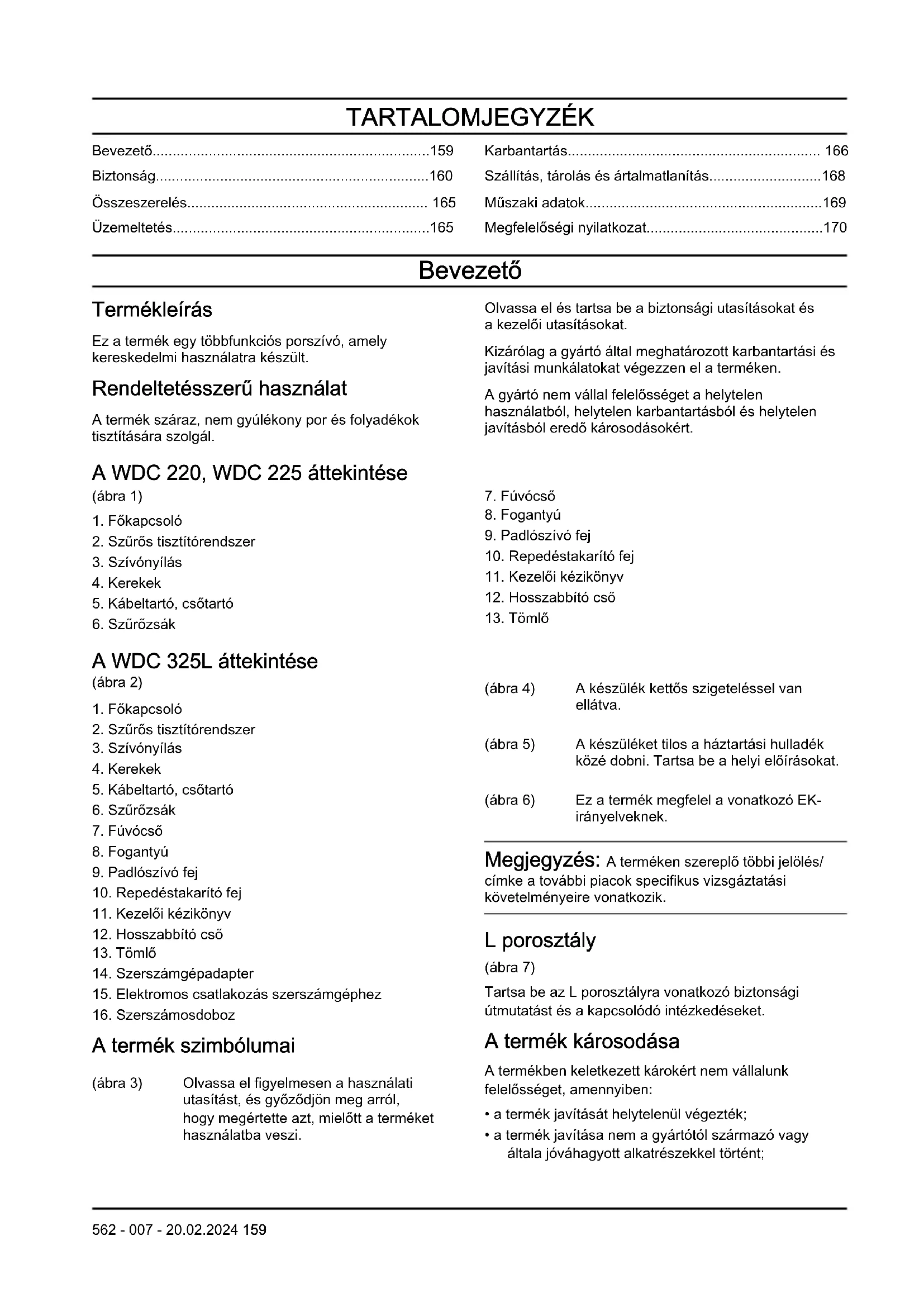 - Megfelelőségi nyilatkozat Bevezető Termékleírás Ez a termék egy többfunkciós porszívó, amely kereskedelmi használatra készült. Rendeltetésszerű használat A termék száraz, nem gyúlékony por és folyadékok tisztítására szolgál. Olvassa el és tartsa be a biztonsági utasításokat és a kezelői utasításokat. Kizárólag a gyártó által meghatározott karbantartási és javítási munkálatokat végezzen el a terméken. A gyártó nem vállal felelősséget a helytelen használatból, helytelen karbantartásból és helytelen javításból eredő károsodásokért. A WDC 220, WDC 225 áttekintése (ábra 1) p. 170