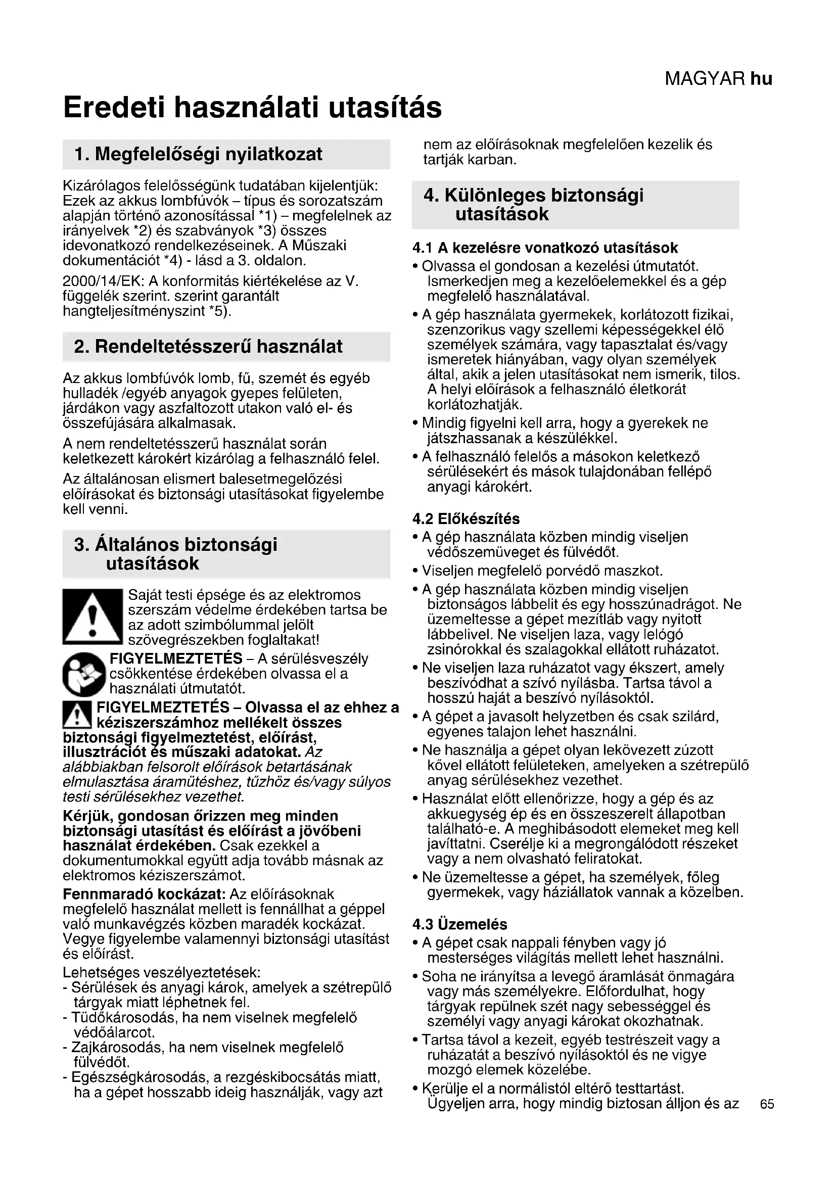 Eredeti használati utasítás Kizárólagos felelősségünk tudatában kijelentjük: Ezek az akkus lombfúvók – típus és sorozatszám alapján történő azonosítással *1) – megfelelnek az irányelvek *2) és szabványok *3) összes idevonatkozó rendelkezéseinek. A Műszaki dokumentációt *4) - lásd a 3. oldalon. 2000/14/EK: A konformitás kiértékelése az V. függelék szerint. szerint garantált hangteljesítményszint *5). Az akkus lombfúvók lomb, fű, szemét és egyéb hulladék /egyéb anyagok gyepes felületen, járdákon vagy aszfaltozott utakon való el- és összefújására alkalmasak. A nem rendeltetésszerű használat során keletkezett károkért kizárólag a felhasználó felel. Az általánosan elismert balesetmegelőzési előírásokat és biztonsági utasításokat figyelembe kell venni. Saját testi épsége és az elektromos szerszám védelme érdekében tartsa be az adott szimbólummal jelölt szövegrészekben foglaltakat! FIGYELMEZTETÉS – A sérülésveszély csökkentése érdekében olvassa el a használati útmutatót. FIGYELMEZTETÉS – Olvassa el az ehhez a kéziszerszámhoz mellékelt összes biztonsági figyelmeztetést, előírást, illusztrációt és műszaki adatokat. Az alábbiakban felsorolt előírások betartásának elmulasztása áramütéshez, tűzhöz és/vagy súlyos testi sérülésekhez vezethet. Kérjük, gondosan őrizzen meg minden biztonsági utasítást és előírást a jövőbeni használat érdekében. Csak ezekkel a dokumentumokkal együtt adja tovább másnak az elektromos kéziszerszámot. Fennmaradó kockázat: Az előírásoknak megfelelő használat mellett is fennállhat a géppel való munkavégzés közben maradék kockázat. Vegye figyelembe valamennyi biztonsági utasítást és előírást. Lehetséges veszélyeztetések: - Sérülések és anyagi károk, amelyek a szétrepülő tárgyak miatt léphetnek fel. - Tüdőkárosodás, ha nem viselnek megfelelő védőálarcot. - Zajkárosodás, ha nem viselnek megfelelő fülvédőt. - Egészségkárosodás, a rezgéskibocsátás miatt, ha a gépet hosszabb ideig használják, vagy azt nem az előírásoknak megfelelően kezelik és tartják karban.