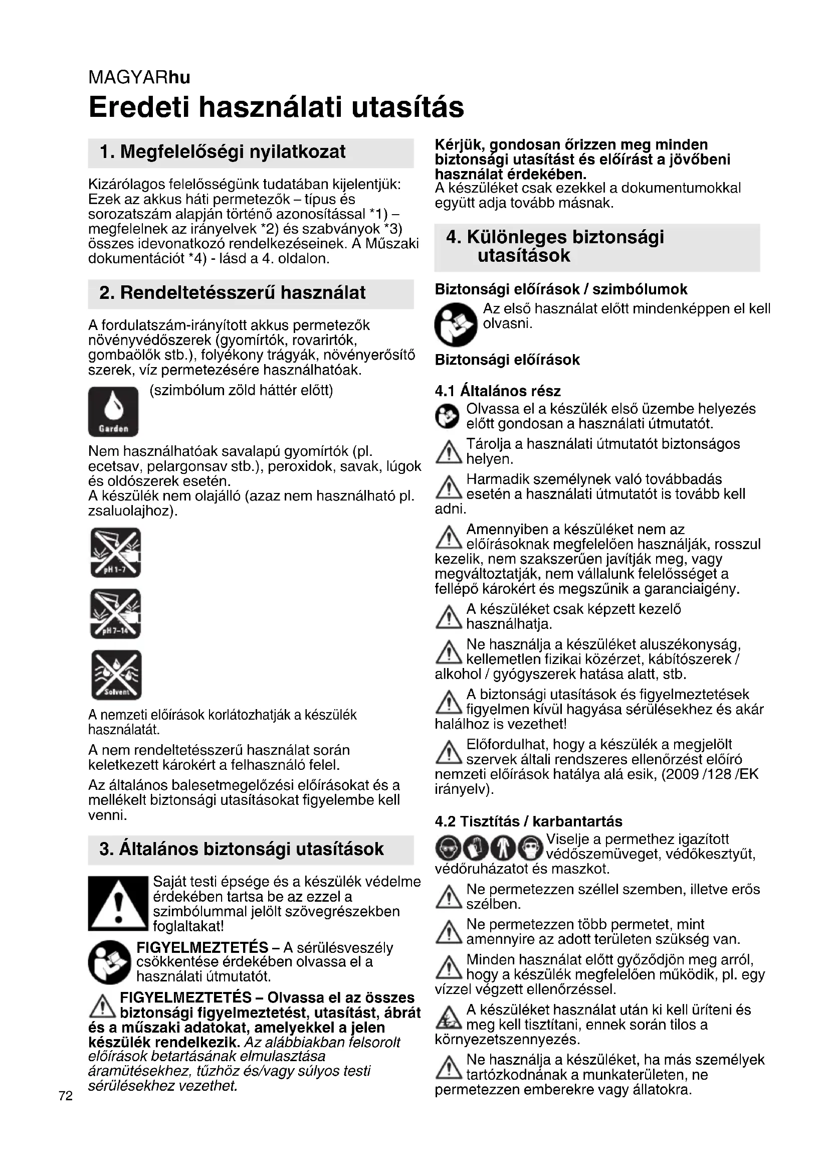 Eredeti használati utasítás Kizárólagos felelősségünk tudatában kijelentjük: Ezek az akkus háti permetezők – típus és sorozatszám alapján történő azonosítással *1) – megfelelnek az irányelvek *2) és szabványok *3) összes idevonatkozó rendelkezéseinek. A Műszaki dokumentációt *4) - lásd a 4. oldalon. A fordulatszám-irányított akkus permetezők növényvédőszerek (gyomírtók, rovarirtók, gombaölők stb.), folyékony trágyák, növényerősítő szerek, víz permetezésére használhatóak. (szimbólum zöld háttér előtt) Nem használhatóak savalapú gyomírtók (pl. ecetsav, pelargonsav stb.), peroxidok, savak, lúgok és oldószerek esetén. A készülék nem olajálló (azaz nem használható pl. zsaluolajhoz). A nemzeti előírások korlátozhatják a készülék használatát. A nem rendeltetésszerű használat során keletkezett károkért a felhasználó felel. Az általános balesetmegelőzési előírásokat és a mellékelt biztonsági utasításokat figyelembe kell venni. Saját testi épsége és a készülék védelme érdekében tartsa be az ezzel a szimbólummal jelölt szövegrészekben foglaltakat! FIGYELMEZTETÉS – A sérülésveszély csökkentése érdekében olvassa el a használati útmutatót. FIGYELMEZTETÉS – Olvassa el az összes biztonsági figyelmeztetést, utasítást, ábrát és a műszaki adatokat, amelyekkel a jelen készülék rendelkezik. Az alábbiakban felsorolt előírások betartásának elmulasztása áramütésekhez, tűzhöz és/vagy súlyos testi sérülésekhez vezethet. Kérjük, gondosan őrizzen meg minden biztonsági utasítást és előírást a jövőbeni használat érdekében. A készüléket csak ezekkel a dokumentumokkal együtt adja tovább másnak. Biztonsági előírások / szimbólumok Az első használat előtt mindenképpen el kell olvasni. Biztonsági előírások