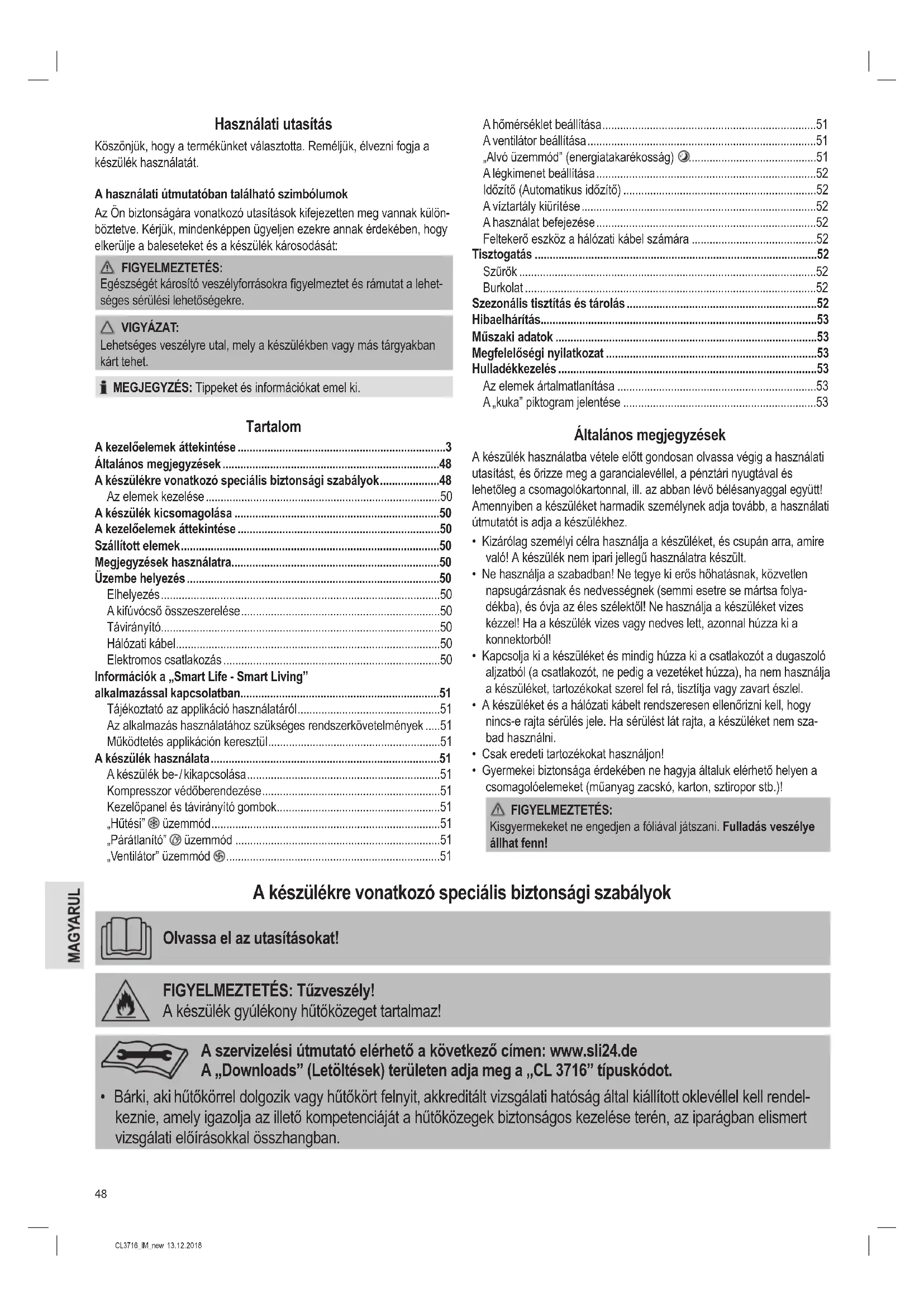 - Gyermekei biztonsága érdekében ne hagyja általuk elérhető helyen a csomagolóelemeket (műanyag zacskó, karton, sztiropor stb.)! FIGYELMEZTETÉS: Kisgyermekeket ne engedjen a fóliával játszani. Fulladás veszélye állhat fenn! A készülékre vonatkozó speciális biztonsági szabályok Olvassa el az utasításokat! FIGYELMEZTETÉS: Tűzveszély! A készülék gyúlékony hűtőközeget tartalmaz! A szervizelési útmutató elérhető a következő címen: www.sli24.de A „Downloads” (Letöltések) területen adja meg a „CL 3716” típuskódot.