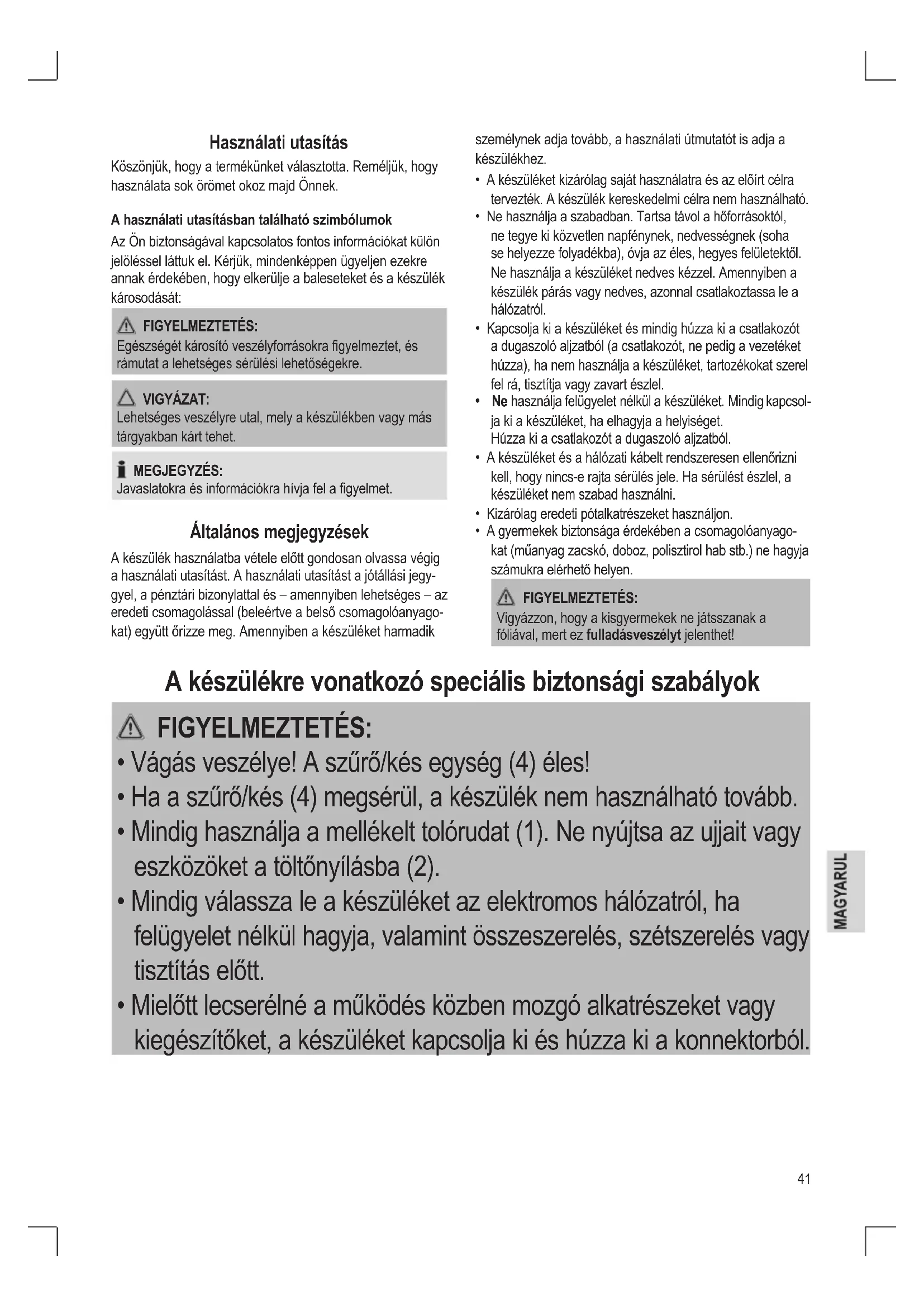 Usuwanie Znaczenie symbolu „Pojemnik na śmieci“ Należy zadbać o środowisko i nie wyrzucać urządzeń elek- trycznych razem z odpadami gospodarstwa domowego. Stare lub uszkodzone urządzenia elektryczne należy odsta- wić do miejskich punktów zbiórki. Prosimy unikać potencjalnych zagrożeń dla zdrowia i środo- wiska poprzez nieprawidłowe metody utylizacji odpadów. Przyczyniasz się do recyklingu i innych form utylizacji zuży- tych urządzeń elektrycznych i elektronicznych. Informacje na temat punktów zbiórki znajdują się na terenie danego miasta.41 Használati utasítás Köszönjük, hogy a termékünket választotta. Reméljük, hogy használata sok örömet okoz majd Önnek. A használati utasításban található szimbólumok Az Ön biztonságával kapcsolatos fontos információkat külön jelöléssel láttuk el. Kérjük, mindenképpen ügyeljen ezekre annak érdekében, hogy elkerülje a baleseteket és a készülék károsodását: FIGYELMEZTETÉS: Egészségét károsító veszélyforrásokra gyelmeztet, és rámutat a lehetséges sérülési lehetőségekre. VIGYÁZAT: Lehetséges veszélyre utal, mely a készülékben vagy más tárgyakban kárt tehet. MEGJEGYZÉS: Javaslatokra és információkra hívja fel a gyelmet. Általános megjegyzések A készülék használatba vétele előtt gondosan olvassa végig a használati utasítást. A használati utasítást a jótállási jegy- gyel, a pénztári bizonylattal és – amennyiben lehetséges – az eredeti csomagolással (beleértve a belső csomagolóanyago- kat) együtt őrizze meg. Amennyiben a készüléket harmadik személynek adja tovább, a használati útmutatót is adja a készülékhez.