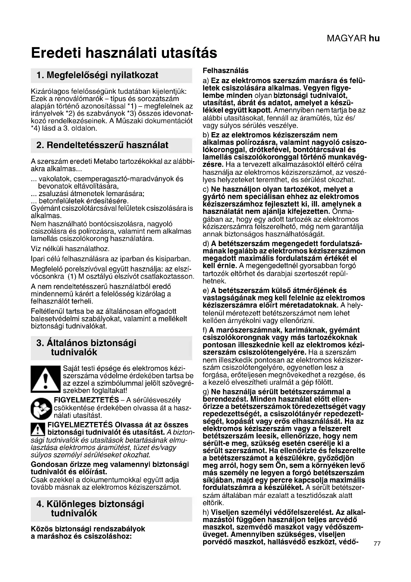 Eredeti használati utasítás Kizárólagos felelősségünk tudatában kijelentjük: Ezek a renoválómarók – típus és sorozatszám alapján történő azonosítással *1) – megfelelnek az irányelvek *2) és szabványok *3) összes idevonat- kozó rendelkezéseinek. A Műszaki dokumentációt *4) lásd a 3. oldalon. A szerszám eredeti Metabo tartozékokkal az alábbi- akra alkalmas... ... vakolatok, csemperagasztó-maradványok és bevonatok eltávolítására, ... zsaluzási átmenetek lemarására; ... betonfelületek érdesítésére. Gyémánt csiszolótárcsával felületek csiszolására is alkalmas. Nem használható bontócsiszolásra, nagyoló csiszolásra és polírozásra, valamint nem alkalmas lamellás csiszolókorong használatára. Víz nélküli használathoz. Ipari célú felhasználásra az iparban és kisiparban. Megfelelő porelszívóval együtt használja: az elszí- vócsonkra (1) M osztályú elszívót csatlakoztasson. A nem rendeltetésszerű használatból eredő mindennemű kárért a felelősség kizárólag a felhasználót terheli. Feltétlenül tartsa be az általánosan elfogadott balesetvédelmi szabályokat, valamint a mellékelt biztonsági tudnivalókat. Saját testi épsége és elektromos kézi- szerszáma védelme érdekében tartsa be az ezzel a szimbólummal jelölt szövegré- szekben foglaltakat! FIGYELMEZTETÉS – A sérülésveszély csökkentése érdekében olvassa át a hasz- nálati utasítást. FIGYELMEZTETÉS Olvassa át az összes biztonsági tudnivalót és utasítást. A bizton- sági tudnivalók és utasítások betartásának elmu- lasztása elektromos áramütést, tüzet és/vagy súlyos személyi sérüléseket okozhat. Gondosan őrizze meg valamennyi biztonsági tudnivalót és előírást. Csak ezekkel a dokumentumokkal együtt adja tovább másnak az elektromos kéziszerszámot. Közös biztonsági rendszabályok a maráshoz és csiszoláshoz: Felhasználás a) Ez az elektromos szerszám marásra és felü- letek csiszolására alkalmas. Vegyen figye- lembe minden olyan biztonsági tudnivalót, utasítást, ábrát és adatot, amelyet a készü- lékkel együtt kapott. Amennyiben nem tartja be az alábbi utasításokat, fennáll az áramütés, tűz és/ vagy súlyos sérülés veszélye. b) Ez az elektromos kéziszerszám nem alkalmas polírozásra, valamint nagyoló csiszo- lókoronggal, drótkefével, bontótárcsával és lamellás csiszolókoronggal történő munkavég- zésre. Ha a tervezett alkalmazásoktól eltérő célra használja az elektromos kéziszerszámot, az veszé- lyes helyzeteket teremthet, és sérülést okozhat. c) Ne használjon olyan tartozékot, melyet a gyártó nem speciálisan ehhez az elektromos kéziszerszámhoz fejlesztett ki, ill. amelynek a használatát nem ajánlja kifejezetten. Önma- gában az, hogy egy adott tartozék az elektromos kéziszerszámra felszerelhető, még nem garantálja annak biztonságos használhatóságát. d) A betétszerszám megengedett fordulatszá- mának legalább az elektromos kéziszerszámon megadott maximális fordulatszám értékét el kell érnie. A megengedettnél gyorsabban forgó tartozék eltörhet és darabjai szerteszét repül- hetnek. e) A betétszerszám külső átmérőjének és vastagságának meg kell felelnie az elektromos kéziszerszámra előírt méretadatoknak. A hely- telenül méretezett betétszerszámot nem lehet kellően árnyékolni vagy ellenőrizni. f) A marószerszámnak, karimáknak, gyémánt csiszolókorongnak vagy más tartozékoknak pontosan illeszkednie kell az elektromos kézi- szerszám csiszolótengelyére. Ha a szerszám nem illeszkedik pontosan az elektromos kéziszer- szám csiszolótengelyére, egyenetlen lesz a forgása, erőteljesen megnövekedhet a rezgése, és a kezelő elveszítheti uralmát a gép fölött. g) Ne használja sérült betétszerszámmal a berendezést. Minden használat előtt ellen- őrizze a betétszerszámok töredezettségét vagy repedezettségét, a csiszolótányér repedezett- ségét, kopását vagy erős elhasználását. Ha az elektromos kéziszerszám vagy a felszerelt betétszerszám leesik, ellenőrizze, hogy nem sérült-e meg, szükség esetén cserélje ki a sérült szerszámot. Ha ellenőrizte és felszerelte a betétszerszámot a készülékre, győz ődjön meg arról, hogy sem Ön, sem a környéken levő más személy ne legyen a forgó betétszerszám síkjában, majd egy percre kapcsolja maximális fordulatszámra a készüléket. A sérült betétszer- szám általában már ezalatt a tesztidőszak alatt eltörik. h) Viseljen személyi védőfelszerelést. Az alkal- mazástól függően használjon teljes arcvédő maszkot, szemvédő maszkot vagy védőszem- üveget. Amennyiben szükséges, viseljen porvédő maszkot, hallásvédő eszközt, védő-