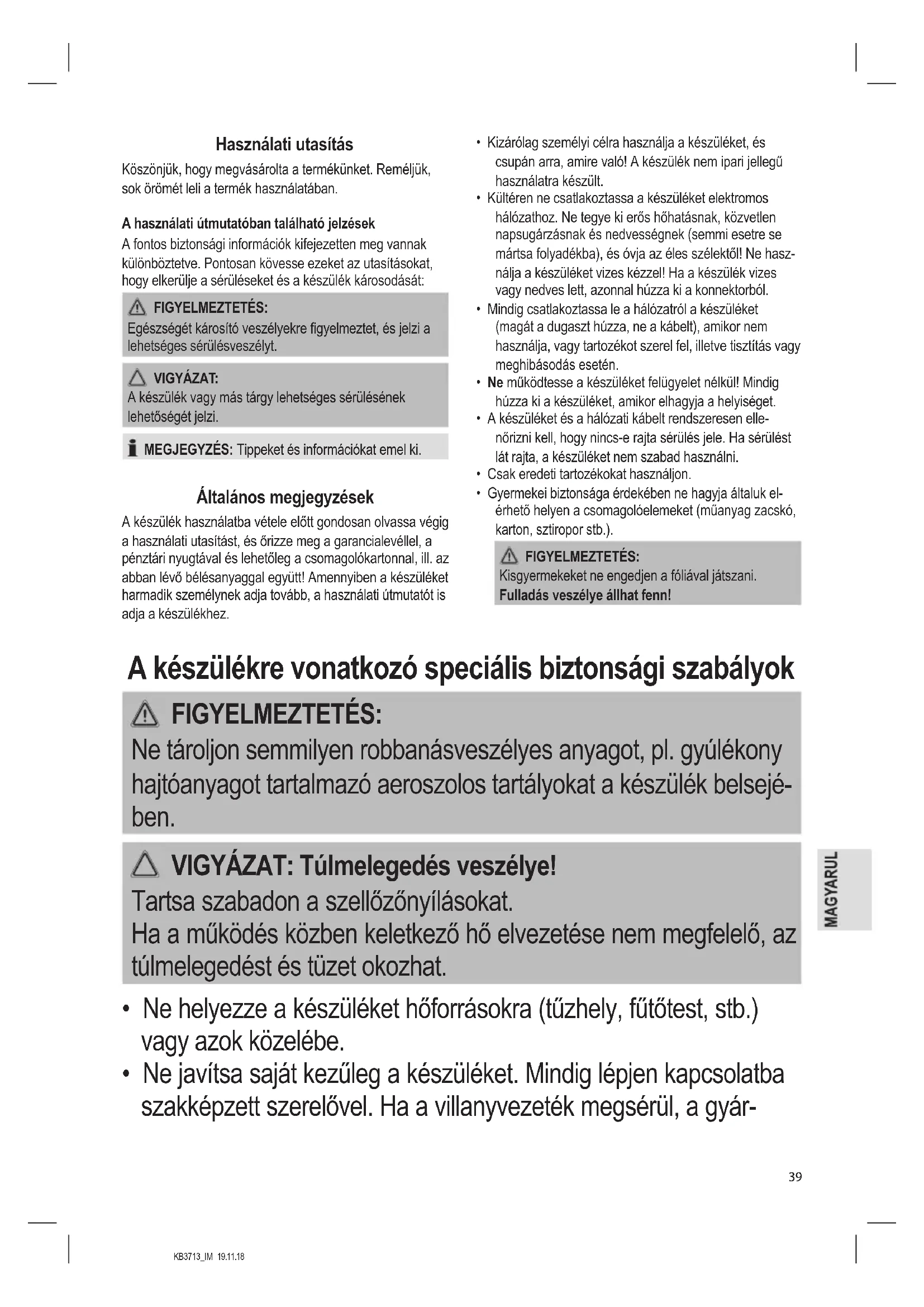 - Ne javítsa saját kezűleg a készüléket. Mindig lépjen kapcsolatba szakképzett szerelővel. Ha a villanyvezeték megsérül, a gyár-KB3713_IM 19.11.18