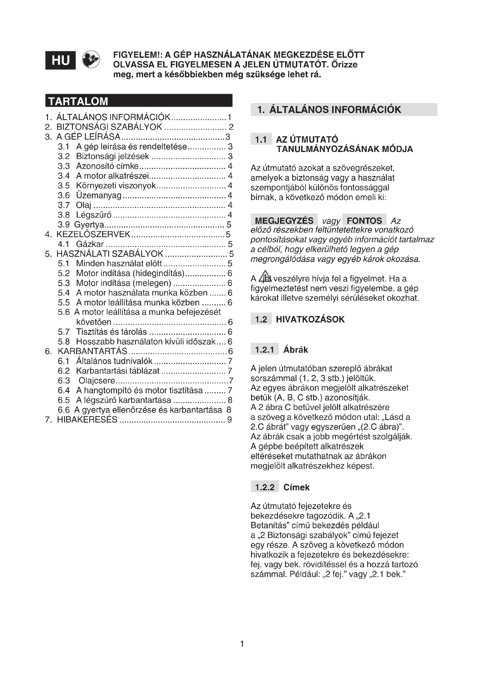 A gép használatának megkezdése előtt olvassa el gyelmesen a jelen utasításokat. Ismerkedjen meg a kezelőszervek és a gép működésével. Tanulja meg, hogyan lehet a motort gyorsan leállítani. A gyelmeztetések és utasítások megszegése súlyos károkat illetve sérüléseket okozhat. Őrizze meg az útmutatót egy későbbi konzultáció céljából.