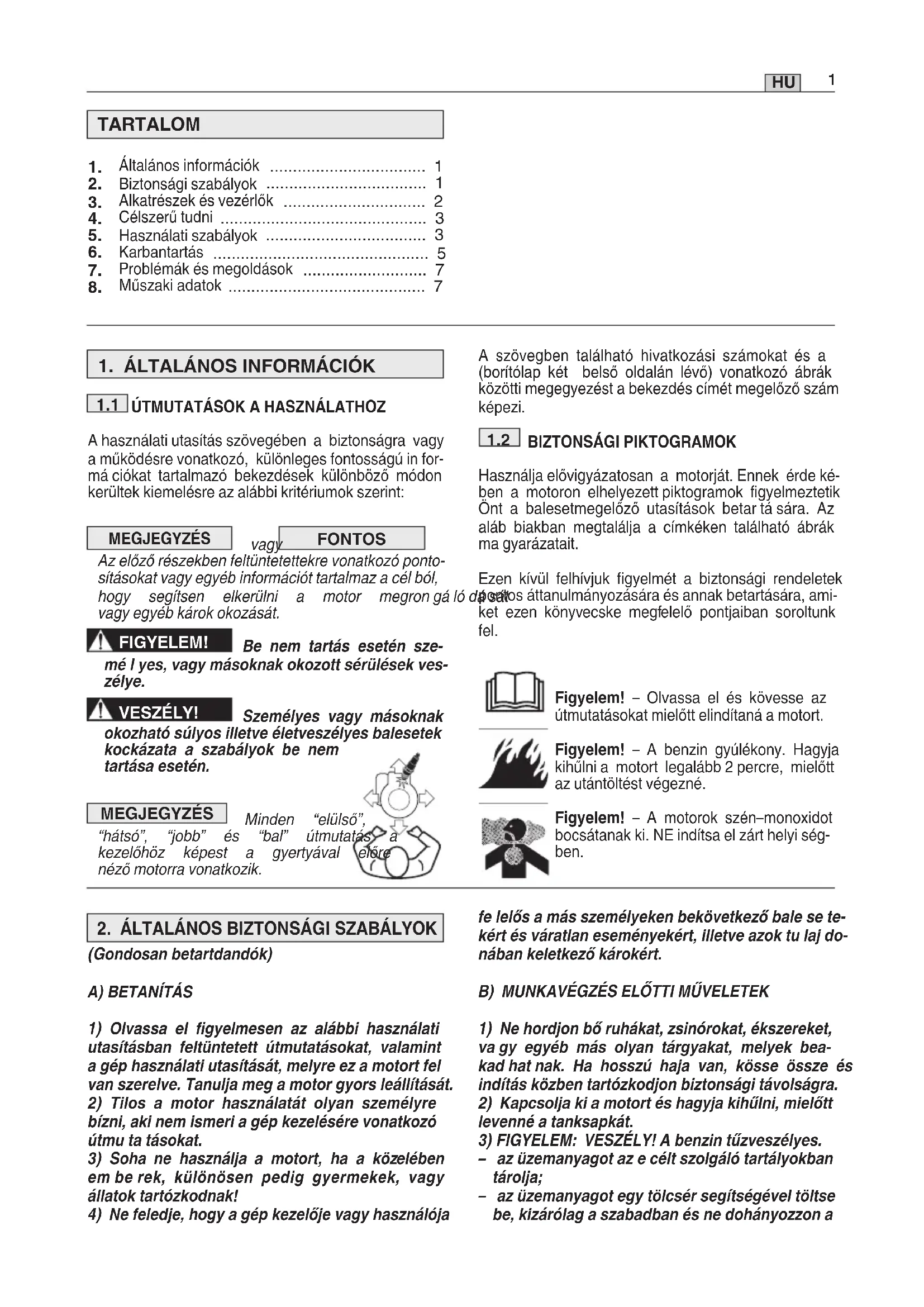 A használati utasítás szövegében a biztonságra vagy a működésre vonatkozó, különleges fontosságú in for- má ciókat tartalmazó bekezdések különböző módon kerültek kiemelésre az alábbi kritériumok szerint: MEGJEGYZÉS vagy FONTOS Azelőzőrészekbenfeltüntetettekrevonatkozóponto- sításokatvagyegyébinformációttartalmazacélból, hogy segítsen elkerülni a motor megrongálódását vagyegyébkárokokozását. FIGYELEM! Be nem tartás esetén sze mé l yes, vagy másoknak okozott sérülések ves zélye. VESZÉLY! Személyes vagy másoknak okozható súlyos illetve életveszélyes balesetek kockázata a szabályok be nem tartása esetén. MEGJEGYZÉS Minden “elülső”, “hátsó”, “jobb” és “bal” útmutatás a kezelőhöz képest a gyertyával előre nézőmotorravonatkozik. TARTALOM
