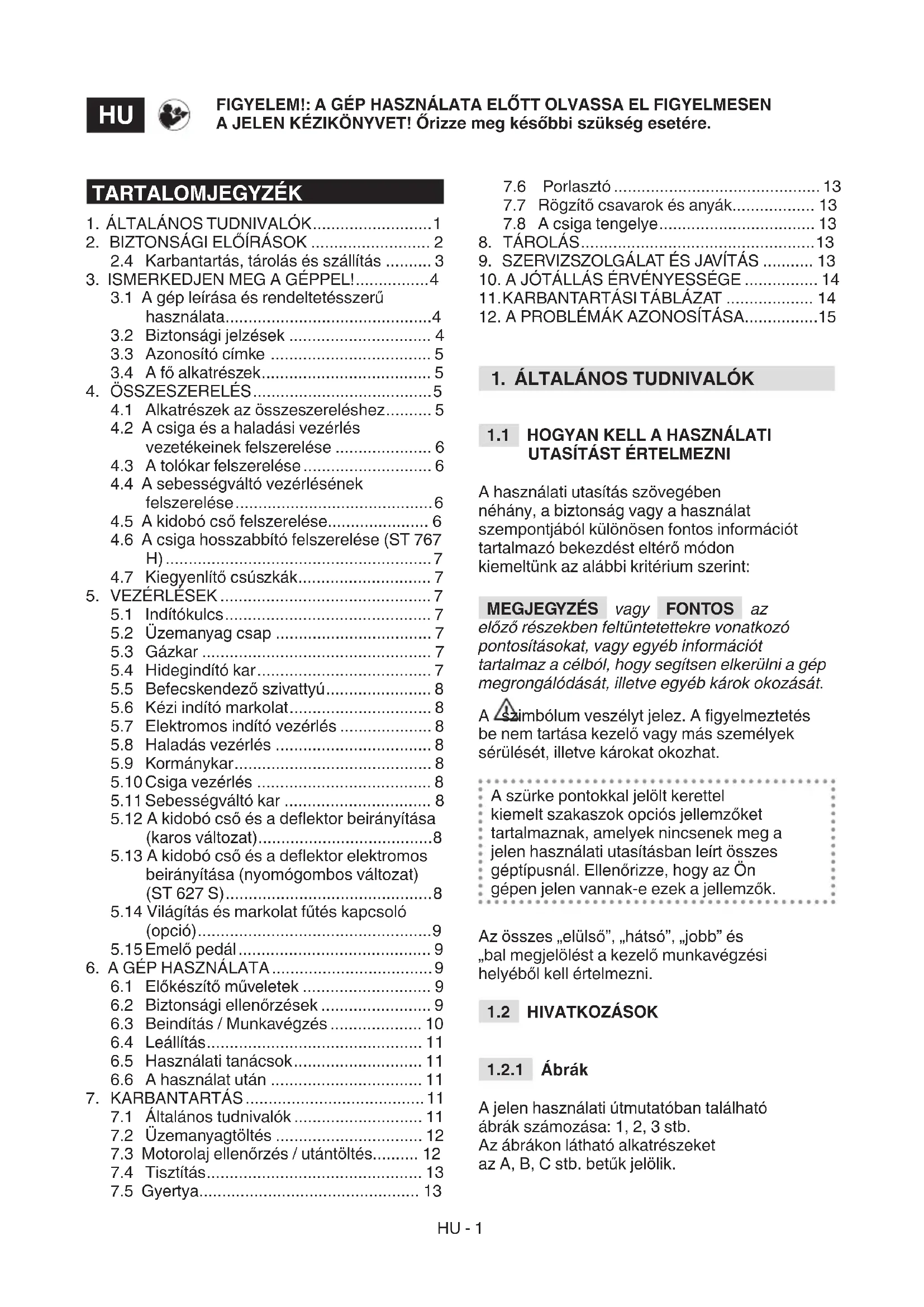 Olvassa el gyelmesen a jelen utasításokat gép használata előtt! Ismerje meg a kezelőszerveket, és sajátítsa el e gép kezelését. Tanulja meg a motor gyors leállítását. A gyelmeztetések és az utasítások be nem tartása tűzesethez és/vagy súlyos sérülésekhez vezethet. Őrizzen meg minden gyelmeztetést és útmutatást, hogy a későbbiekben is át tudja őket tekinteni.