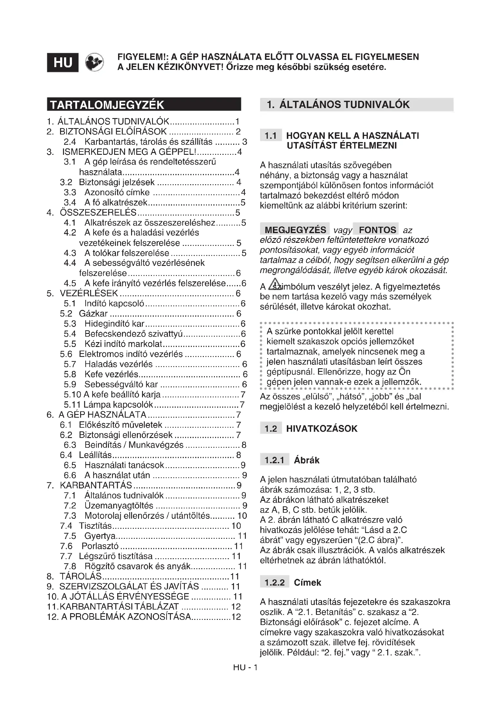 A használati utasítás fejezetekre és szakaszokra oszlik. A “2.1. Betanítás” c. szakasz a “2. Biztonsági előírások” c. fejezet alcíme. A címekre vagy szakaszokra való hivatkozásokat a számozott szak. illetve fej. rövidítések jelölik. Például: “2. fej.” vagy “ 2.1. szak.”. FIGYELEM!: A GÉP HASZNÁLATA ELŐTT OLVASSA EL FIGYELMESEN A JELEN KÉZIKÖNYVET! Őrizze meg későbbi szükség esetére.