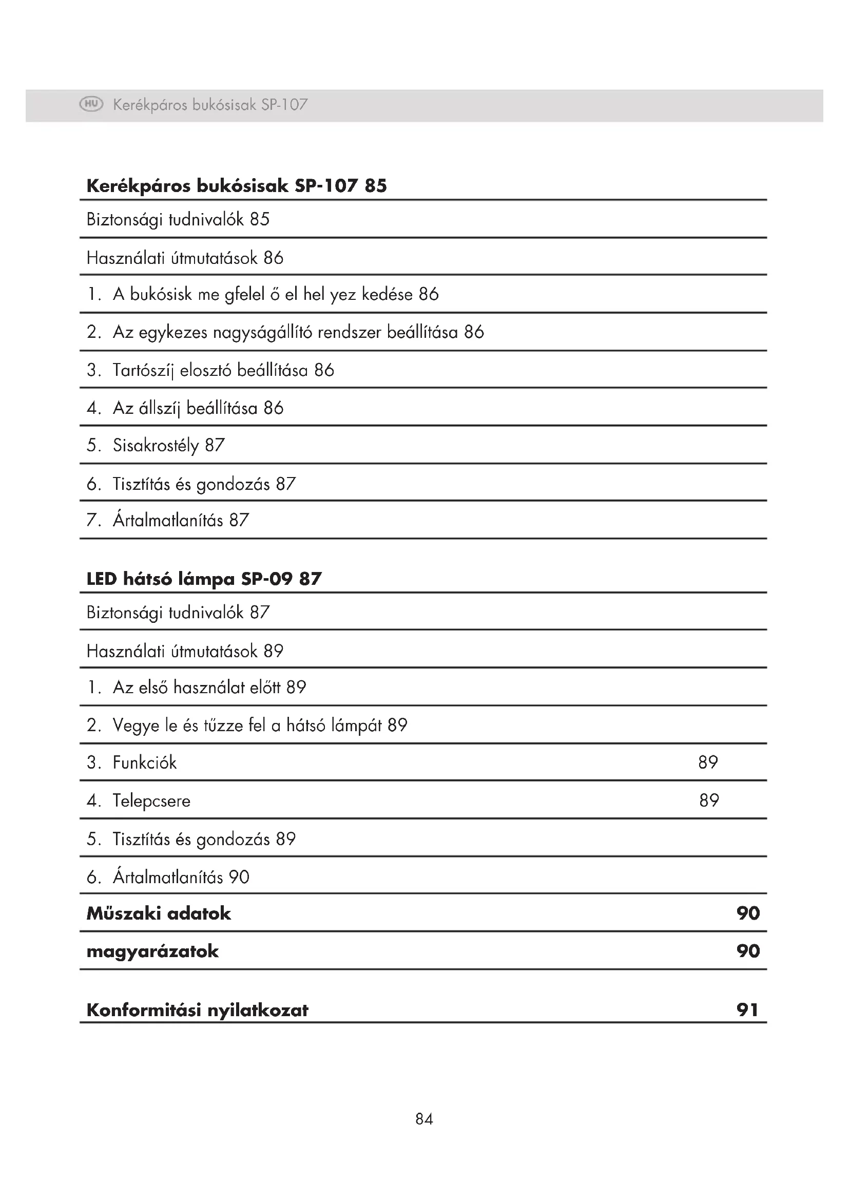 LED hátsó lámpa SP-09 87 Biztonsági tudnivalók 87 Használati útmutatások 89