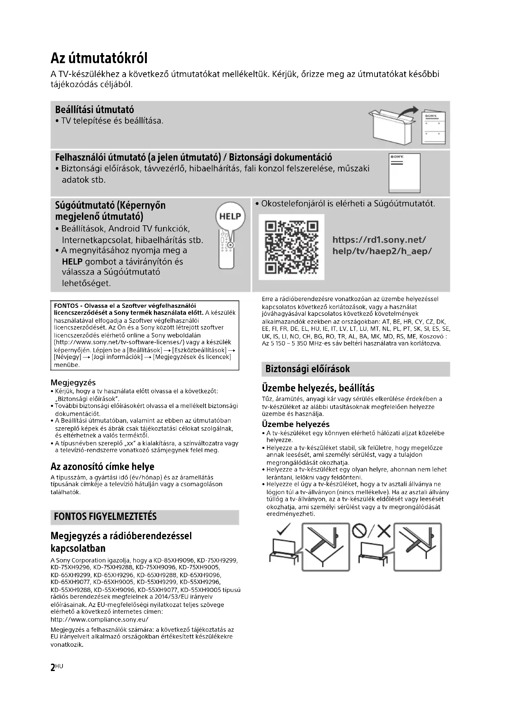 Megjegyzés a rádióberendezéssel kapcsolatban A Sony Corporation igazolja, hogy a KD-85XH9096, KD-75XH9299, KD-75XH9296, KD-75XH9288, KD-75XH9096, KD-75XH9005, KD-65XH9299, KD-65XH9296, KD-65XH9288, KD-65XH9096, KD-65XH9077, KD-65XH9005, KD-55XH9299, KD-55XH9296, KD-55XH9288, KD-55XH9096, KD-55XH9077, KD-55XH9005 típusú rádiós berendezések megfelelnek a 2014/53/EU irányelv előírásainak. Az EU-megfelelőségi nyilatkozat teljes szövege elérhető a következő internetes címen: http://www.compliance.sony.eu/Megjegyzés a felhasználók számára: a következő tájékoztatás az EU irányelveit alkalmazó országokban értékesített készülékekre vonatkozik.Erre a rádióberendezésre vonatkozóan az üzembe helyezéssel kapcsolatos következő korlátozások, vagy a használat jóváhagyásával kapcsolatos következő követelmények alkalmazandók ezekben az országokban: AT, BE, HR, CY, CZ, DK, EE, FI, FR, DE, EL, HU, IE, IT, LV, LT, LU, MT, NL, PL, PT, SK, SI, ES, SE, UK, IS, LI, NO, CH, BG, RO, TR, AL, BA, MK, MD, RS, ME, Koszovó : Az 5 150 – 5 350 MHz-es sáv beltéri használatra van korlátozva. Biztonsági előírások Üzembe helyezés, beállítás Tűz, áramütés, anyagi kár vagy sérülés elkerülése érdekében a tv-készüléket az alábbi utasításoknak megfelelően helyezze üzembe és használja. Üzembe helyezés