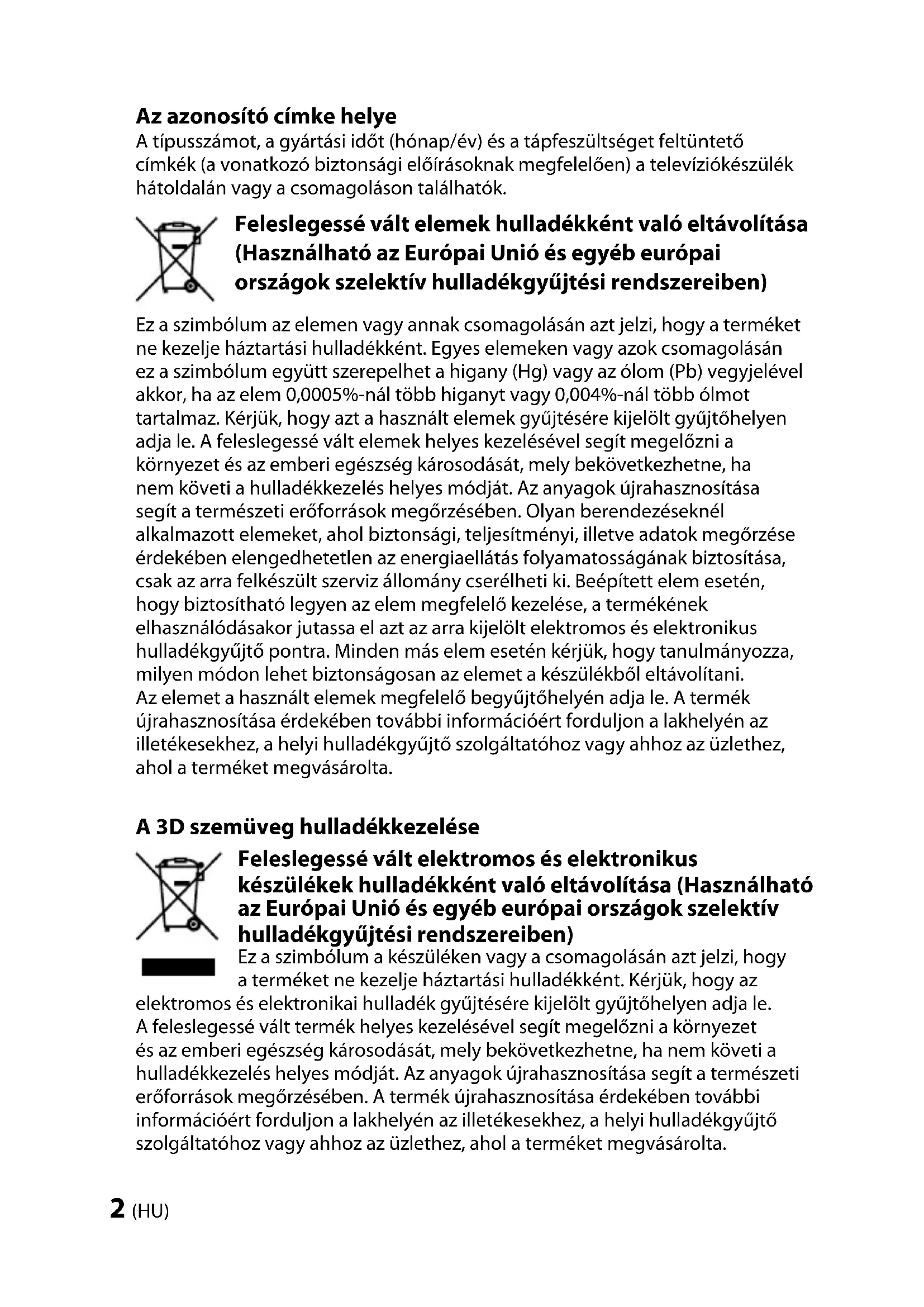 2 (HU) TDG-BR750 4-417-747-22(1) TDG-BR750 4-417-747-22(1) Az azonosító címke helye A típusszámot, a gyártási időt (hónap/év) és a tápfeszültséget feltüntető címkék (a vonatkozó biztonsági előírásoknak megfelelően) a televíziókészülék hátoldalán vagy a csomagoláson találhatók. Feleslegessé vált elemek hulladékként való eltávolítása (Használható az Európai Unió és egyéb európai országok szelektív hulladékgyűjtési rendszereiben) Ez a szimbólum az elemen vagy annak csomagolásán azt jelzi, hogy a terméket ne kezelje háztartási hulladékként. Egyes elemeken vagy azok csomagolásán ez a szimbólum együtt szerepelhet a higany (Hg) vagy az ólom (Pb) vegyjelével akkor, ha az elem 0,0005%-nál több higanyt vagy 0,004%-nál több ólmot tartalmaz. Kérjük, hogy azt a használt elemek gyűjtésére kijelölt gyűjtőhelyen adja le. A feleslegessé vált elemek helyes kezelésével segít megelőzni a környezet és az emberi egészség károsodását, mely bekövetkezhetne, ha nem követi a hulladékkezelés helyes módját. Az anyagok újrahasznosítása segít a természeti erőforrások megőrzésében. Olyan berendezéseknél alkalmazott elemeket, ahol biztonsági, teljesítményi, illetve adatok megőrzése érdekében elengedhetetlen az energiaellátás folyamatosságának biztosítása, csak az arra felkészült szerviz állomány cserélheti ki. Beépített elem esetén, hogy biztosítható legyen az elem megfelelő kezelése, a termékének elhasználódásakor jutassa el azt az arra kijelölt elektromos és elektronikus hulladékgyűjtő pontra. Minden más elem esetén kérjük, hogy tanulmányozza, milyen módon lehet biztonságosan az elemet a készülékből eltávolítani. Az elemet a használt elemek megfelelő begyűjtőhelyén adja le. A termék újrahasznosítása érdekében további információért forduljon a lakhelyén az illetékesekhez, a helyi hulladékgyűjtő szolgáltatóhoz vagy ahhoz az üzlethez, ahol a terméket megvásárolta. A 3D szemüveg hulladékkezelése Feleslegessé vált elektromos és elektronikus készülékek hulladékként való eltávolítása (Használható az Európai Unió és egyéb európai országok szelektív hulladékgyűjtési rendszereiben) Ez a szimbólum a készüléken vagy a csomagolásán azt jelzi, hogy a terméket ne kezelje háztartási hulladékként. Kérjük, hogy az elektromos és elektronikai hulladék gyűjtésére kijelölt gyűjtőhelyen adja le. A feleslegessé vált termék helyes kezelésével segít megelőzni a környezet és az emberi egészség károsodását, mely bekövetkezhetne, ha nem követi a hulladékkezelés helyes módját. Az anyagok újrahasznosítása segít a természeti erőforrások megőrzésében. A termék újrahasznosítása érdekében további információért forduljon a lakhelyén az illetékesekhez, a helyi hulladékgyűjtő szolgáltatóhoz vagy ahhoz az üzlethez, ahol a terméket megvásárolta.TDG-BR750 4-417-747-22(1) 3 (HU) TDG-BR750 4-417-747-22(1) Ezt a terméket a Sony Corporation (108-0075 Japán, Tokió, 1-7-1 Konan, Minato-ku) gyártotta. A termékbiztonsággal és az EMC irányelvekkel kapcsolatban a Sony Deutschland GmbH (Németország, 70327 Stuttgart, Hedelfinger Strasse 61.) a jogosult képviselő. Kérjük, bármely szervizeléssel vagy garanciával kapcsolatos ügyben, a különálló szerviz- vagy garanciadokumentumokban megadott címekhez forduljon. Vigyázat! Személyes biztonsága és az anyagi kár elkerülése érdekében, kérjük, olvassa el a biztonsági utasításokat. Figyelmeztetés Ne dobja tűzbe a 3D szemüveget. Ne szerelje szét a 3D szemüveget. A 3D szemüveget ne használja, ne töltse, ne tárolja és ne hagyja tűz közelében, illetve magas hőmérsékletnek kitett helyeken, például tűző napon vagy napon álló autóban. Csak a mellékelt USB-kábelt használja. A 3D szemüveget csak Sony gyártmányú 3D televíziókészülékkel vagy az ajánlott USB-töltő hálózati adapterrel töltse. A 3D technológiával kompatibilis Sony gyártmányú készülékekkel kapcsolatban további részleteket a készülékhez mellékelt használati útmutatóban talál. Ne jusson víz vagy más idegen anyag a 3D szemüvegbe. Használati óvintézkedések A 3D szemüveg működését a 3D vezérlő által küldött infravörös jelek biztosítják. Helytelen működés következhet be, ha: A 3D szemüveg nem a 3D vezérlő felé néz Ha valamilyen tárgy található a 3D szemüveg és a 3D vezérlő között Ha a közelben más infravörös kommunikációt használó készülék, fűtőberendezés stb. működik, ezek hatással lehetnek a készülék működésére. A TV-készüléket a 3D szemüveg használatával, a készülékkel pontosan szembe fordulva nézze. Fekvő helyzetben, vagy ha a fejét oldalra dönti, a 3D-hatás nem lesz megfelelő, a képernyő színei pedig megváltoznak. Biztonsági előírások A terméket csak kompatibilis Sony-készülékkel, 3D videoképek megtekintésére használja.