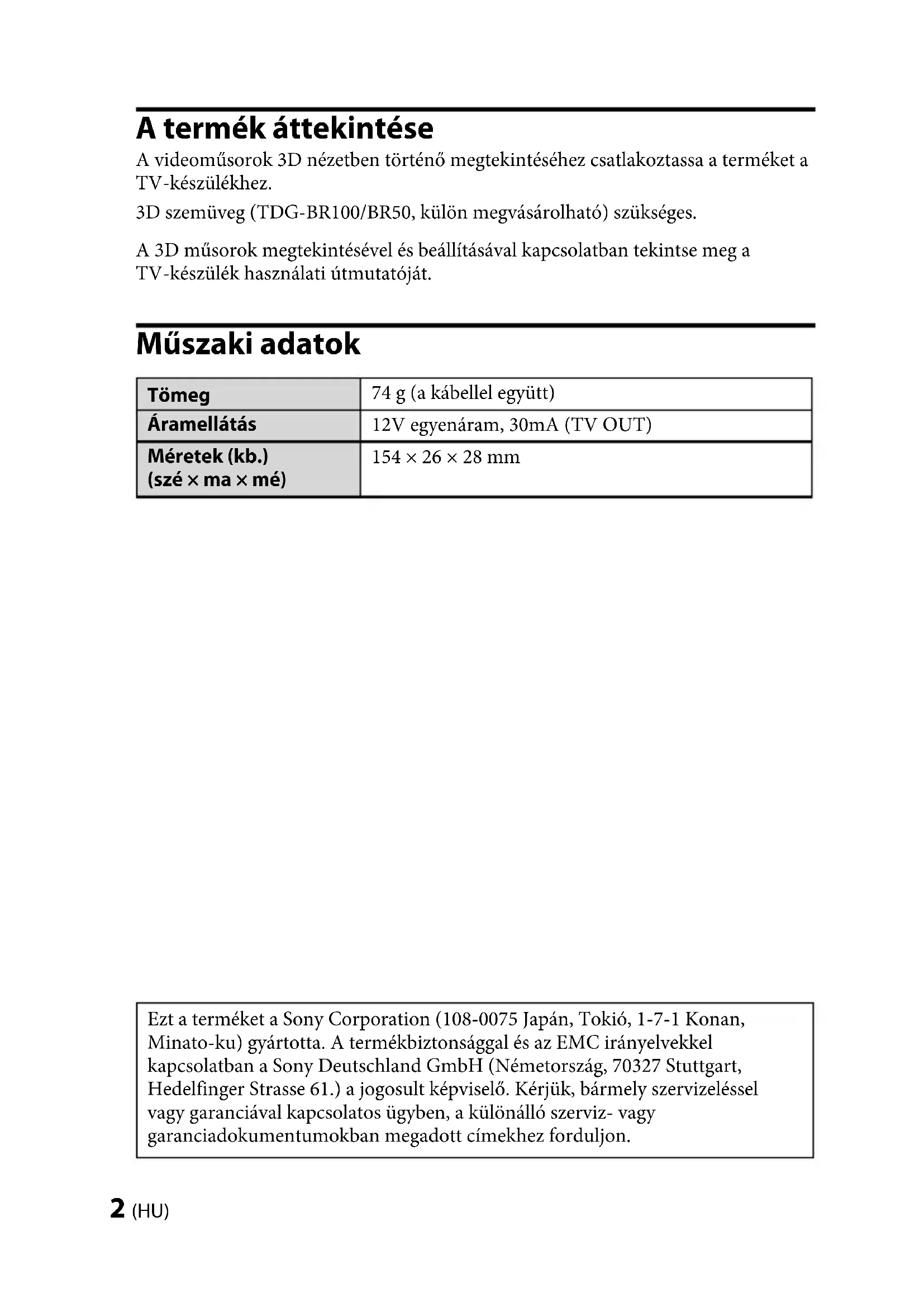 A 3D vezérlő hulladékkezelése Feleslegessé vált elektromos és elektronikus készülékek hulladékként való eltávolítása (Használható az Európai Unió és egyéb európai országok szelektív hulladékgyűjtési rendszereiben) Ez a szimbólum a készüléken vagy a csomagolásán azt jelzi, hogy a terméket ne kezelje háztartási hulladékként. Kérjük, hogy az elektromos és elektronikai hulladék gyűjtésére kijelölt gyűjtőhelyen adja le. A feleslegessé vált termékének helyes kezelésével segít megelőzni a környezet és az emberi egészség károsodását, mely bekövetkezhetne, ha nem követi a hulladékkezelés helyes módját. Az anyagok újrahasznosítása segít a természeti erőforrások megőrzésében. A termék újrahasznosítása érdekében további információért forduljon a lakhelyén az illetékesekhez, a helyi hulladékgyűjtő szolgáltatóhoz vagy ahhoz az üzlethez, ahol a terméket megvásárolta.TMR-BR100 4-180-471-26(1) 4 (HU) TMR-BR100 4-180-471-26(1) Vigyázat! Személyes biztonsága és az anyagi kár elkerülése érdekében, kérjük, olvassa el a biztonsági utasításokat. Használati óvintézkedések A 3D szemüveg infravörös hullámokat fogad a 3D vezérlőtől. Ha a közelben más infravörös kommunikációt használó készülék, fűtőberendezés stb. működik, ezek hatással lehetnek a készülék működésére. A 3D videoképek megtekintésekor győződjön meg arról, hogy a videót a megadott vételi távolságon belül tekinti meg. (Lásd „A 3D vezérlő és a 3D szemüveg kommunikációs távolsága” című részben látható ábrát.) Ha a 3D szemüveget a megadott távolságon kívül használja, előfordulhat, hogy a videót nem tudja 3D nézetben megtekinteni. A 3D vezérlőtől érkező jel befolyásolhatja az infravörös távvezérlő működését. Ebben az esetben módosítsa a 3D vezérlő helyzetét. Biztonsági előírások A terméket csak kompatibilis Sony-készülékkel, 3D videoképek megtekintésére használja. Egyes nézők a termék használata során kényelmetlen érzést (például a szem túlerőltetését, fáradását vagy émelygést) tapasztalhatnak. A Sony azt javasolja, hogy a 3D videoképek megtekintése vagy a térhatású 3D játékok használata során minden néző tartson rendszeres szüneteket. A szükséges szünetek hossza és gyakorisága személyenként eltérhet. A legjobb megoldást a felhasználónak kell megtalálnia. Ha kényelmetlen érzést tapasztal, függessze fel a termék használatát, a 3D videoképek megtekintését, amíg a kellemetlen érzés el nem múlik, és szükség esetén forduljon orvoshoz. Tekintse át (i) a TV-készülék, illetve a TV-készülékkel együtt használt más eszközök és adathordozók használati útmutatóját is és (ii) a legújabb információkért keresse fel weboldalunkat (http://www.sony-europe.com/myproduct). A kisgyerekek látása (különösen a hat év alattiaké) még fejlődésben van. Mielőtt kisgyermekének engedélyezné a 3D videoképek vagy térhatású 3D játékok megtekintését, forduljon orvosához (gyermekorvosához vagy szemészéhez). Szülői felügyelettel biztosítani kell, hogy a kisgyerekek betartsák a fenti ajánlásokat. Ne ejtse le és ne módosítsa a terméket.