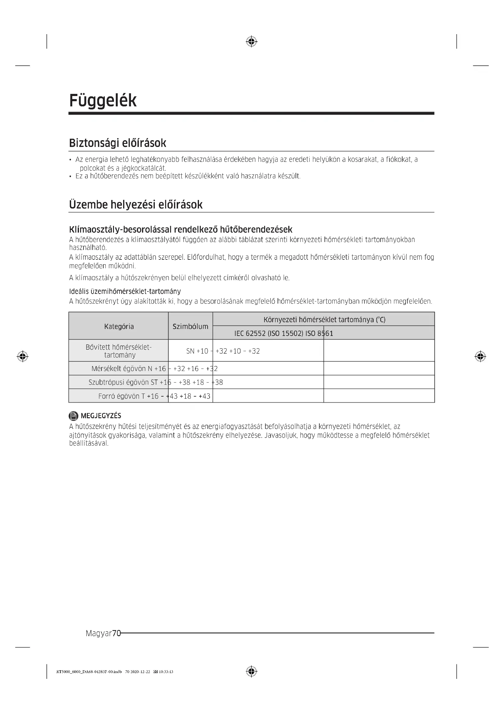 Bővített hőmérséklet- tartomány SN +10 – +32 +10 – +32 Mérsékelt égövön N +16 – +32 +16 – +32 Szubtrópusi égövön ST +16 – +38 +18 – +38 Forró égövön T +16 – +43 +18 – +43 MEGJEGYZÉS A hűtőszekrény hűtési teljesítményét és az energiafogyasztását befolyásolhatja a környezeti hőmérséklet, az ajtónyitások gyakorisága, valamint a hűtőszekrény elhelyezése. Javasoljuk, hogy működtesse a megfelelő hőmérséklet beállításával. RT5000_6000_DA68-04283F-00.indb 70 2020-12-22 10:33:43Magyar 71 Hőmérsékleti előírások Ajánlott hőmérséklet Optimális hőmérséklet-beállítás élelmiszerek tárolásához: