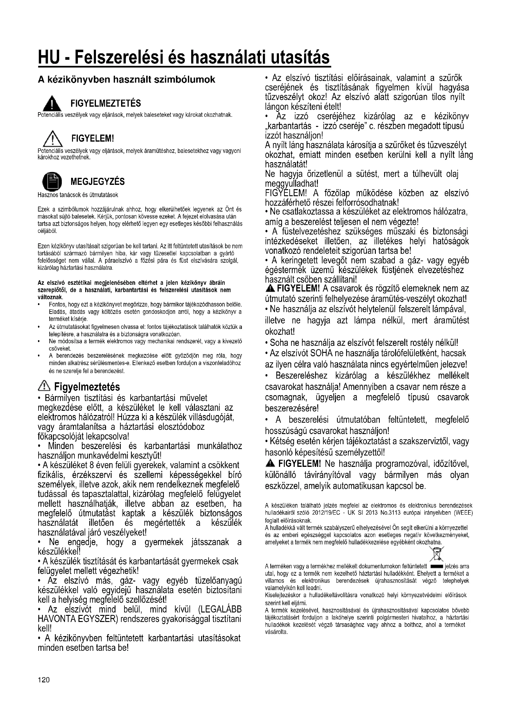 - Kétség esetén kérjen tájékoztatást a szakszerviztől, vagy hasonló képesítésű személyzettől! FIGYELEM! Ne használja programozóval, időzítővel, különálló távirányítóval vagy bármilyen más olyan eszközzel, amelyik automatikusan kapcsol be. A készüléken található jelzés megfelel az elektromos és elektronikus berendezések hulladékairól szóló 2012/19/EC - UK SI 2013 No.3113 európai irányelvben (WEEE) foglalt előírásoknak. A hulladékká vált termék szabályszerű elhelyezésével Ön segít elkerülni a környezettel és az emberi egészséggel kapcsolatos azon esetleges negatív következményeket, amelyeket a termék nem megfelelő hulladékkezelése egyébként okozhatna. A terméken vagy a termékhez mellékelt dokumentumokon feltüntetett jelzés arra utal, hogy ez a termék nem kezelhető háztartási hulladékként. Ehelyett a terméket a villamos és elektronikus berendezések újrahasznosítását végző telephelyek valamelyikén kell leadni. Kiselejtezéskor a hulladékeltávolításra vonatkozó helyi környezetvédelmi előírások szerint kell eljárni. A termék kezelésével, hasznosításával és újrahasznosításával kapcsolatos bővebb tájékoztatásért forduljon a lakóhelye szerinti polgármesteri hivatalhoz, a háztartási hulladékok kezelését végző társasághoz vagy ahhoz a bolthoz, ahol a terméket vásárolta.121 A berendezést a következő szabványoknak megfelelően tervezték, gyártották, és ellenőrizték:
