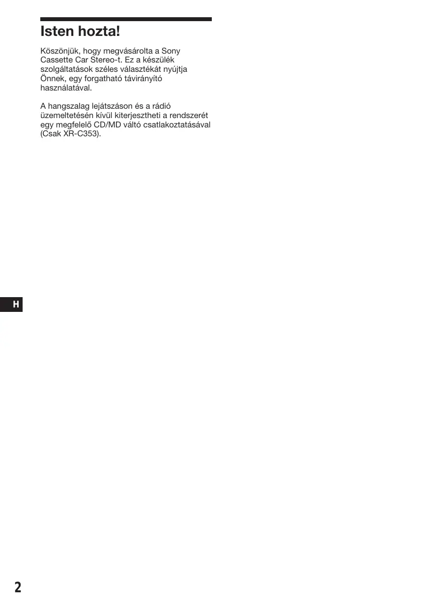 Isten hozta! Köszönjük, hogy megvásárolta a Sony Cassette Car Stereo-t. Ez a készülék szolgáltatások széles választékát nyújtja Önnek, egy forgatható távirányító használatával. A hangszalag lejátszáson és a rádió üzemeltetésén kívül kiterjesztheti a rendszerét egy megfelelő CD/MD váltó csatlakoztatásával (Csak XR-C353).