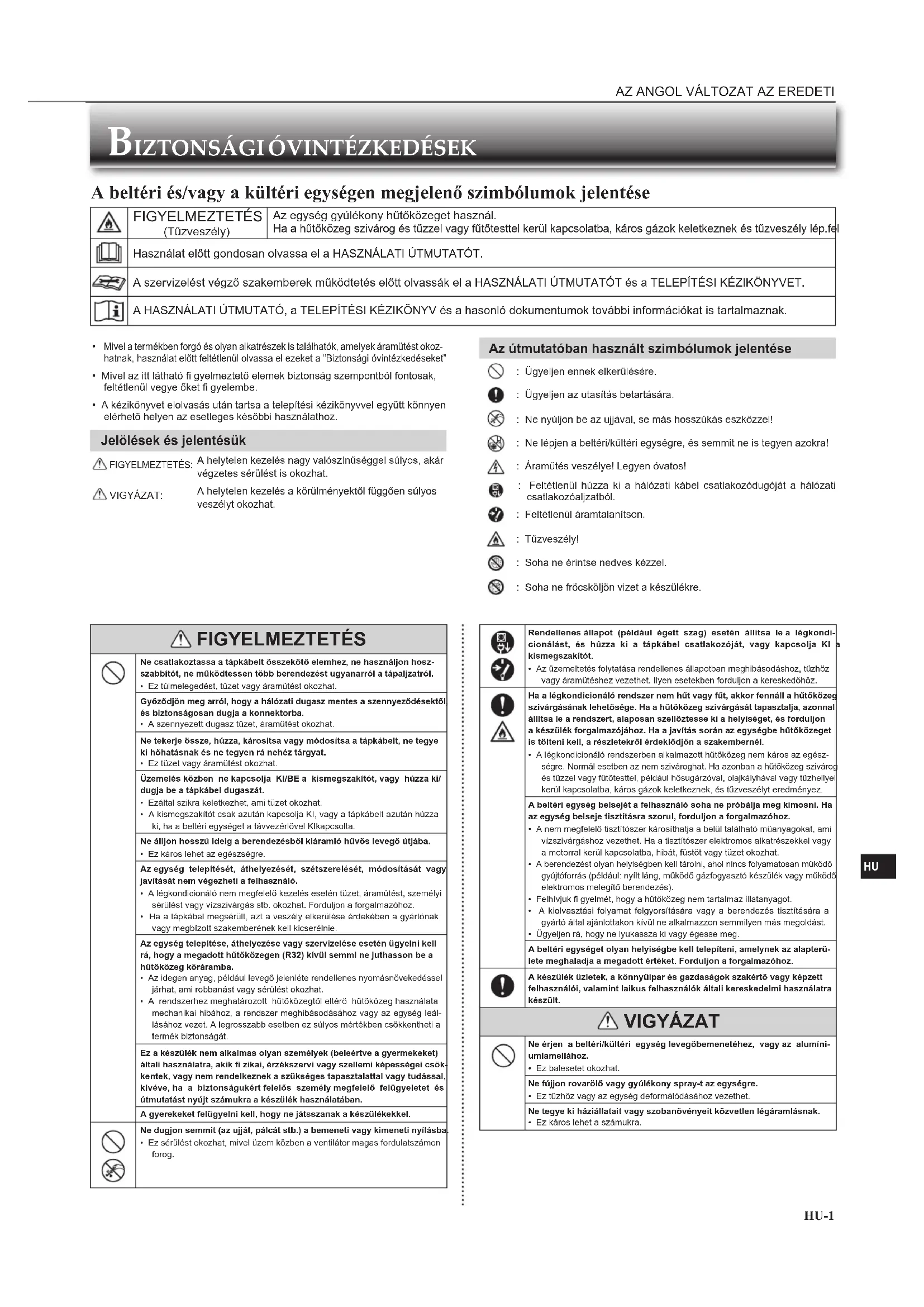 FIGYELMEZTETÉS Ne csatlakoztassa a tápkábelt összekötő elemhez, ne használjon hosz-szabbítót, ne működtessen több berendezést ugyanarról a tápaljzatról.• Ez túlmelegedést, tüzet vagy áramütést okozhat.Győződjön meg arról, hogy a hálózati dugasz mentes a szennyeződésektől, és biztonságosan dugja a konnektorba.• A szennyezett dugasz tüzet, áramütést okozhat.Ne tekerje össze, húzza, károsítsa vagy módosítsa a tápkábelt, ne tegye ki hőhatásnak és ne tegyen rá nehéz tárgyat.• Ez tüzet vagy áramütést okozhat.Üzemelés közben ne kapcsolja KI/BE a kismegszakítót, vagy húzza ki/dugja be a tápkábel dugaszát.• Ezáltal szikra keletkezhet, ami tüzet okozhat.• A kismegszakítót csak azután kapcsolja KI, vagy a tápkábelt azután húzza ki, ha a beltéri egységet a távvezérlővel KIkapcsolta. Ne álljon hosszú ideig a berendezésből kiáramló hűvös levegő útjába.• Ez káros lehet az egészségre.Az egység telepítését, áthelyezését, szétszerelését, módosítását vagy javítását nem végezheti a felhasználó.• A légkondicionáló nem megfelelő kezelés esetén tüzet, áramütést, személyi sérülést vagy vízszivárgás stb. okozhat. Forduljon a forgalmazóhoz.• Ha a tápkábel megsérült, azt a veszély elkerülése érdekében a gyártónak vagy megbízott szakemberének kell kicserélnie.Az egység telepítése, áthelyezése vagy szervizelése esetén ügyelni kell rá, hogy a megadott hűtőközegen (R32) kívül semmi ne juthasson be a hűtőközeg köráramba.• Az idegen anyag, például levegő jelenléte rendellenes nyomásnövekedéssel járhat, ami robbanást vagy sérülést okozhat.• A rendszerhez meghatározott hűtőközegtől eltérő hűtőközeg használata mechanikai hibához, a rendszer meghibásodásához vagy az egység leál-lásához vezet. A legrosszabb esetben ez súlyos mértékben csökkentheti a termék biztonságát.Ez a készülék nem alkalmas olyan személyek (beleértve a gyermekeket) általi használatra, akik fi zikai, érzékszervi vagy szellemi képességei csök-kentek, vagy nem rendelkeznek a szükséges tapasztalattal vagy tudással, kivéve, ha a biztonságukért felelős személy megfelelő felügyeletet és útmutatást nyújt számukra a készülék használatában.A gyerekeket felügyelni kell, hogy ne játsszanak a készülékekkel. Ne dugjon semmit (az ujját, pálcát stb.) a bemeneti vagy kimeneti nyílásba.• Ez sérülést okozhat, mivel üzem közben a ventilátor magas fordulatszámon forog. Mivel a termékben forgó és olyan alkatrészek is találhatók, amelyek áramütést okoz-hatnak, használat előtt feltétlenül olvassa el ezeket a “Biztonsági óvintézkedéseket”